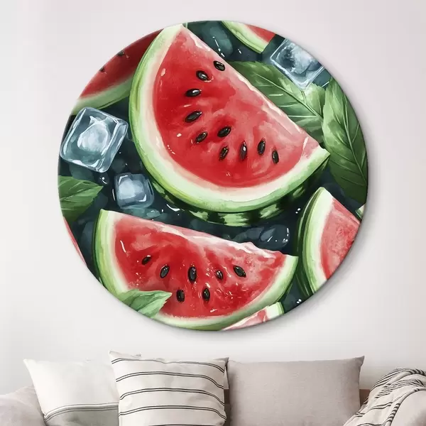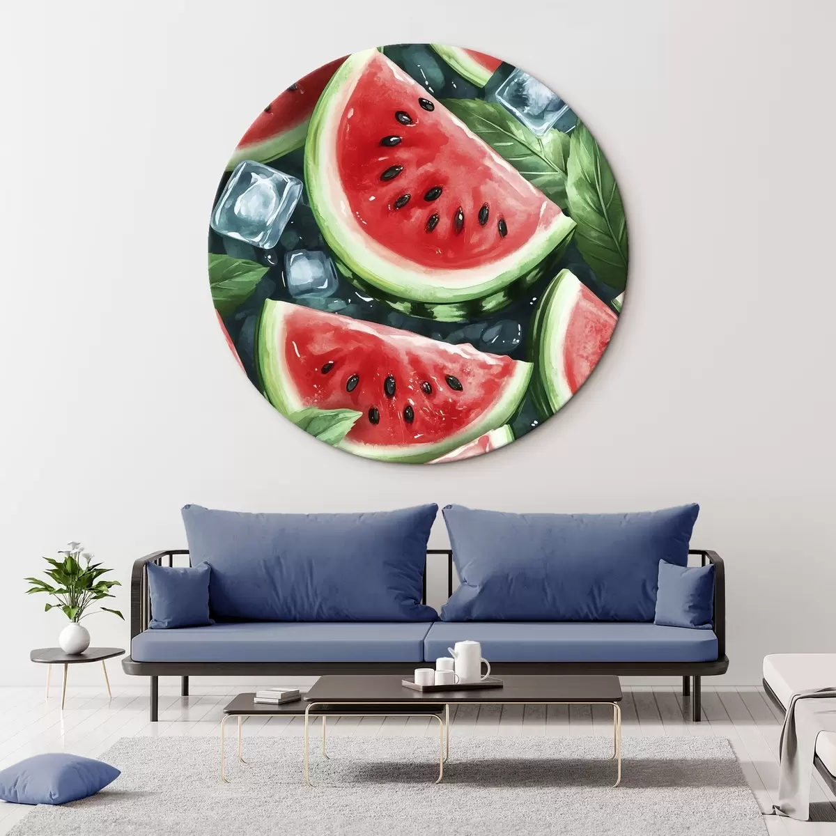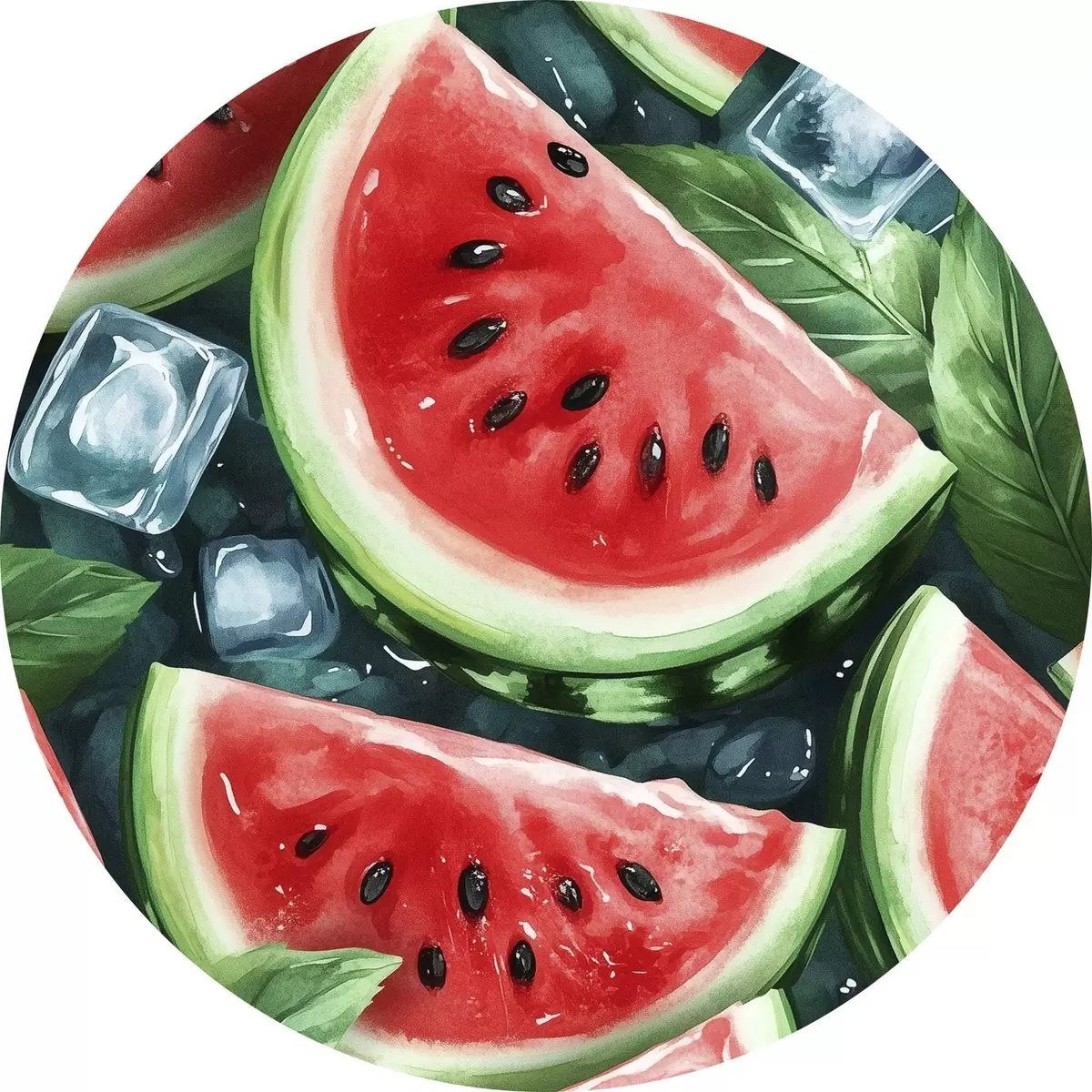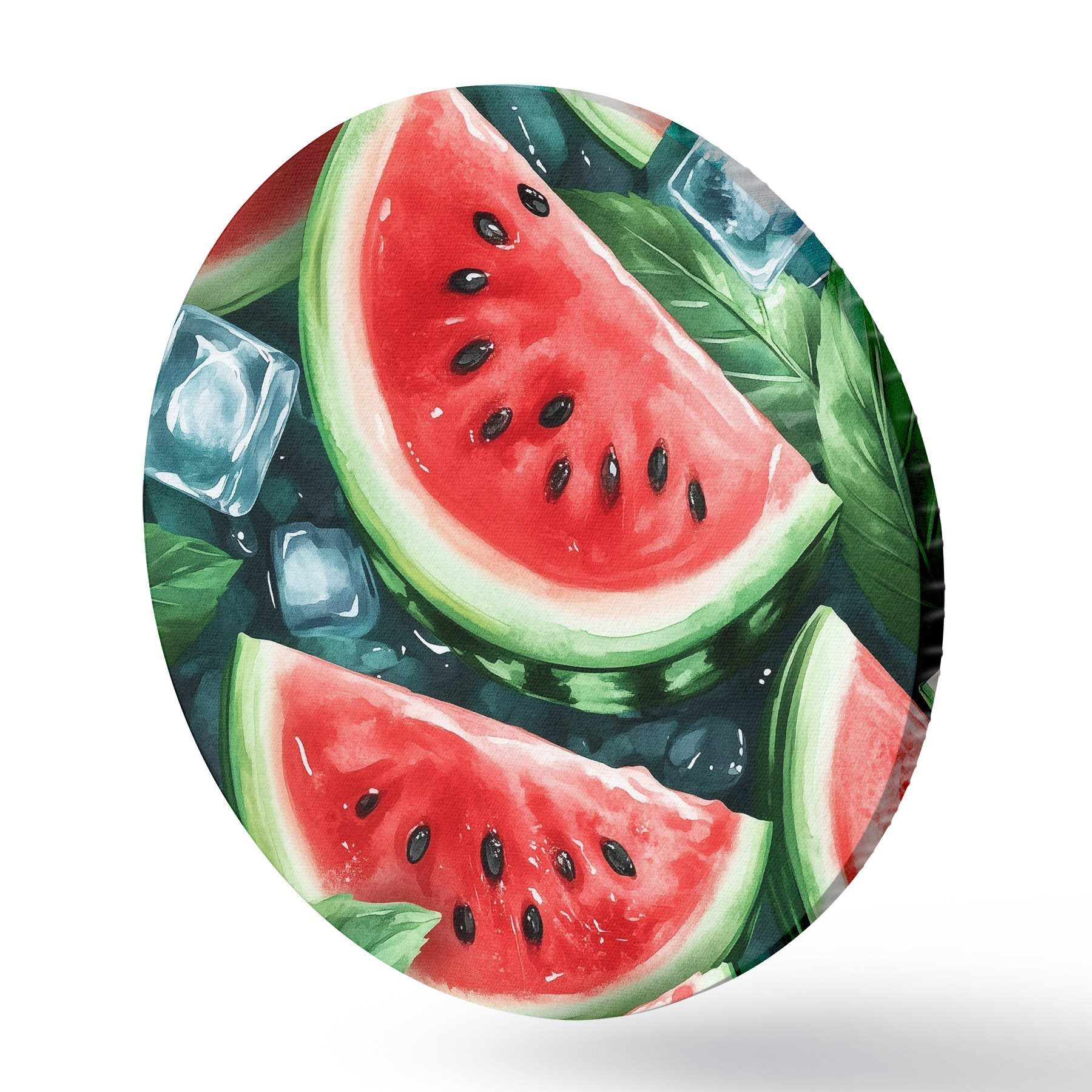 Runde Gemälde Wassermelonenscheiben mit Eiswürfeln und Minze, Aquarellstil r43880