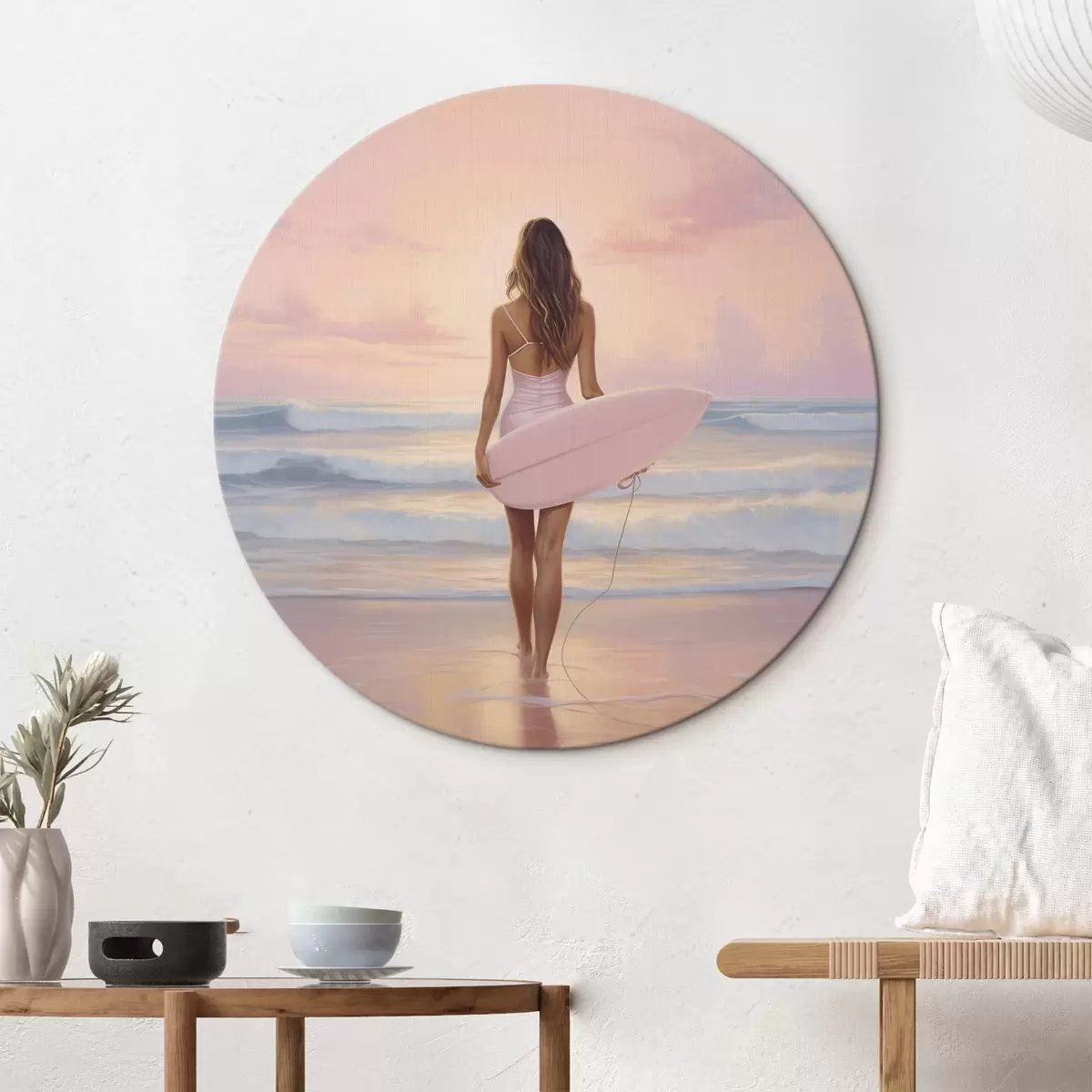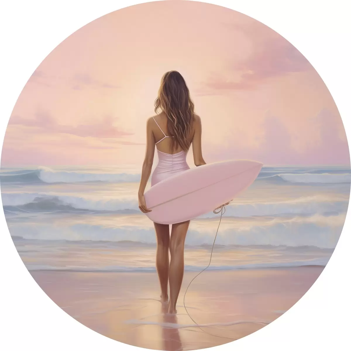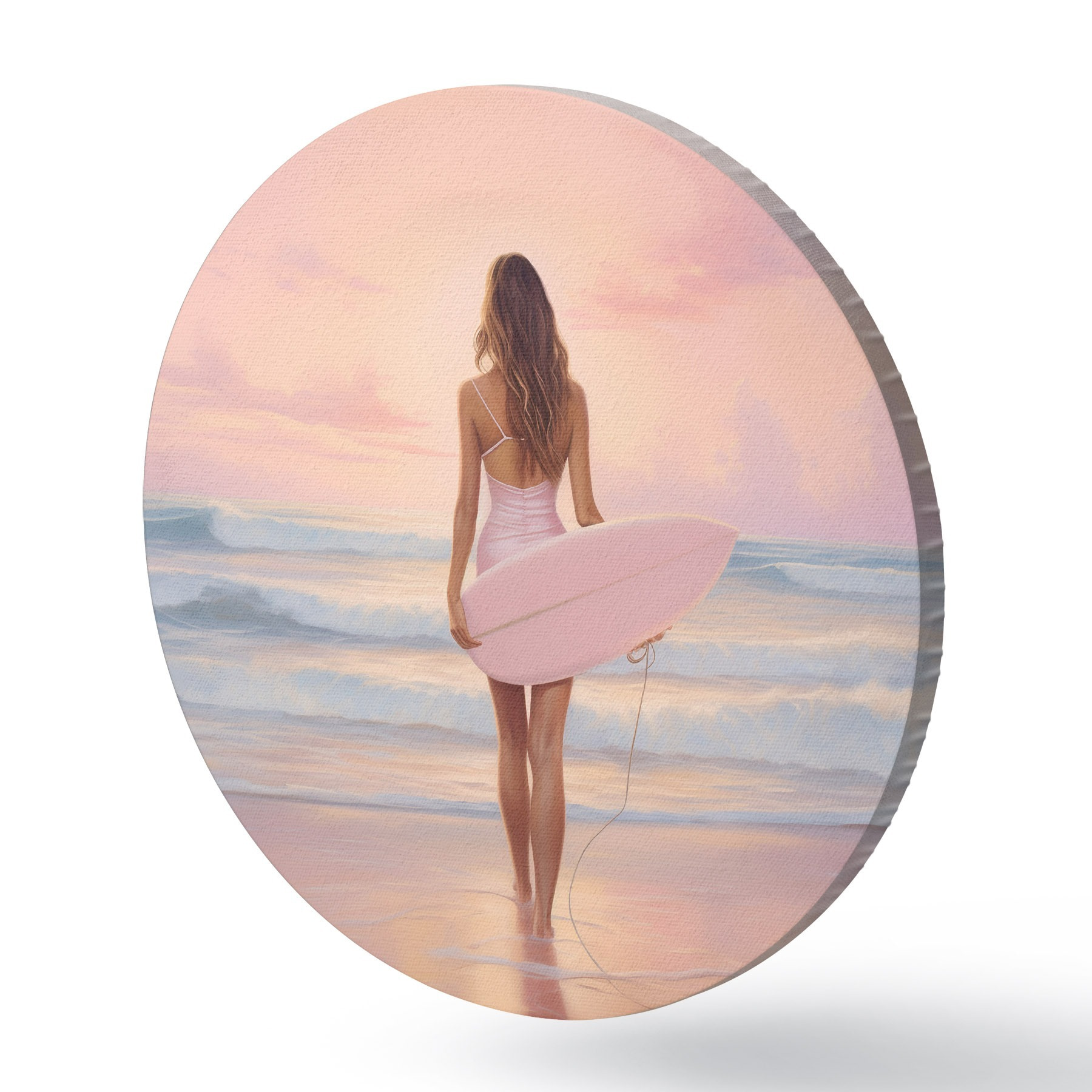 Runde Gemälde Mädchen mit Surfbrett auf dem Ozean Strand, Sonnenuntergang, Acryl-Stil Zeichnung r43881