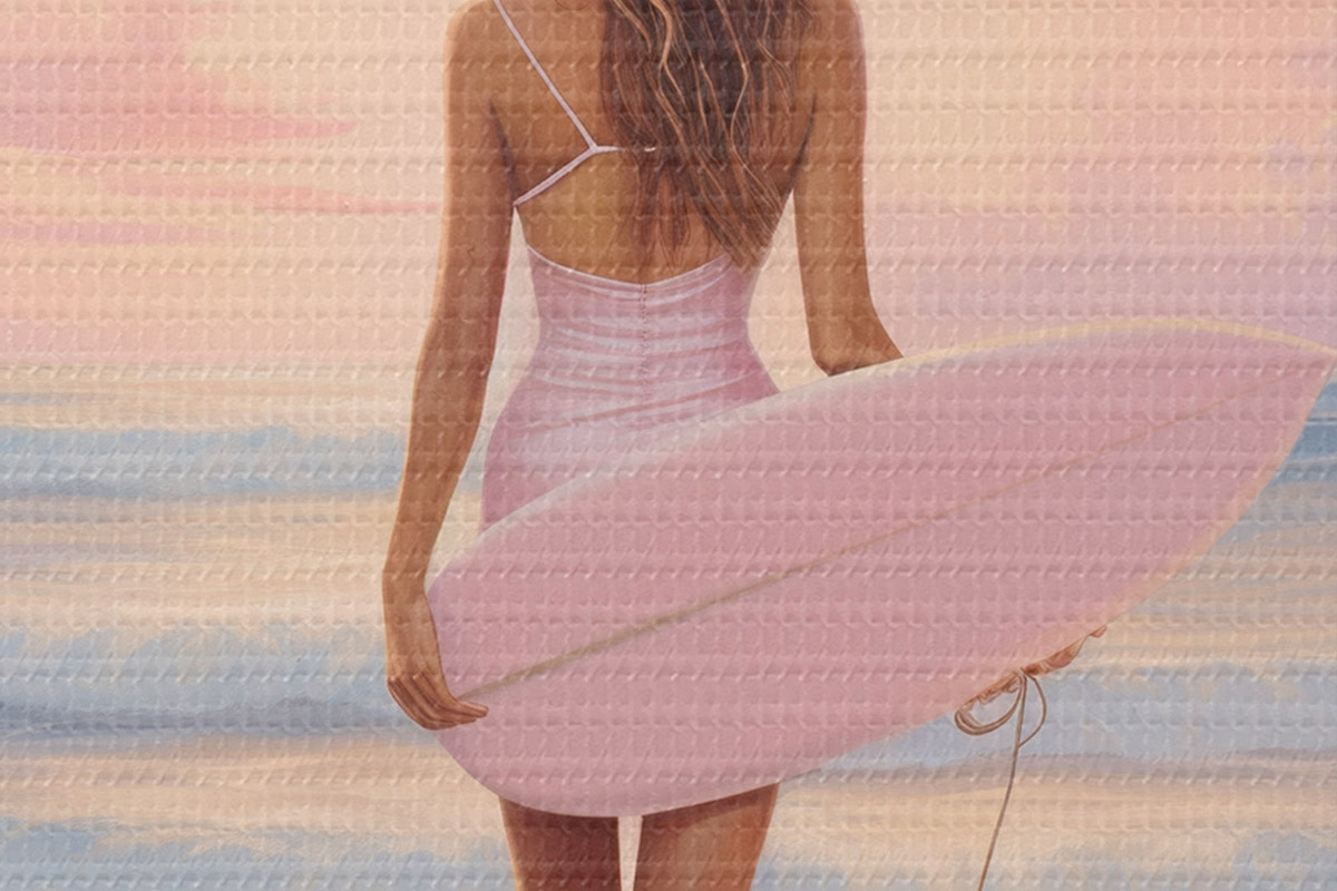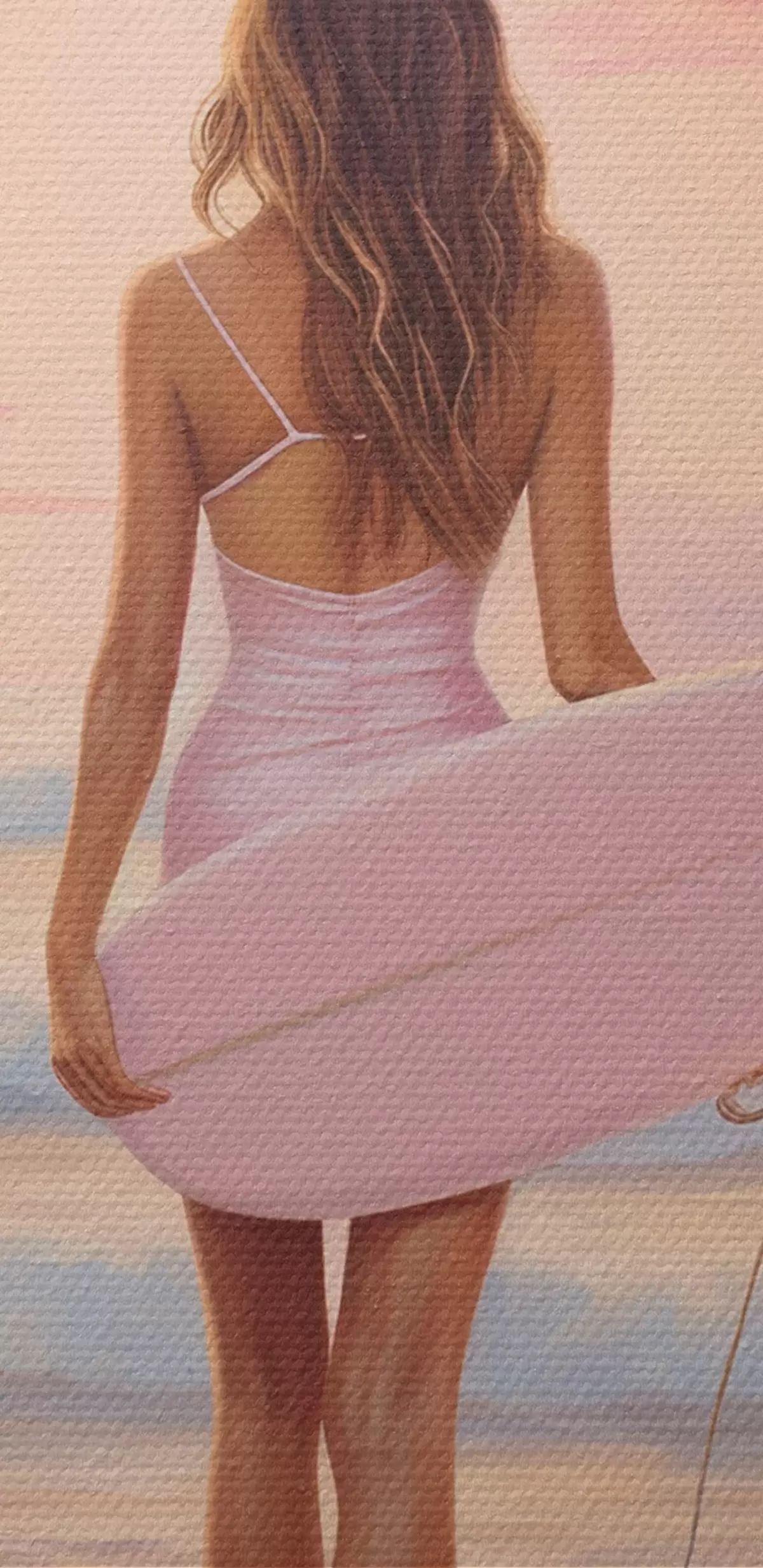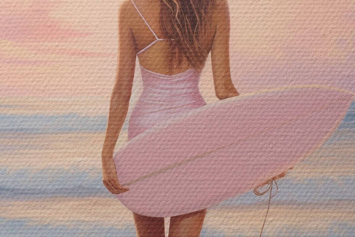 Bild Mädchen mit Surfbrett auf dem Ozean Strand, Sonnenuntergang, Acryl-Stil Zeichnung Nr r43881