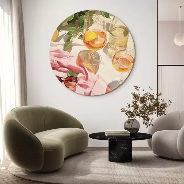 Runde Gemälde Sommerzeit, Gläser mit Sekt, grüne Pflanzen, warme Farben r43885