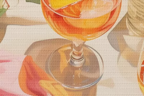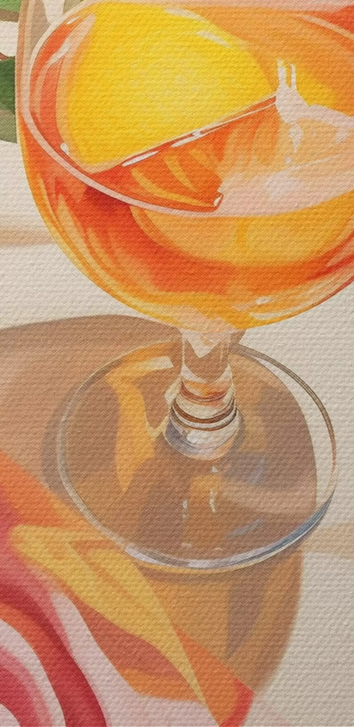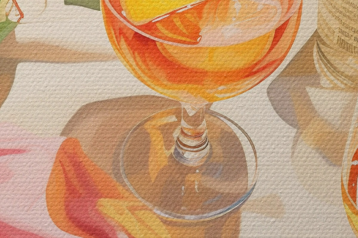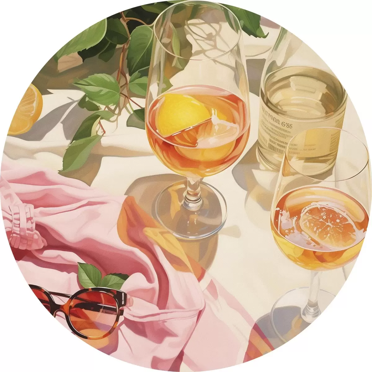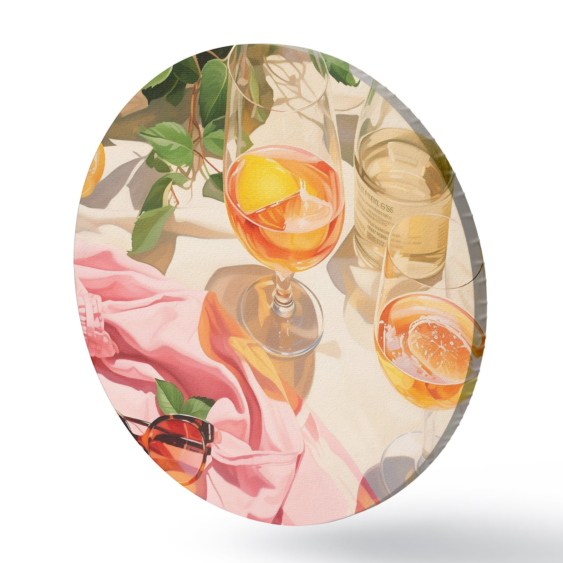 Runde Gemälde Sommerzeit, Gläser mit Sekt, grüne Pflanzen, warme Farben r43885