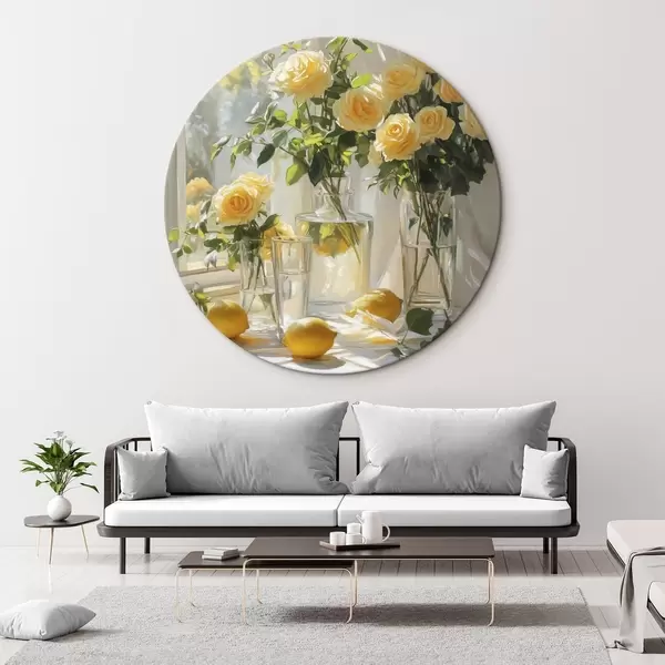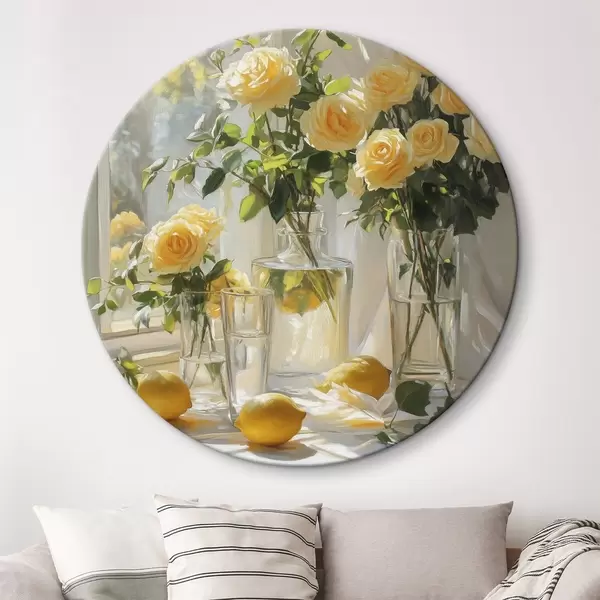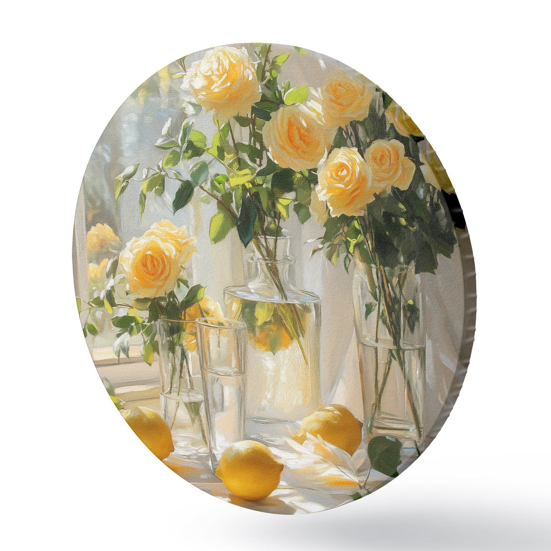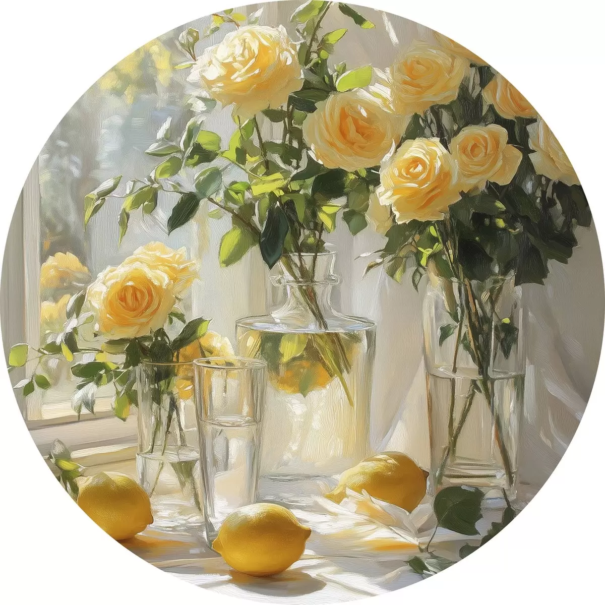 Runde Gemälde Rosen in Vasen, Ölgemälde, sanftes Sonnenlicht, Zitronen, Frühling r43887