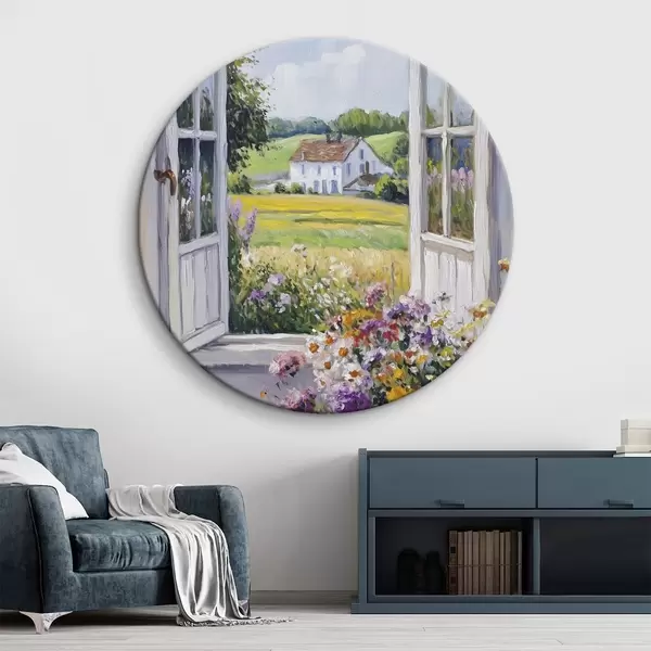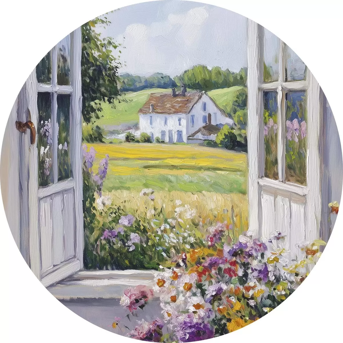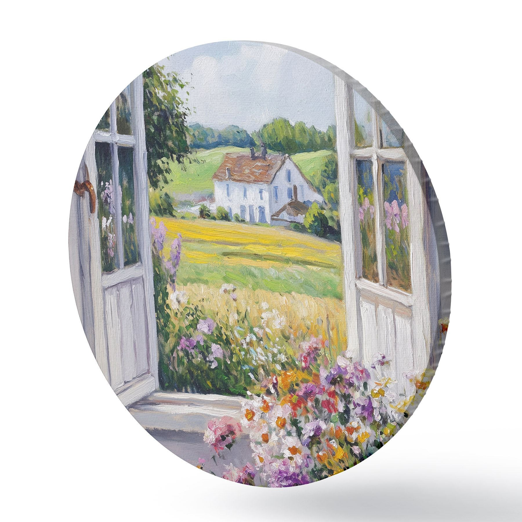 Runde Gemälde Dorflandschaften im Holzfenster, Blumen, Felder, Öl-Stil, Bauernhaus r43888