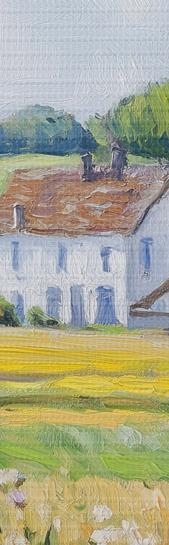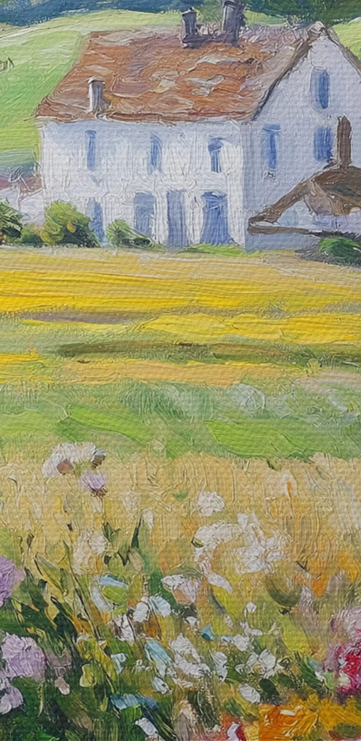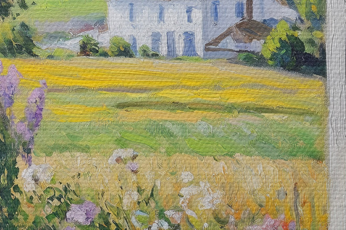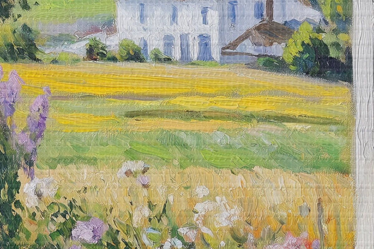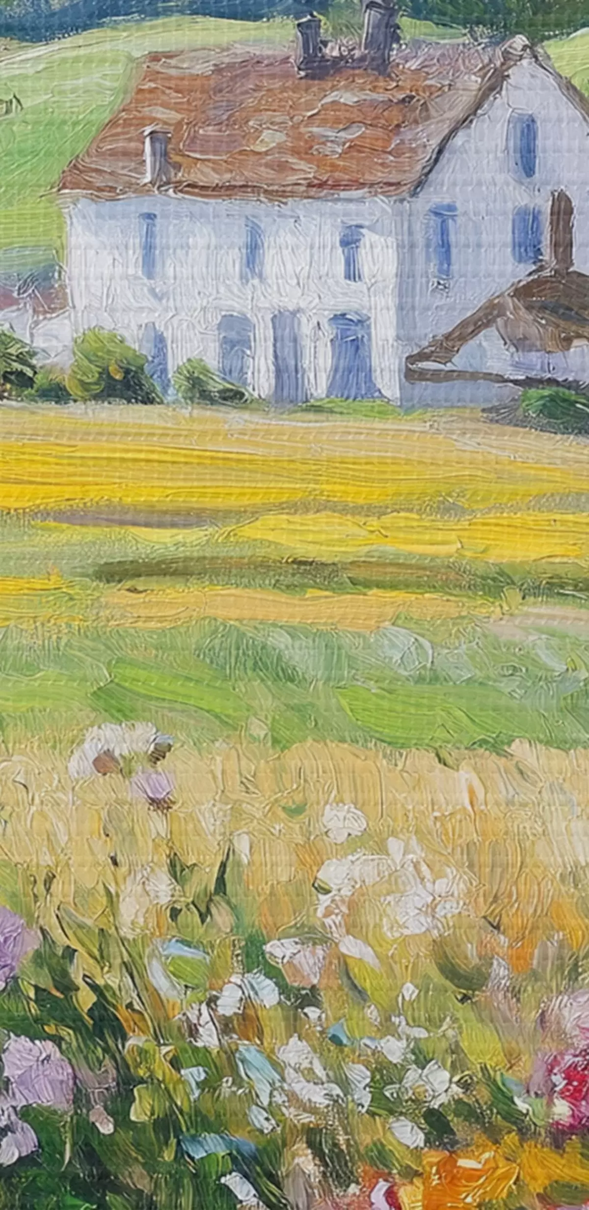 Bild Dorflandschaften im Holzfenster, Blumen, Felder, Öl-Stil, Bauernhaus Nr r43888