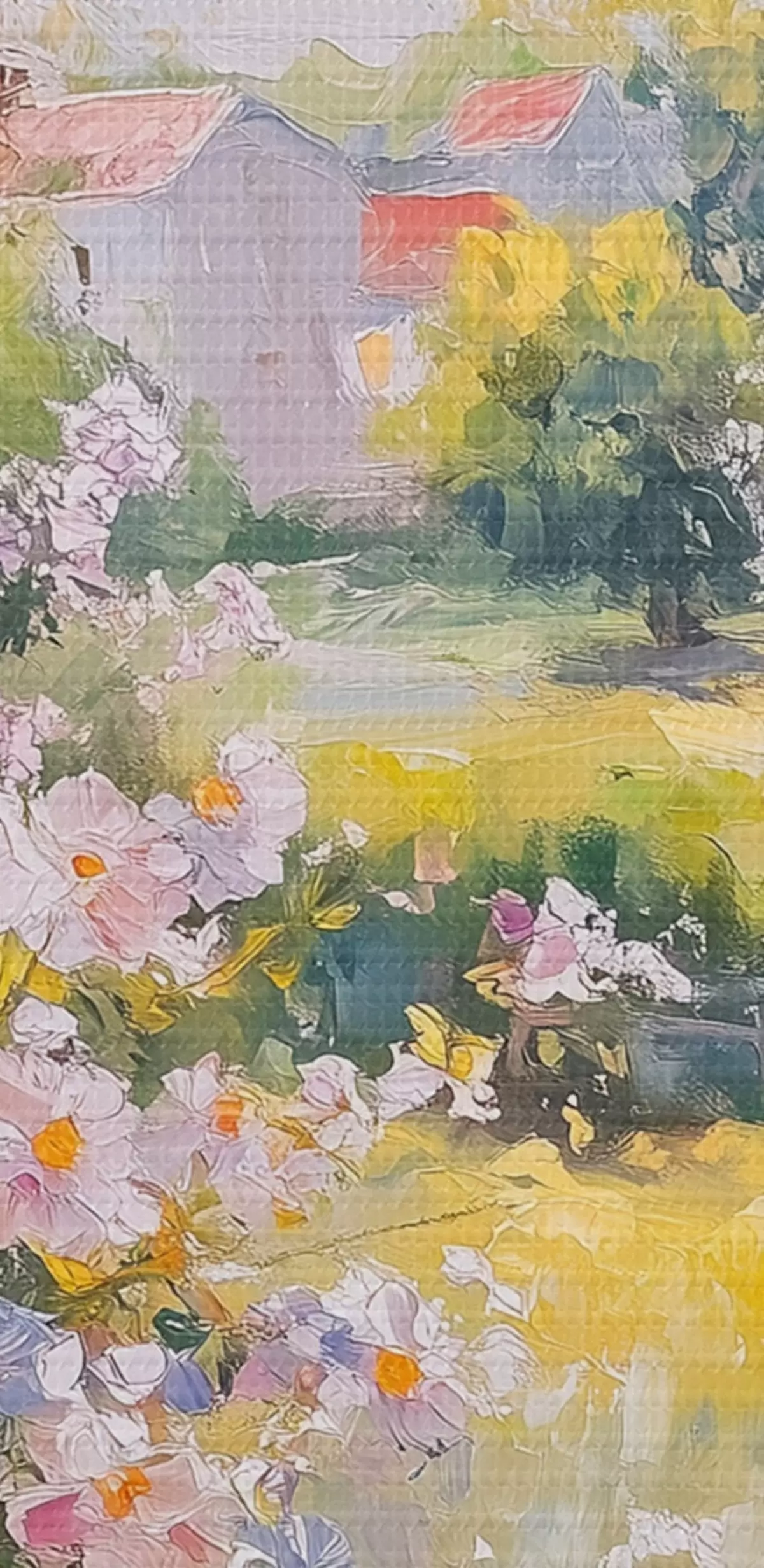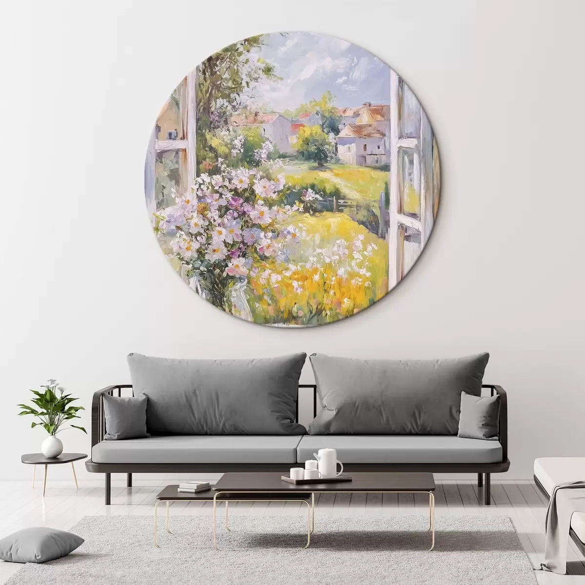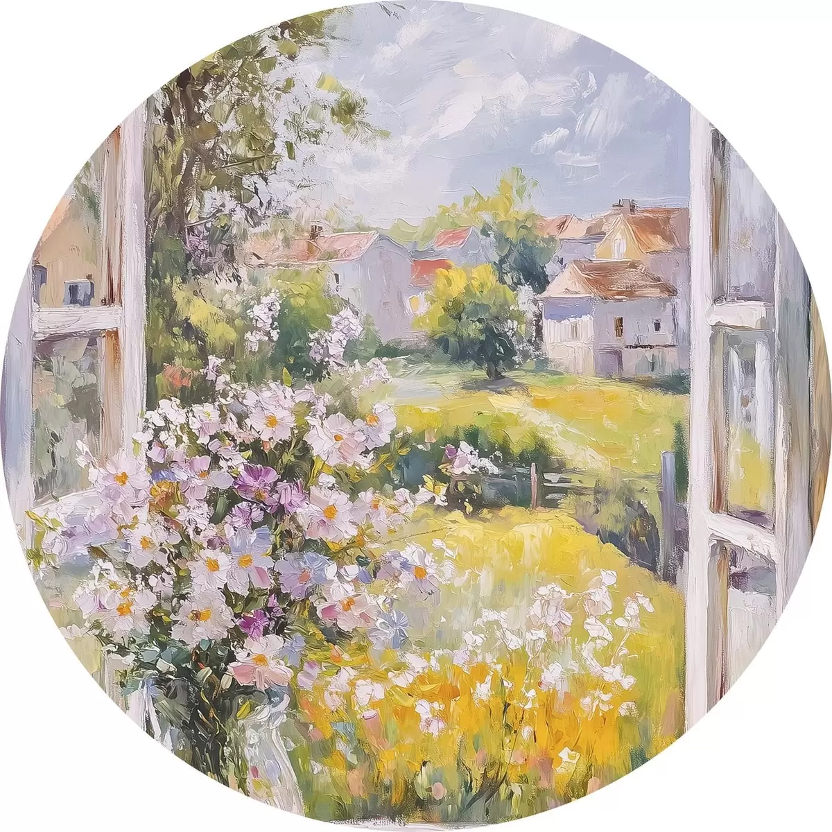 Runde Gemälde Sommer auf dem Dorf, rustikal, Ölzeichnung, Blumen in Vase r43889