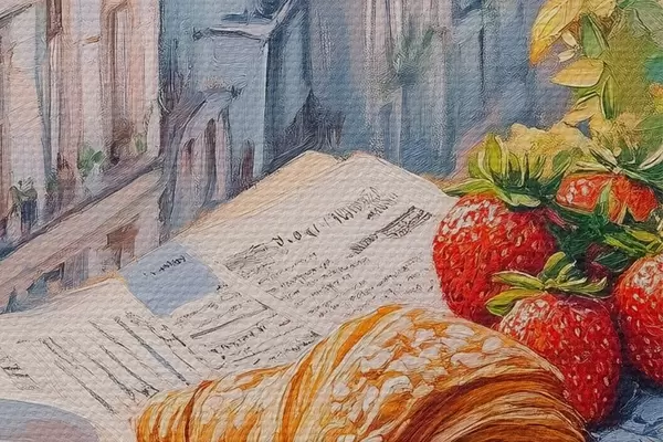 Runde Gemälde Sonnenaufgang auf dem Balkon in Paris, Eiffelturm, Erdbeeren, Kaffee, Tagebuch r43890