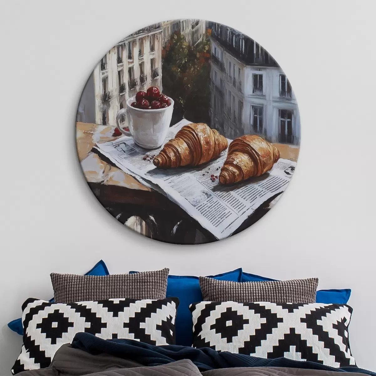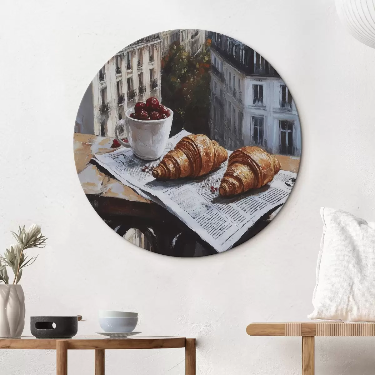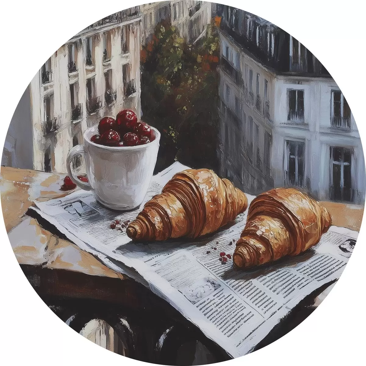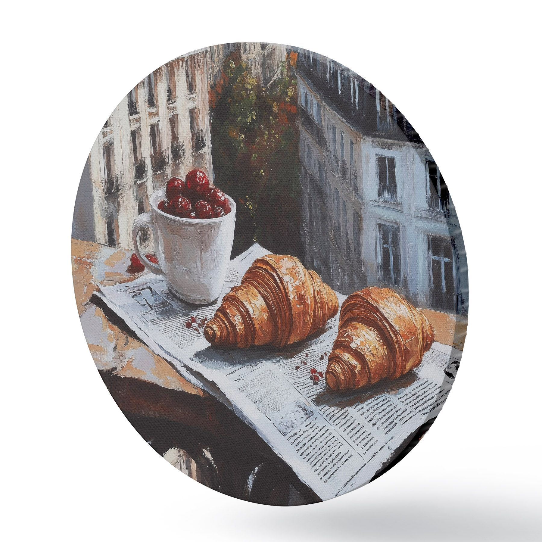 Runde Gemälde Pariser Morgen, Kaffee mit Croissants, Stadtansicht, Zeichnung in Öl r43892