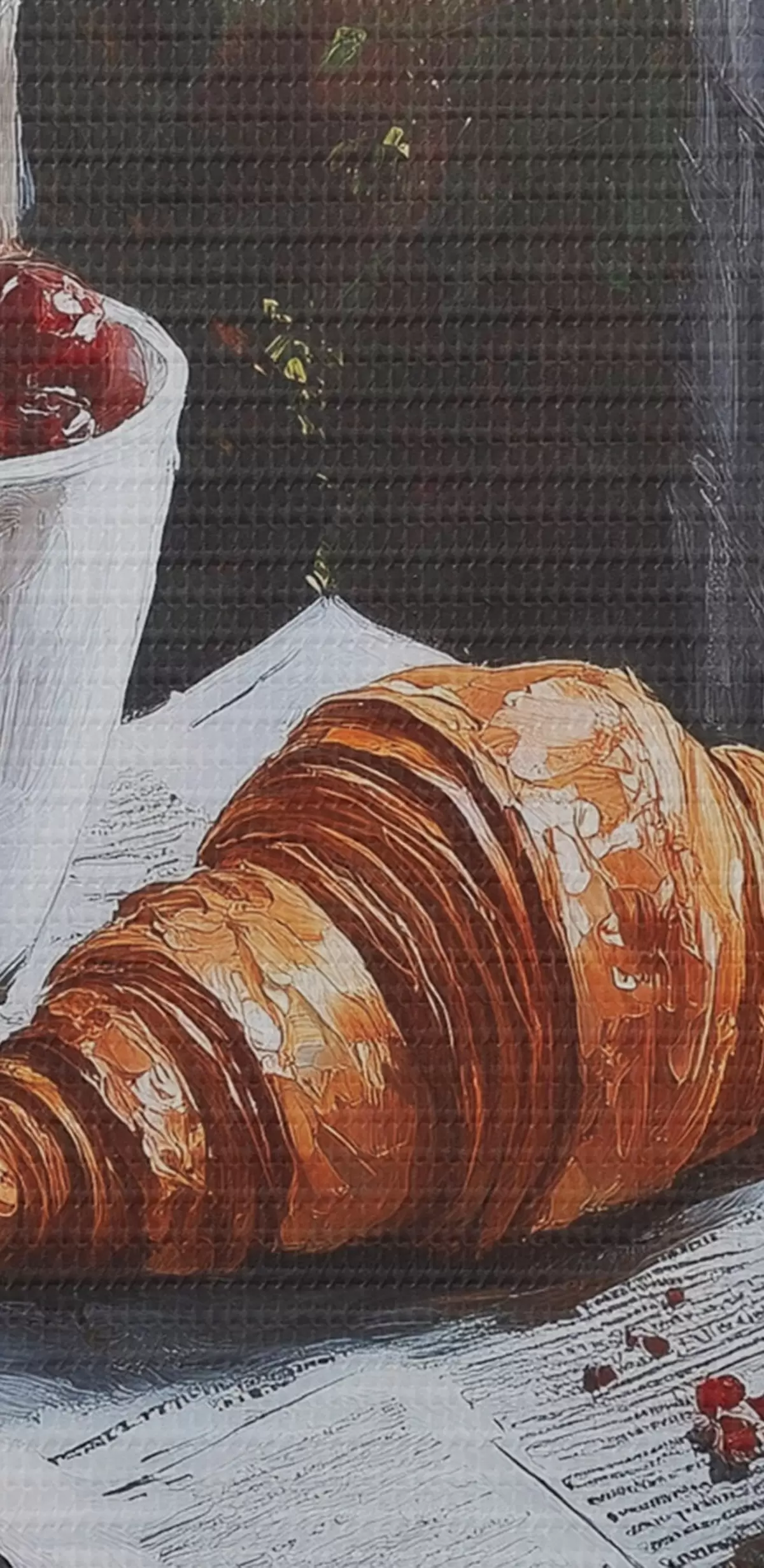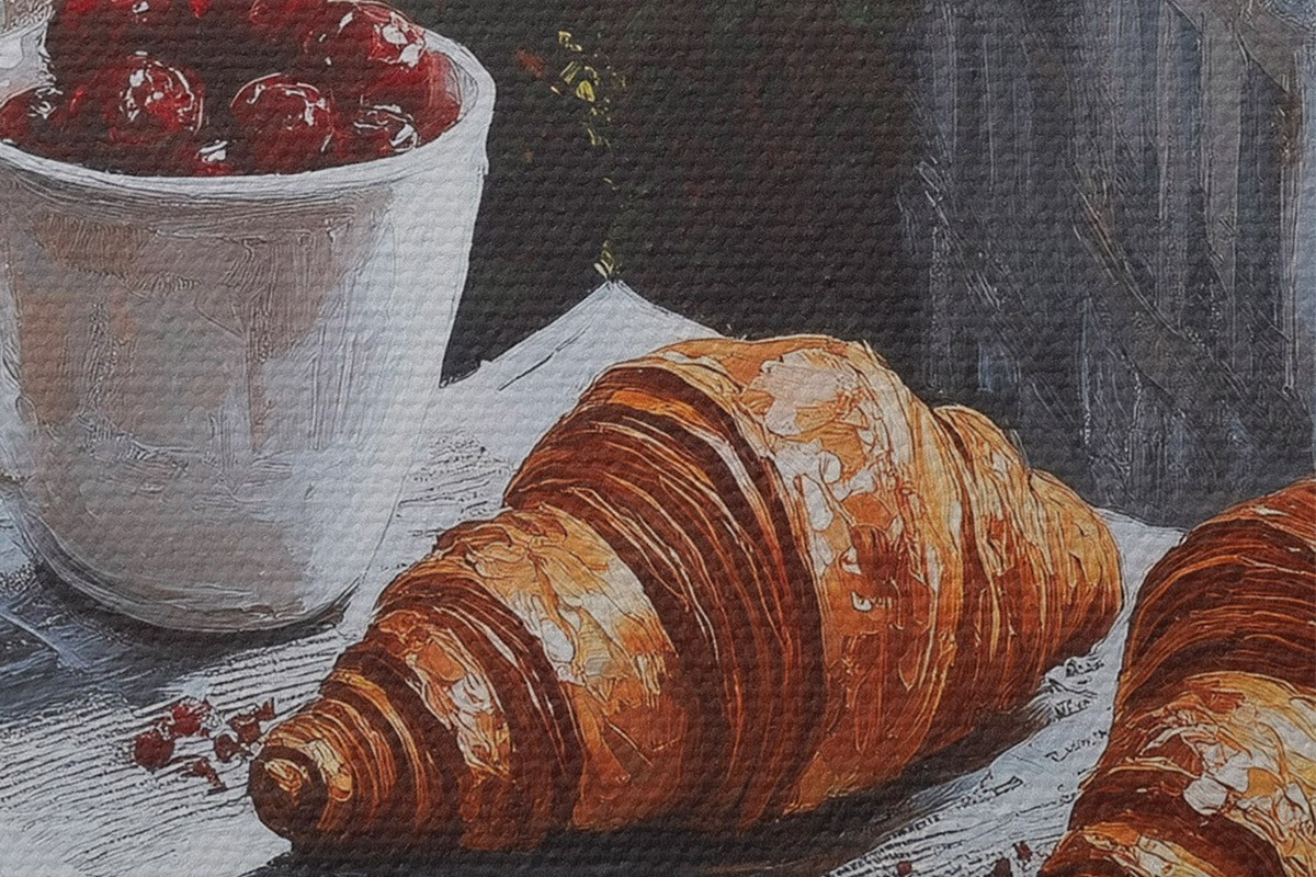 Bild Pariser Morgen, Kaffee mit Croissants, Stadtansicht, Zeichnung in Öl Nr r43892
