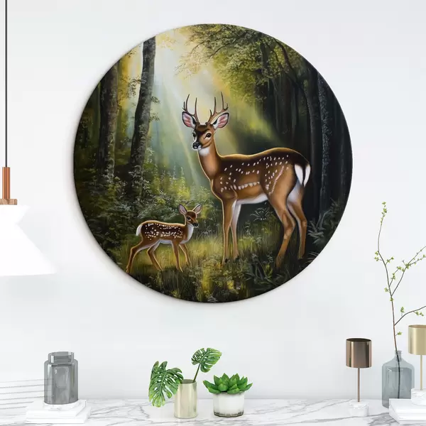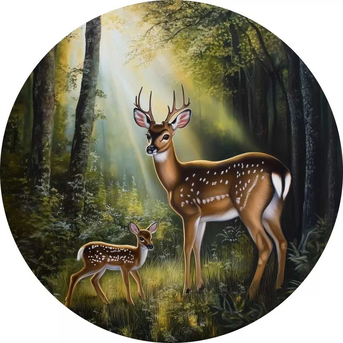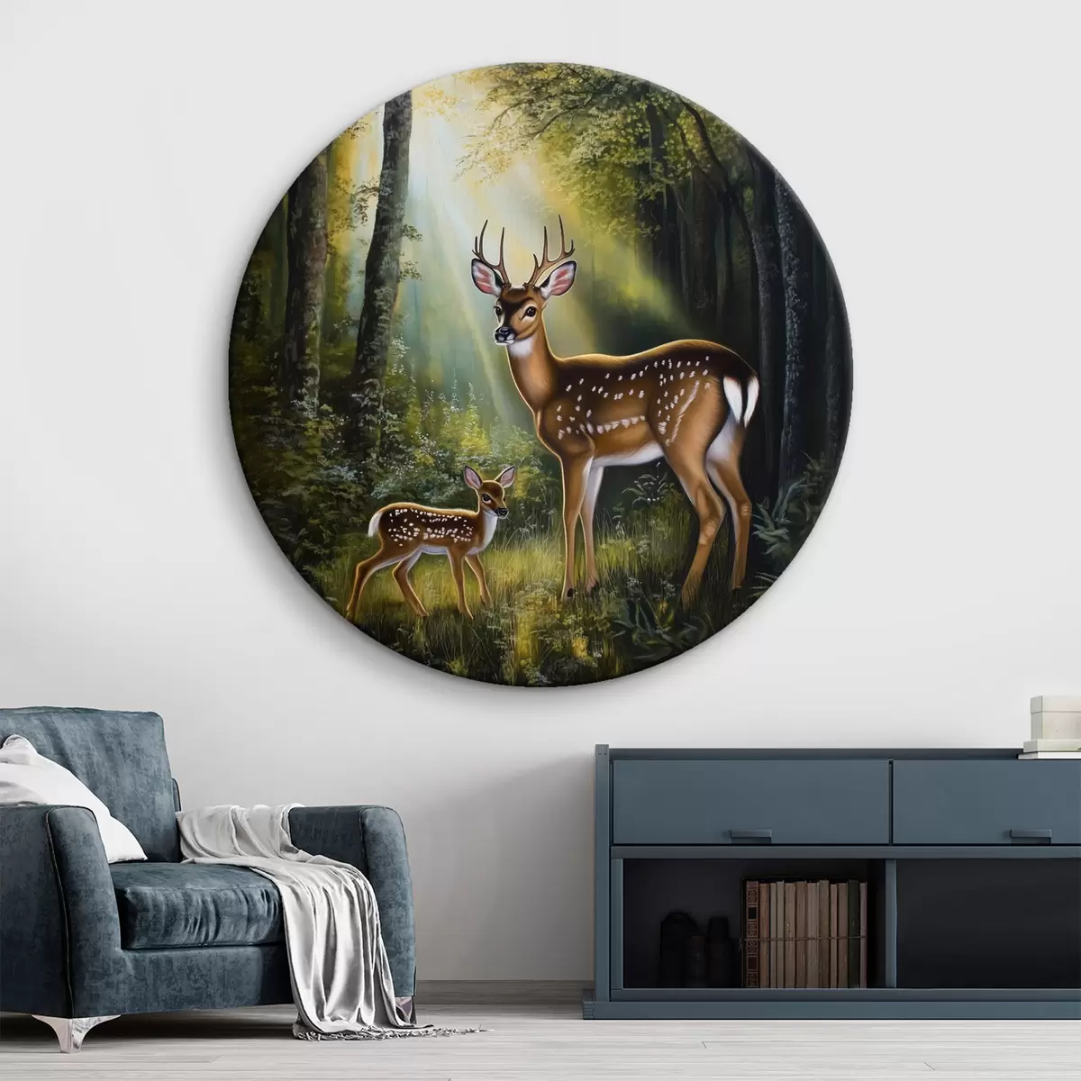Runde Gemälde Hirsch und Rehkitz im Wald r43915