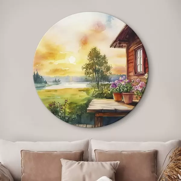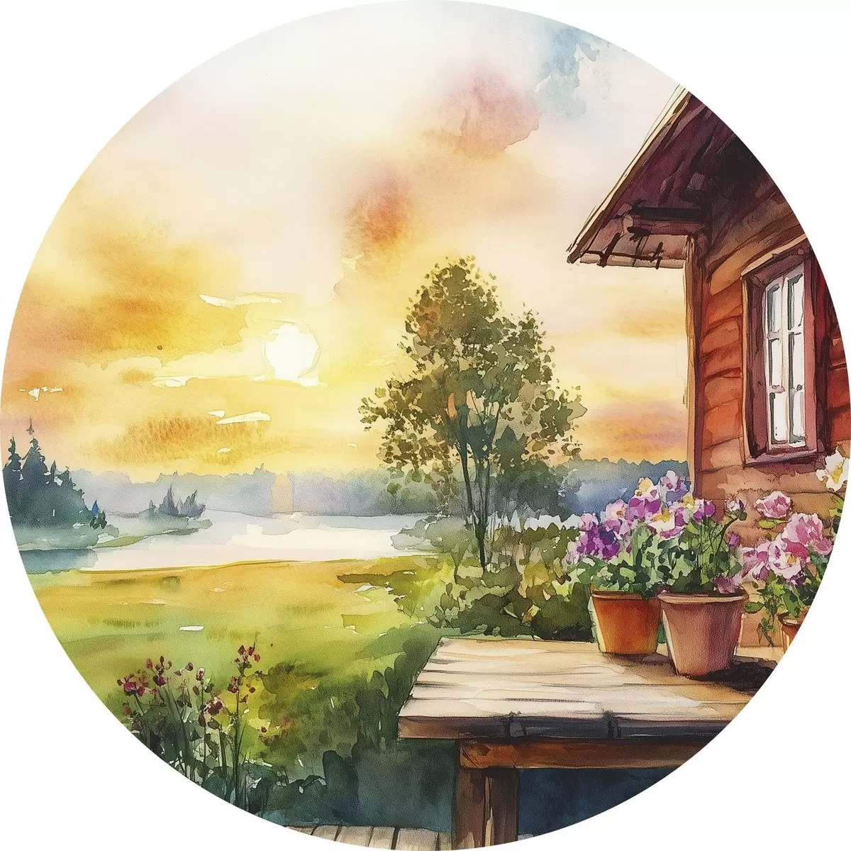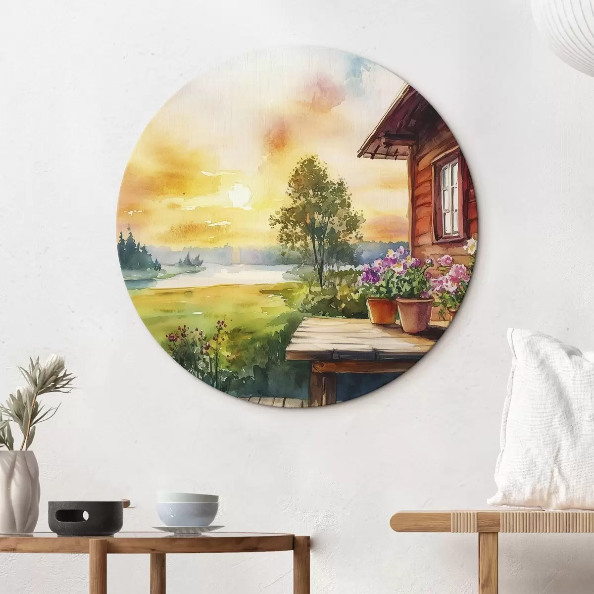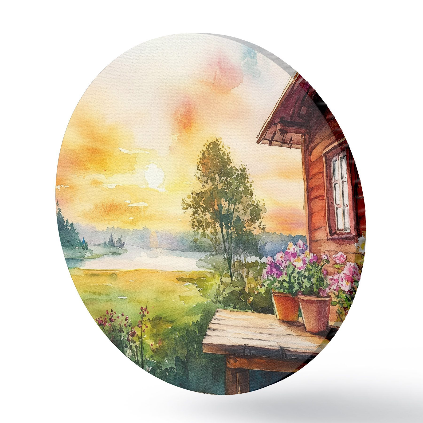 Runde Gemälde Farben des Sonnenuntergangs, Bauernhaus, Aquarellstil, rustikal, Sommerblumen r44017