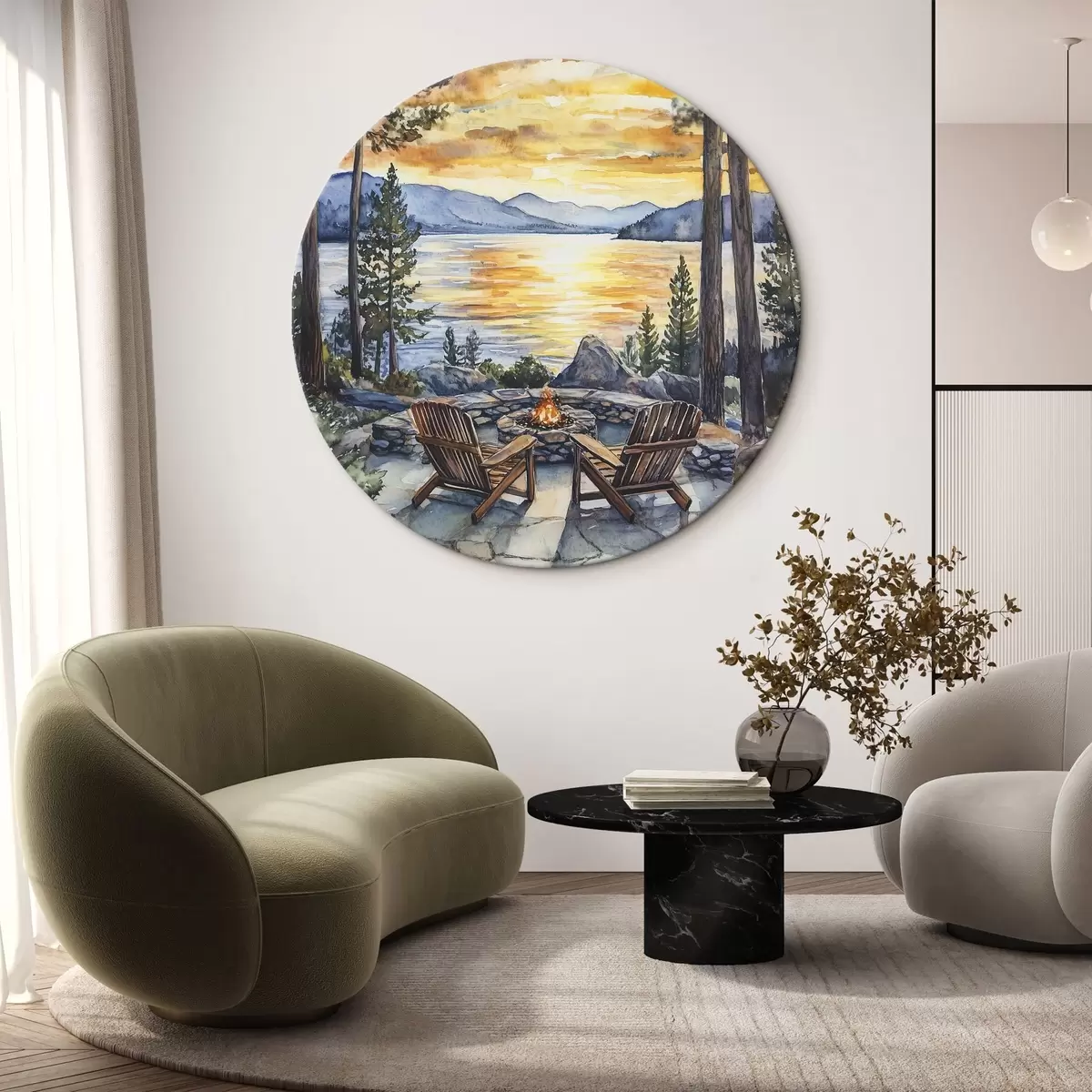 Runde Gemälde See mit Bergen auf den Sonnenuntergang, Reisen, gemütlichen Kamin, Aquarell r44018