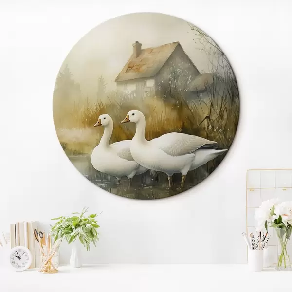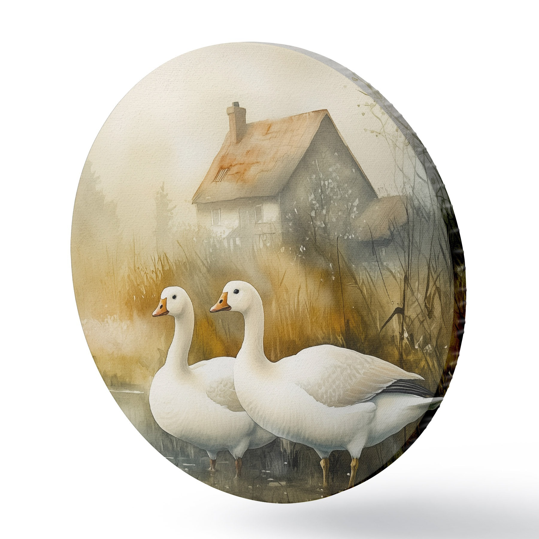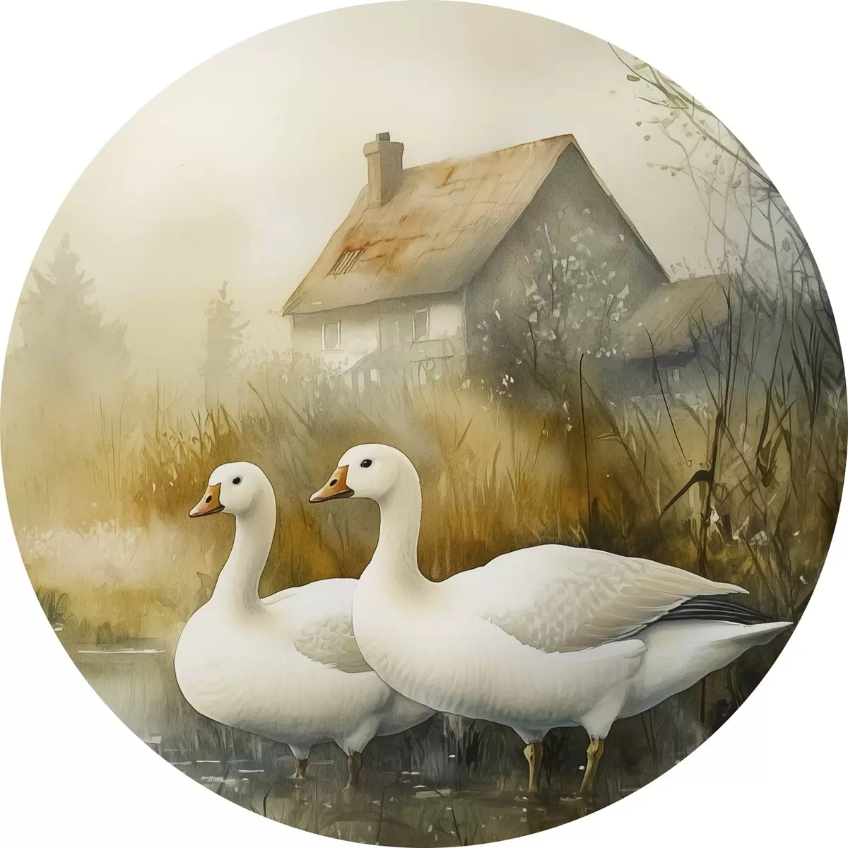 Runde Gemälde Gänse im See in der Nähe des Bauernhauses, rustikal, Aquarell-Stil r44022