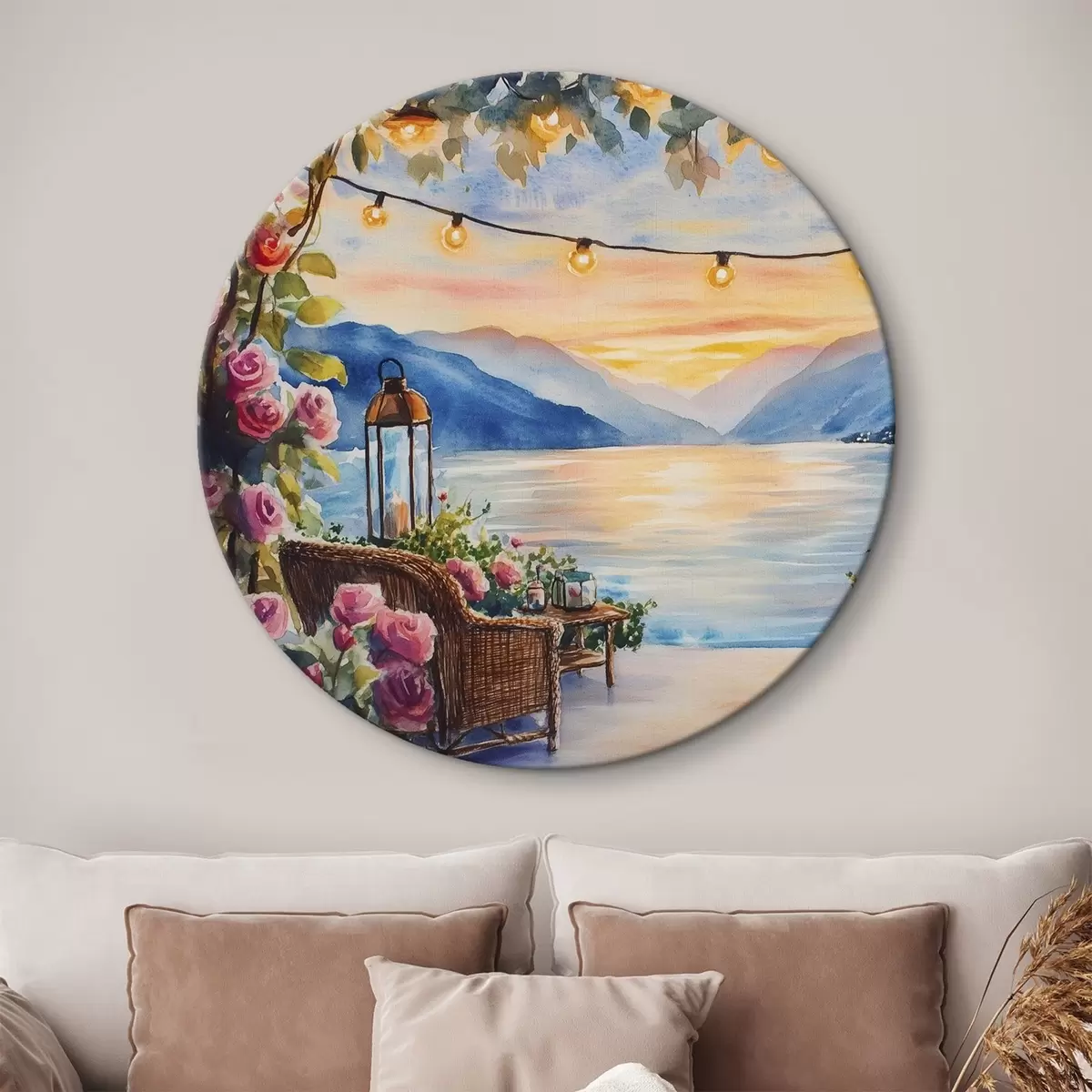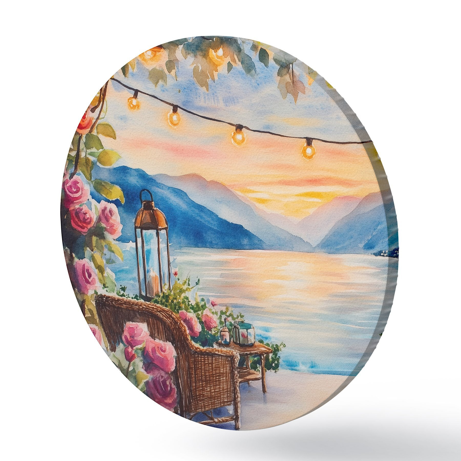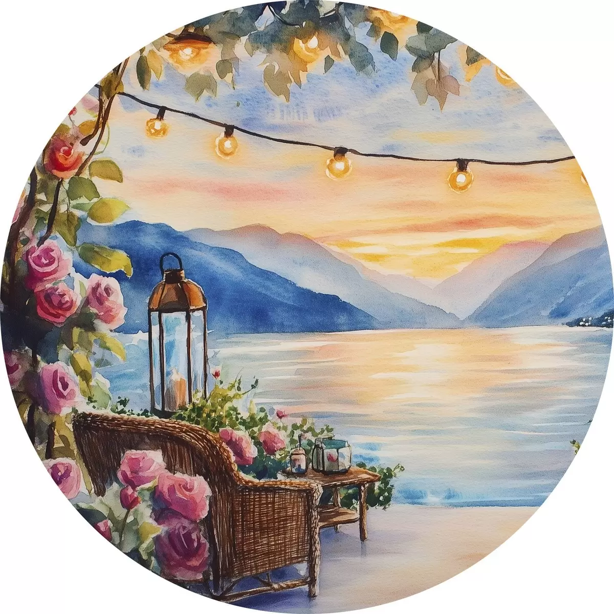 Runde Gemälde Schöner Sonnenuntergang in den Bergen, See, Rosen, Boho-Stil r44025