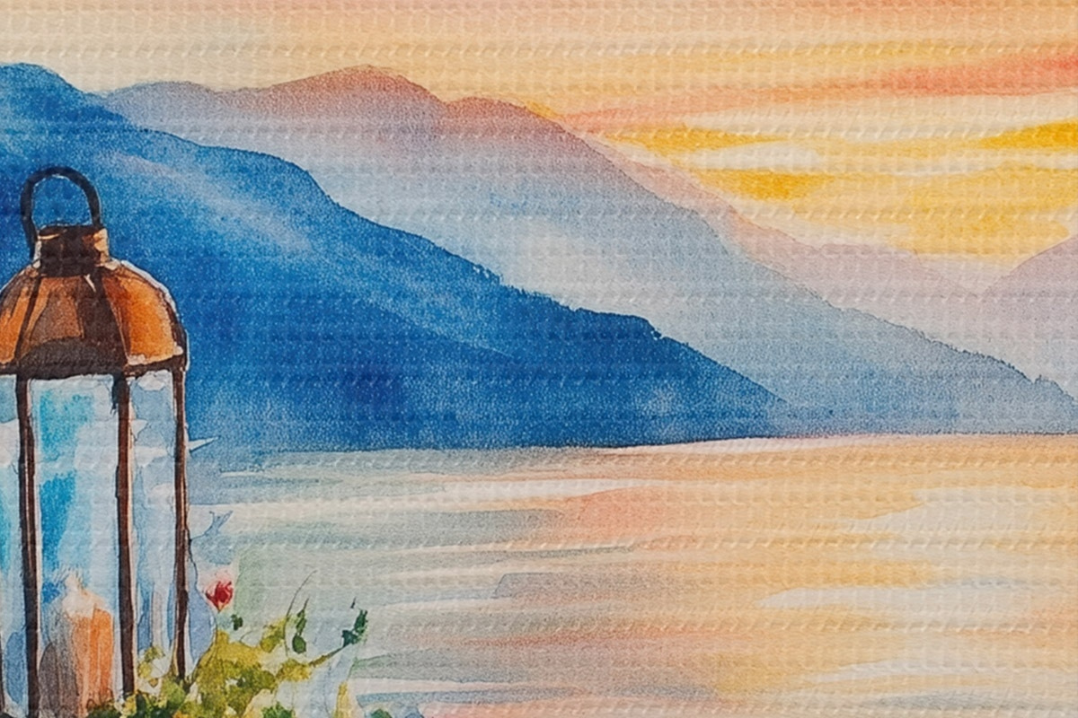 Bild Schöner Sonnenuntergang in den Bergen, See, Rosen, Boho-Stil Nr r44025