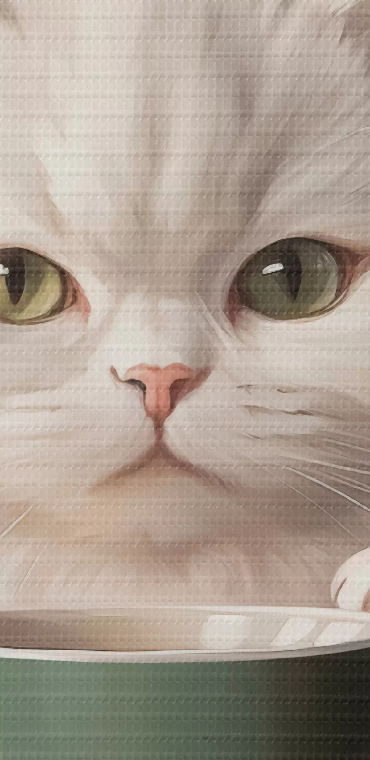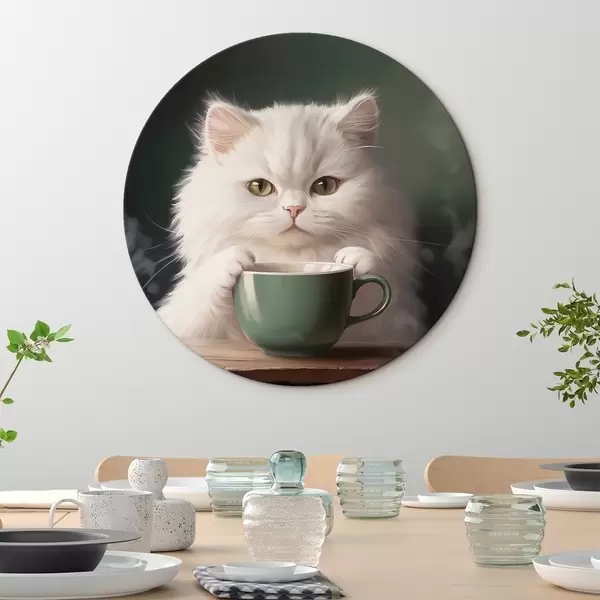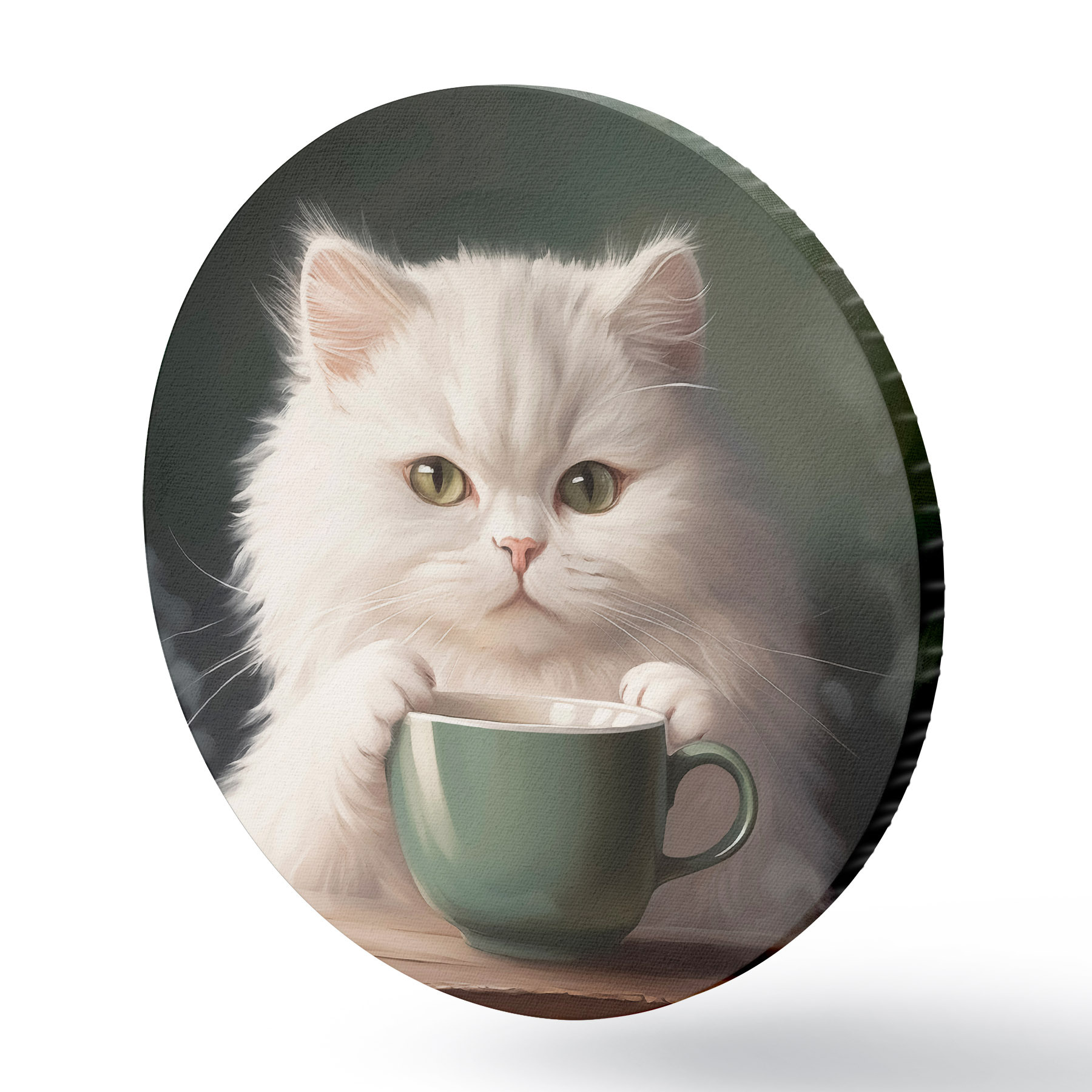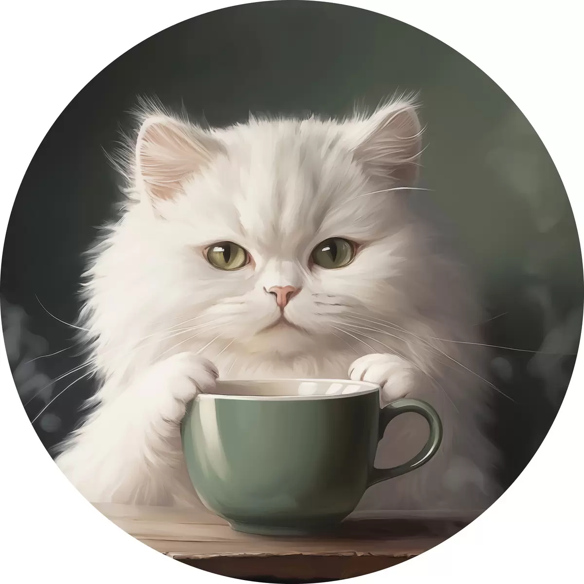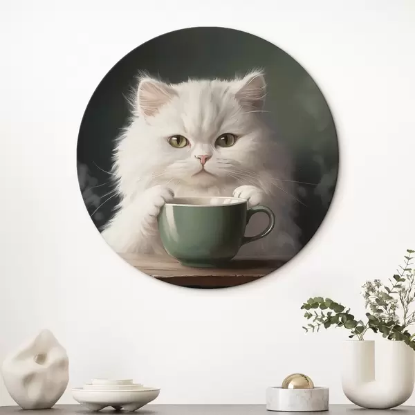 Runde Gemälde Weiße Katze mit grüner Tasse r44032
