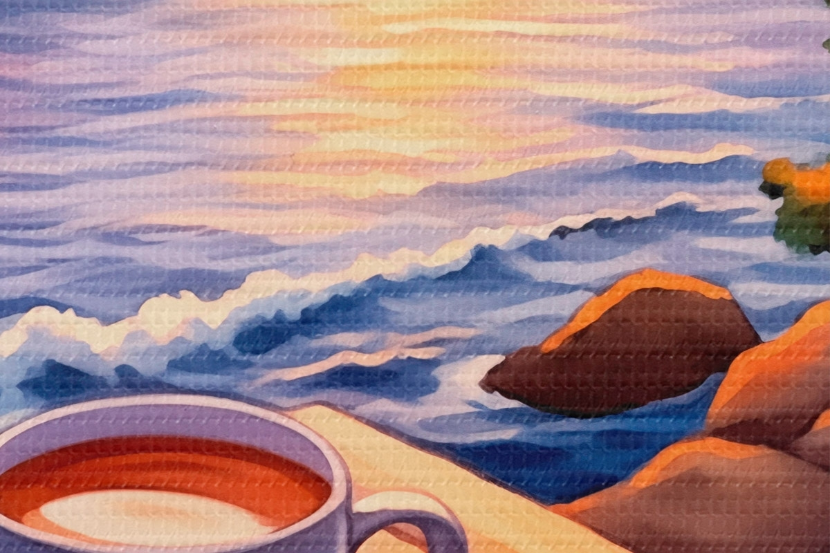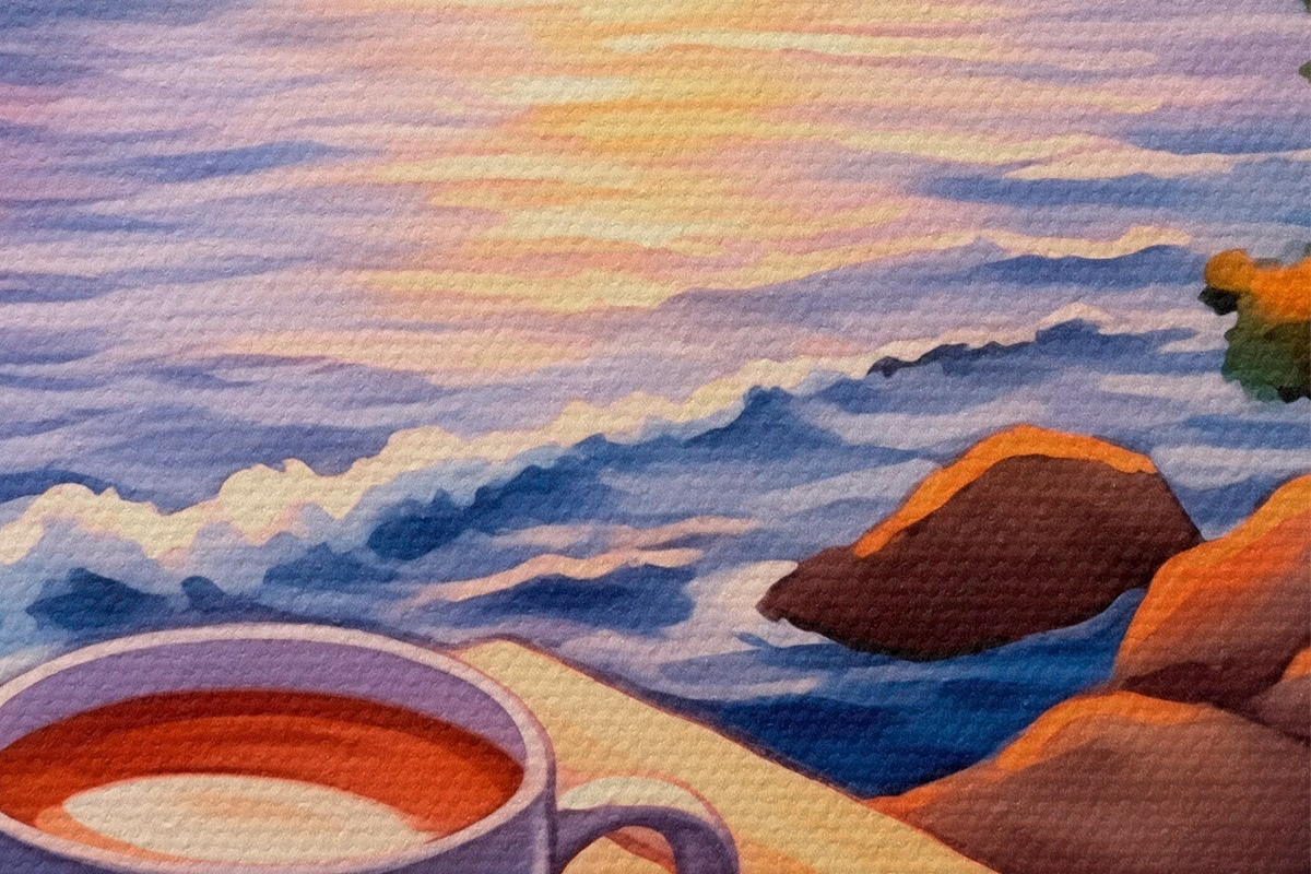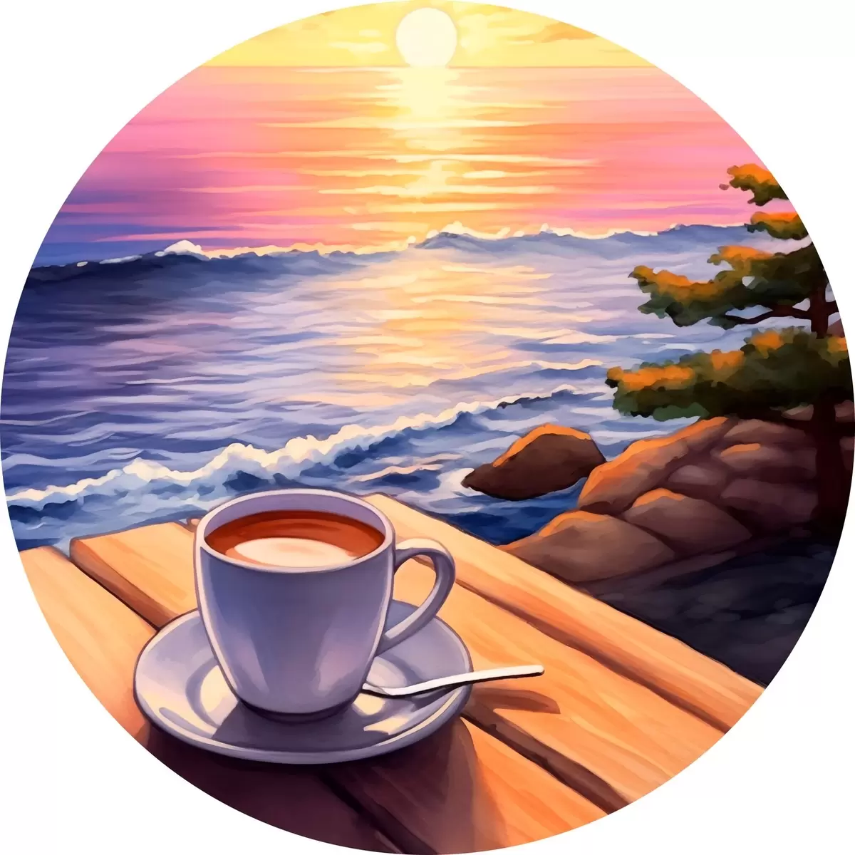 Runde Gemälde Tasse Kaffee auf dem Hintergrund der Landschaft r44105