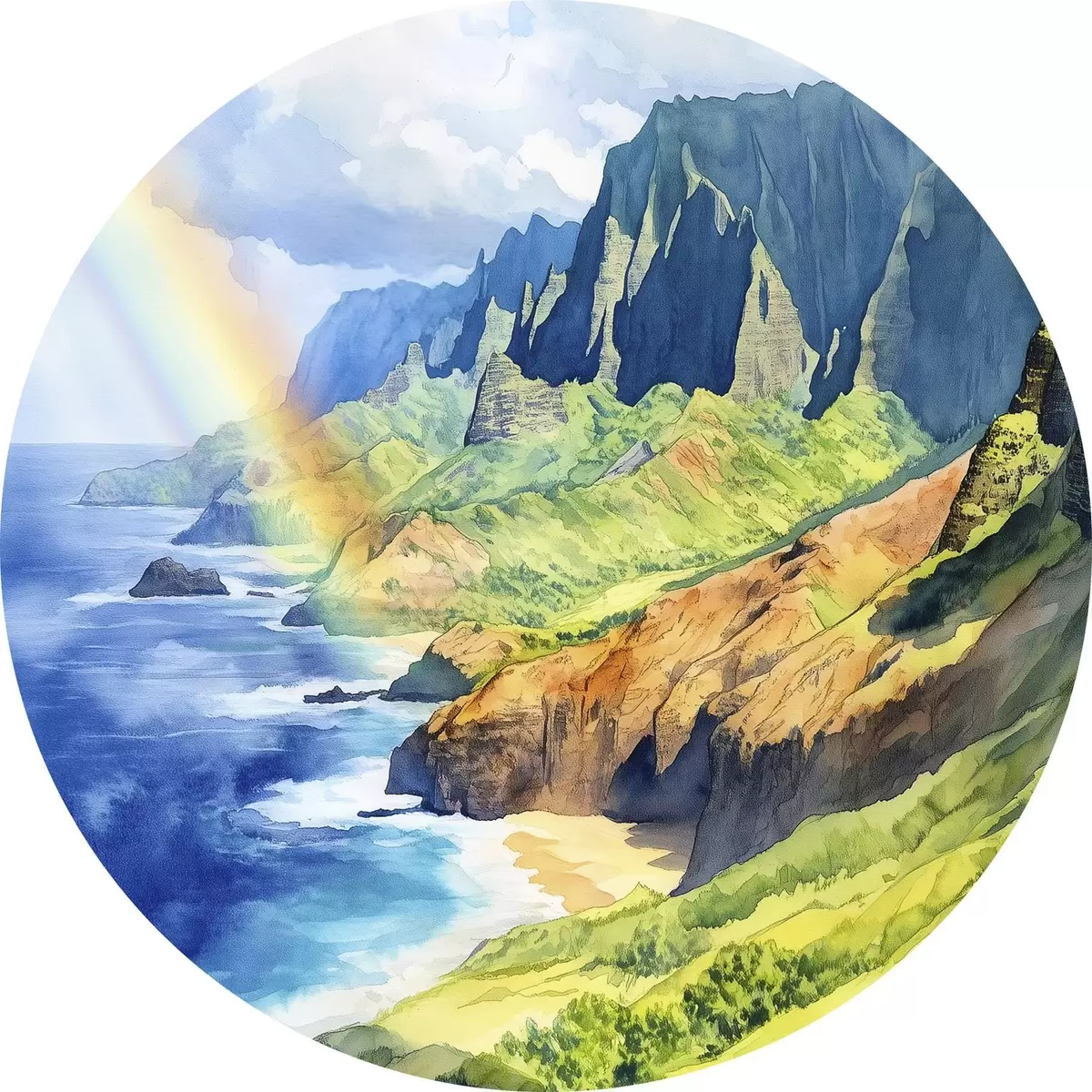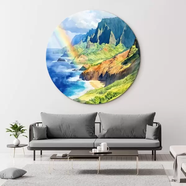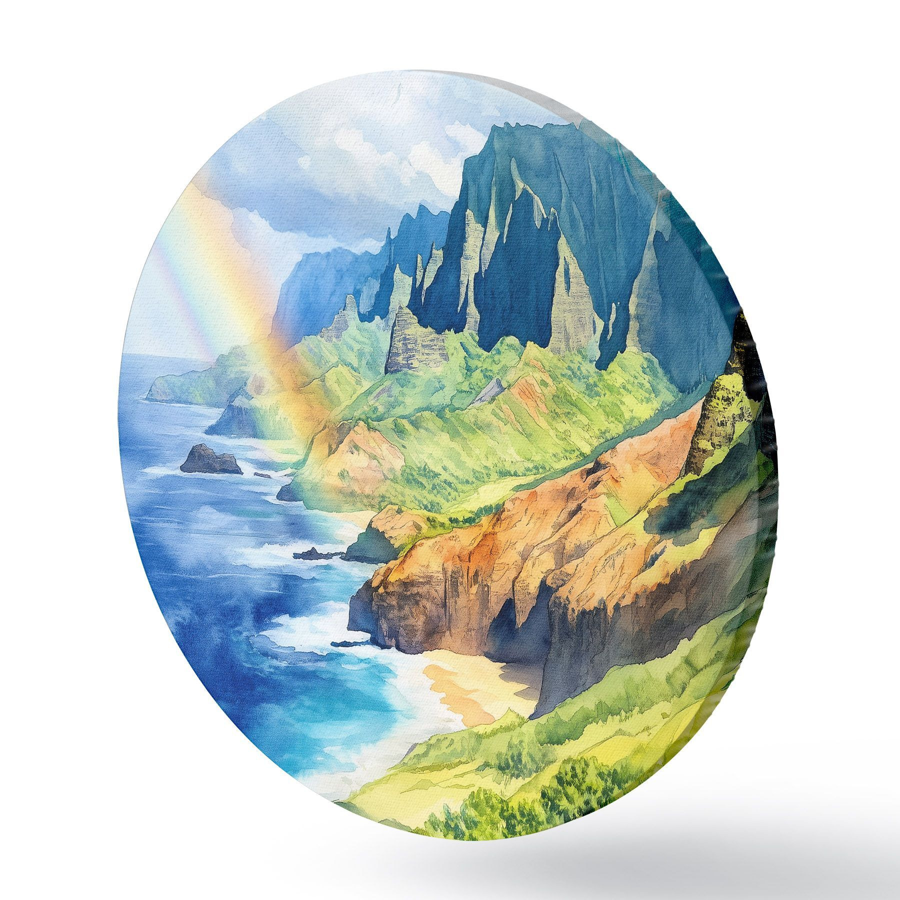 Runde Gemälde Insel Hawaii, Aquarellstil, Regenbogen, grüne Berge, Meer r44141