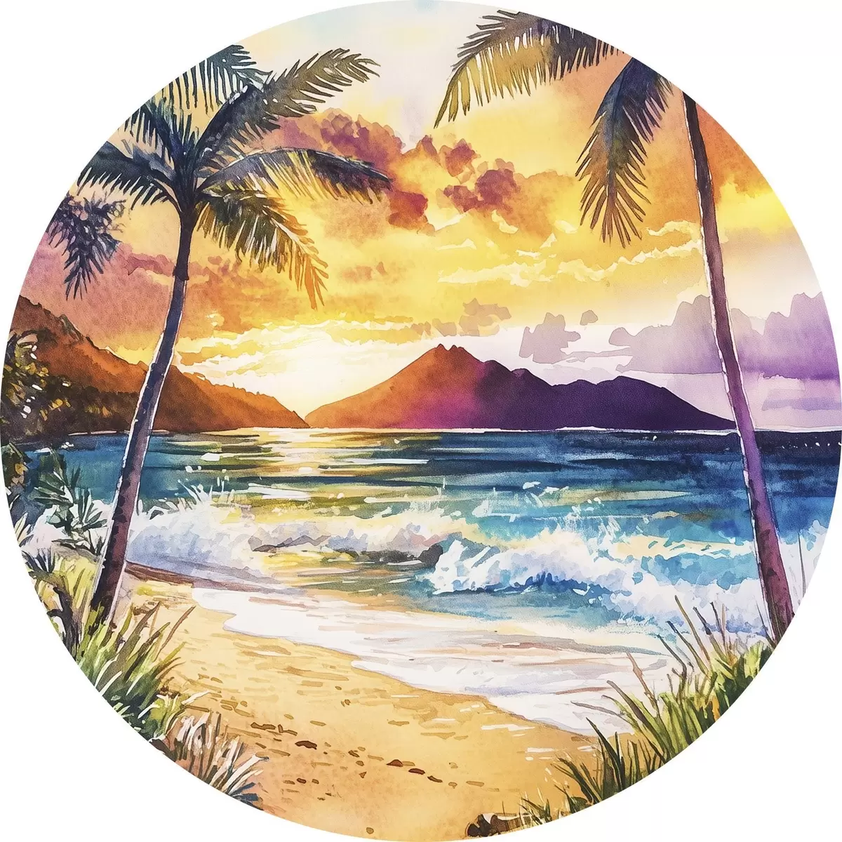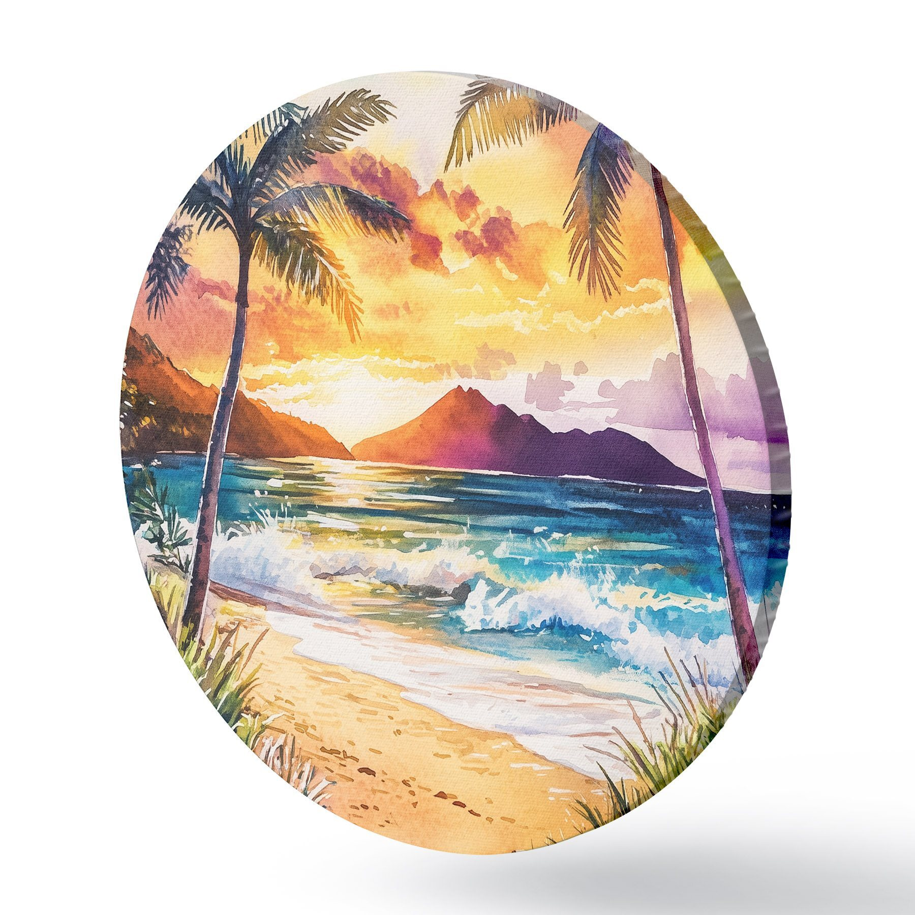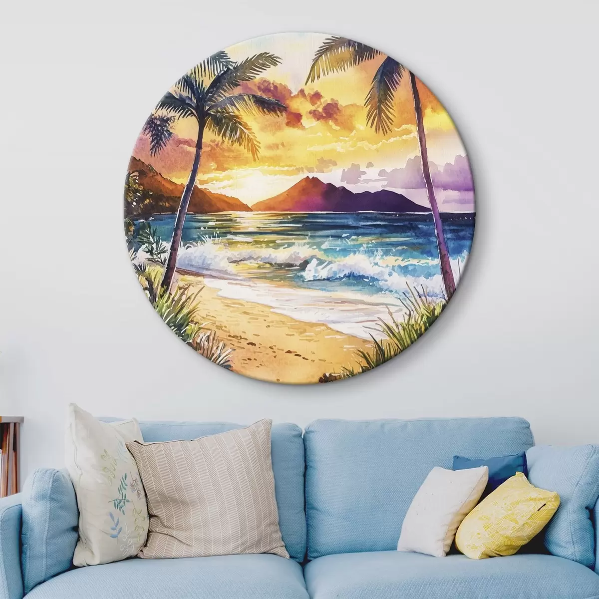 Runde Gemälde Sonnenuntergang auf der Insel Hawaii, Palmen, Meer, bunten Himmel, Aquarell-Stil r44142