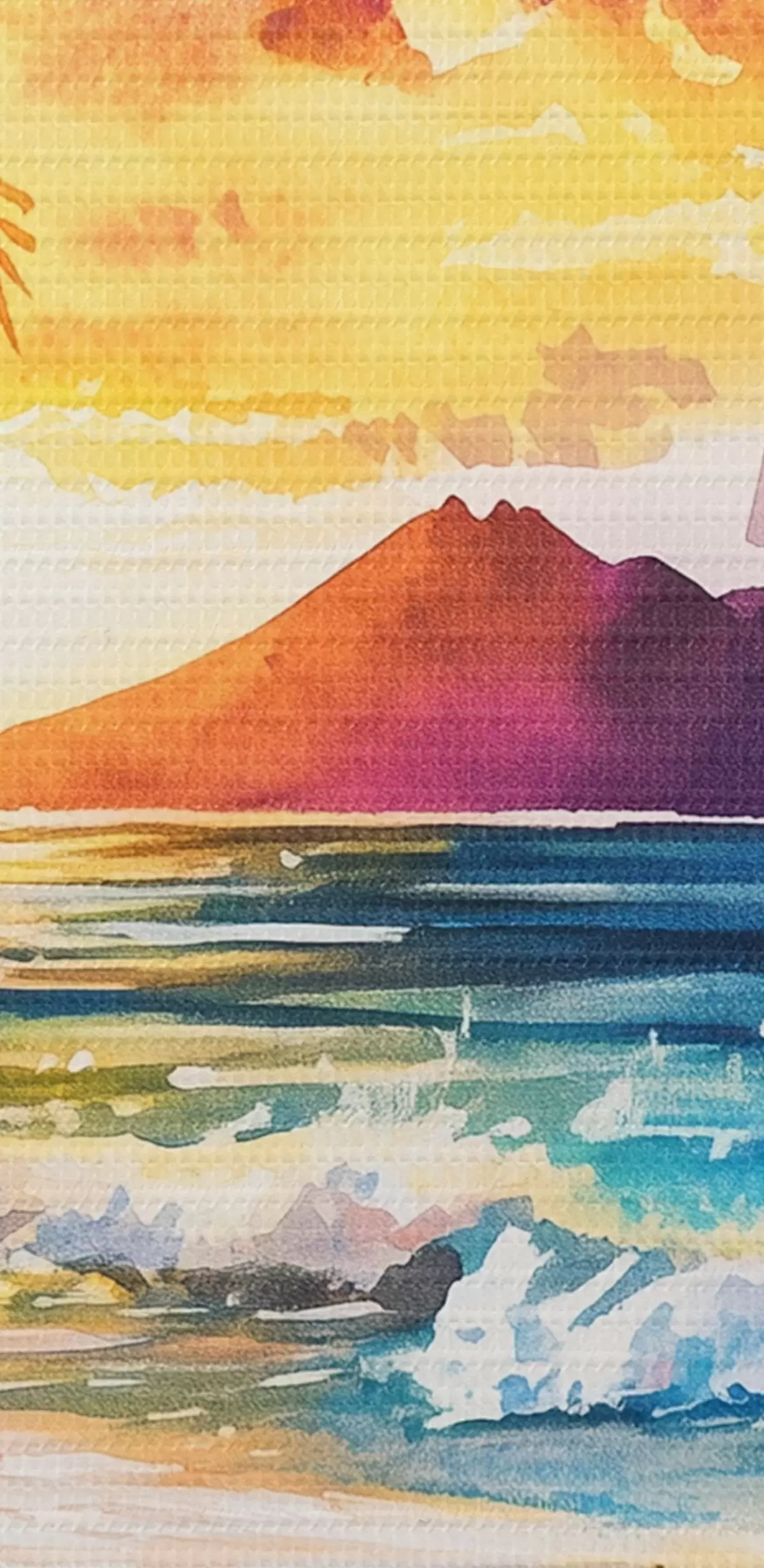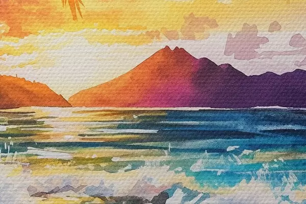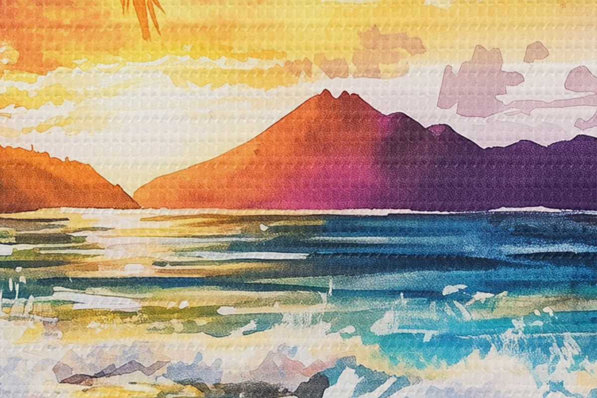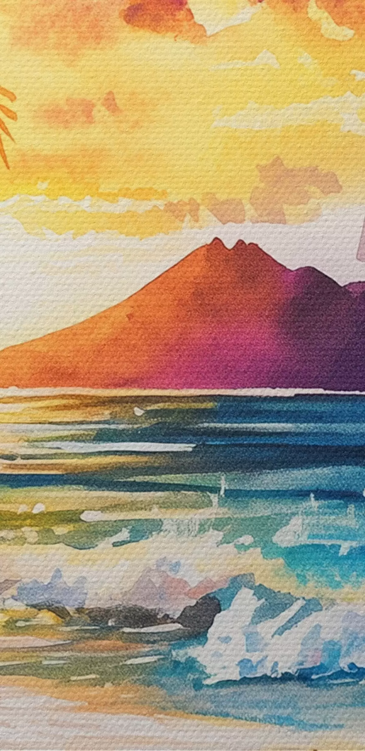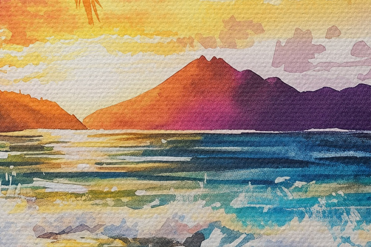 Bild Sonnenuntergang auf der Insel Hawaii, Palmen, Meer, bunten Himmel, Aquarell-Stil Nr r44142