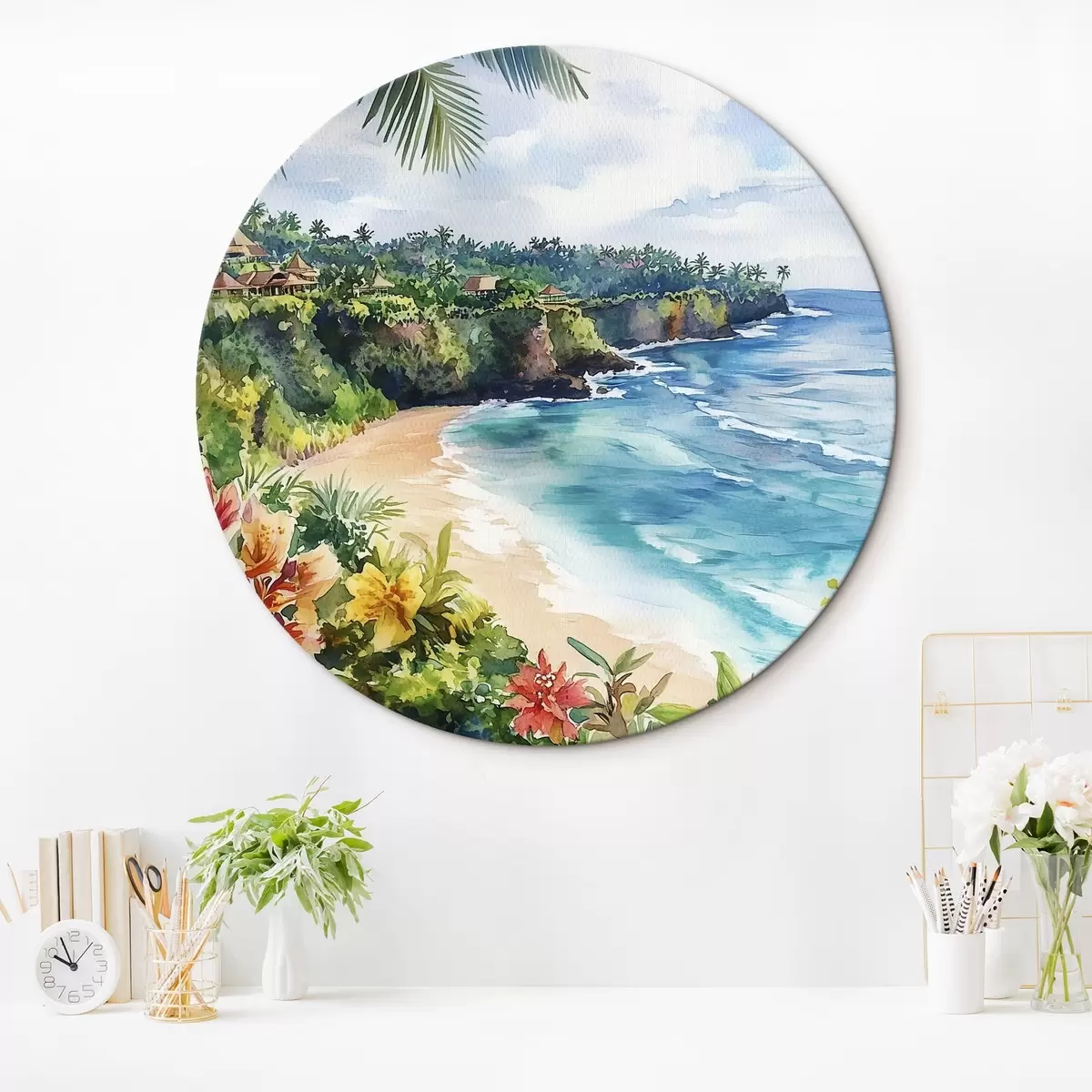 Runde Gemälde Tropischer Meeresstrand, Palmen, Blumen, Aquarellstil r44145