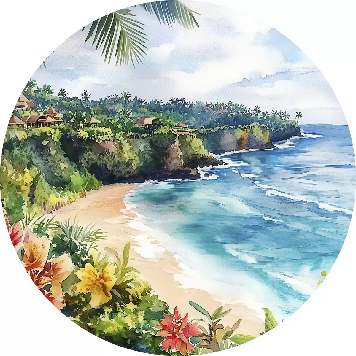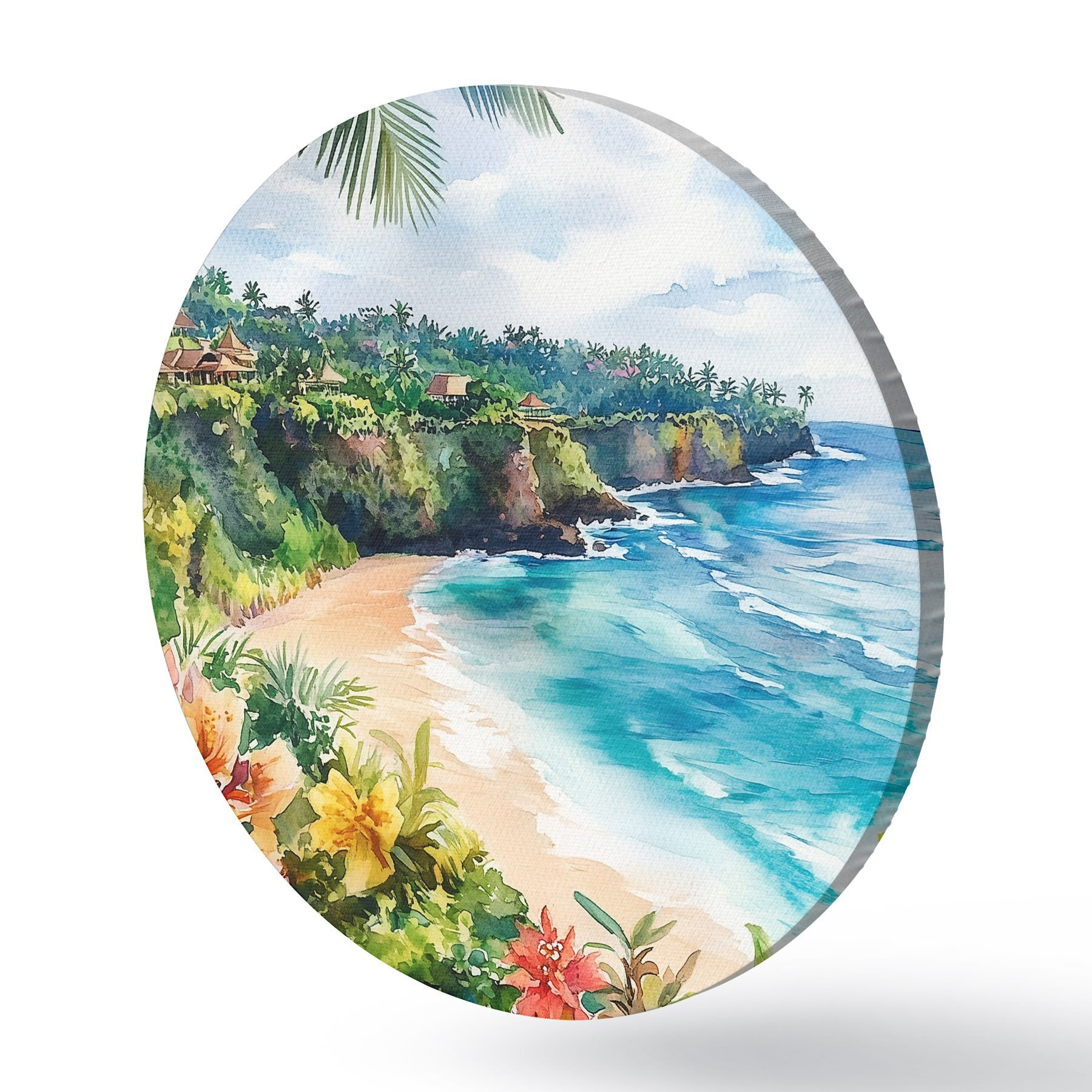 Runde Gemälde Tropischer Meeresstrand, Palmen, Blumen, Aquarellstil r44145