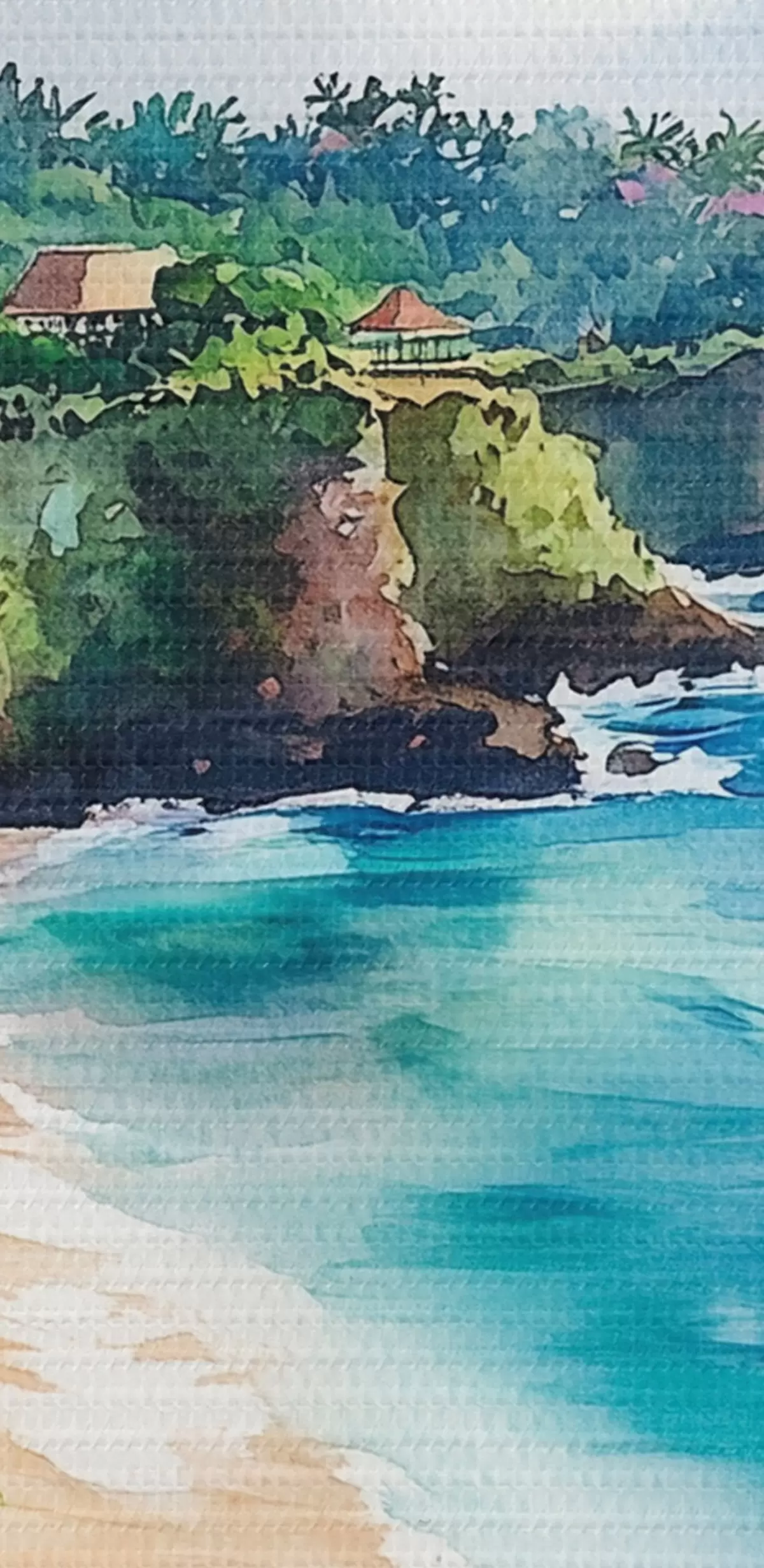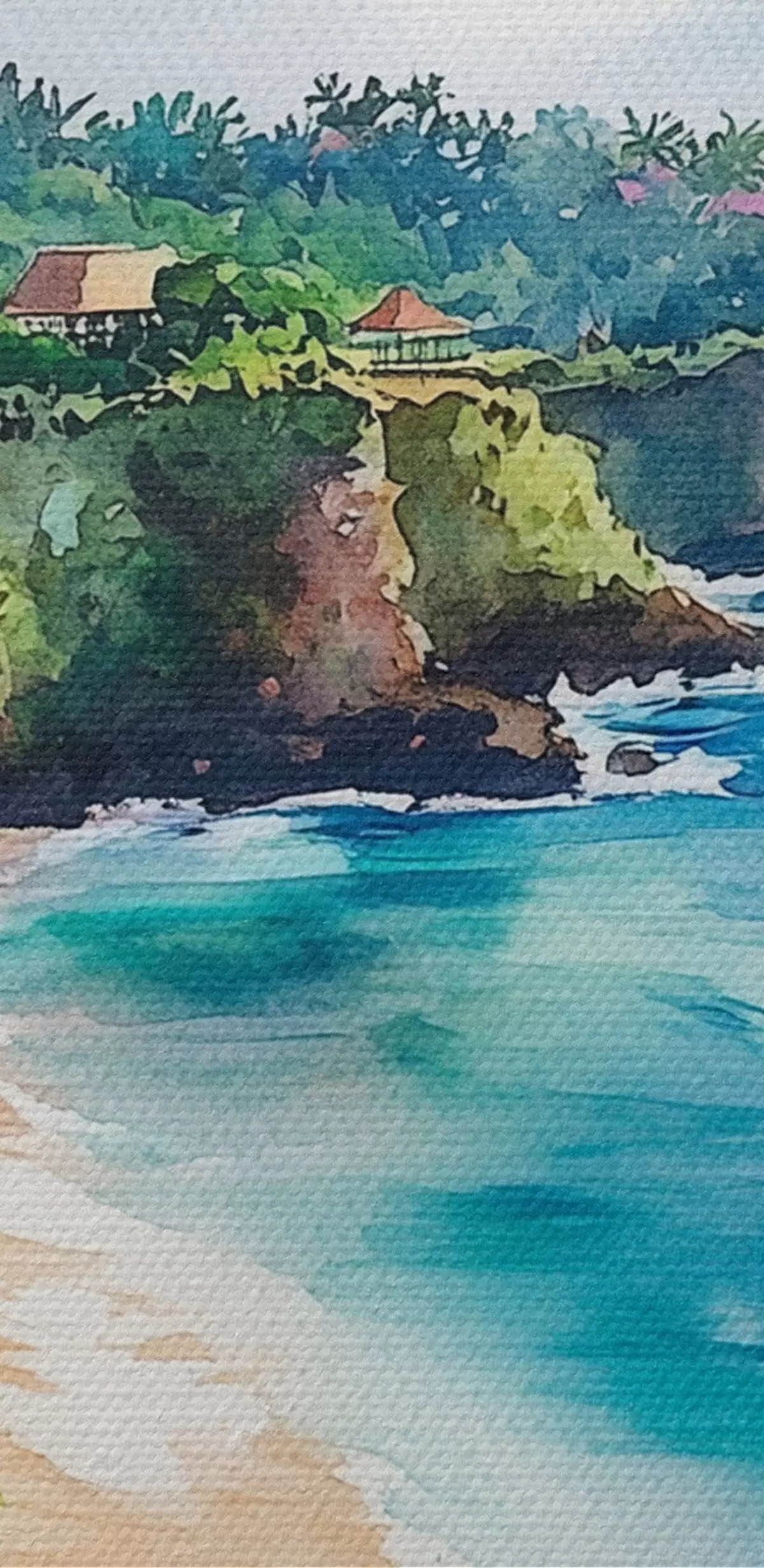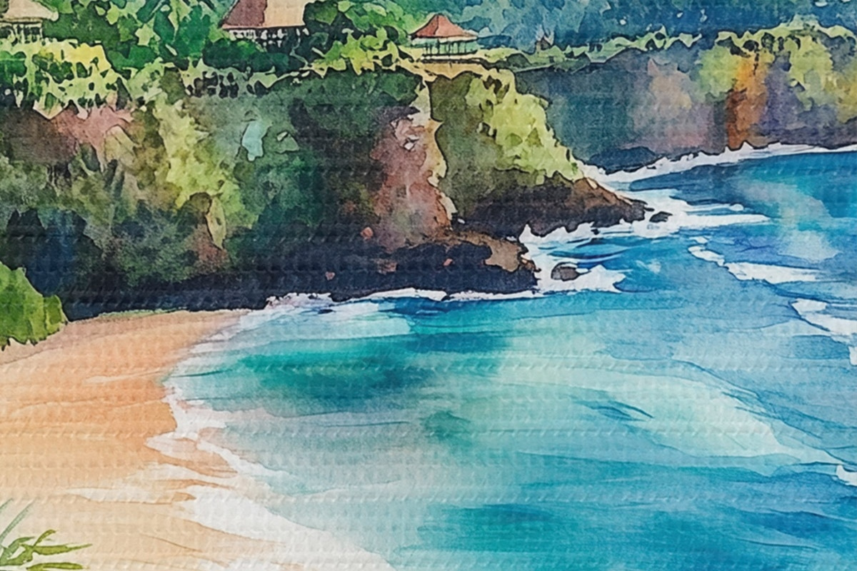 Bild Tropischer Meeresstrand, Palmen, Blumen, Aquarellstil Nr r44145