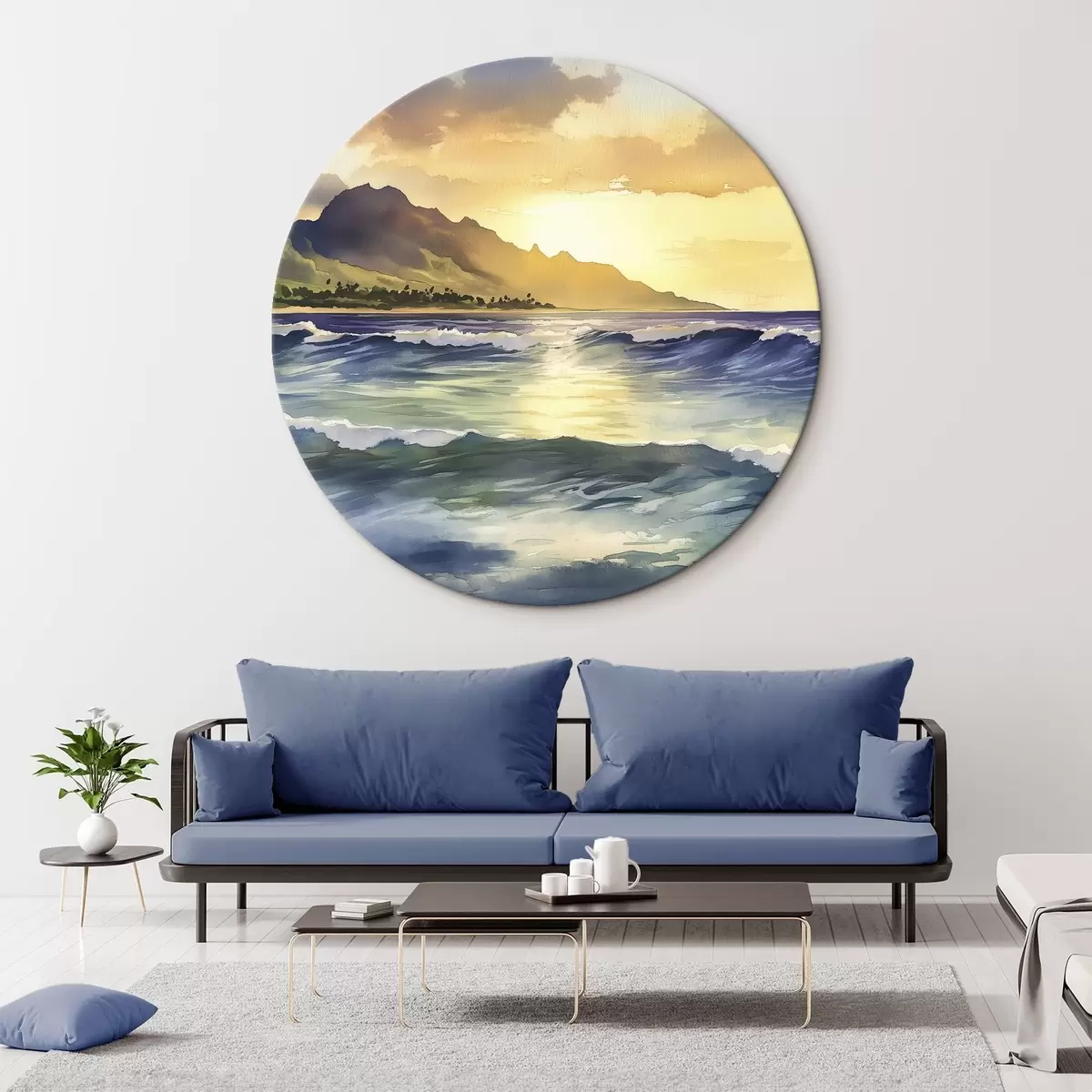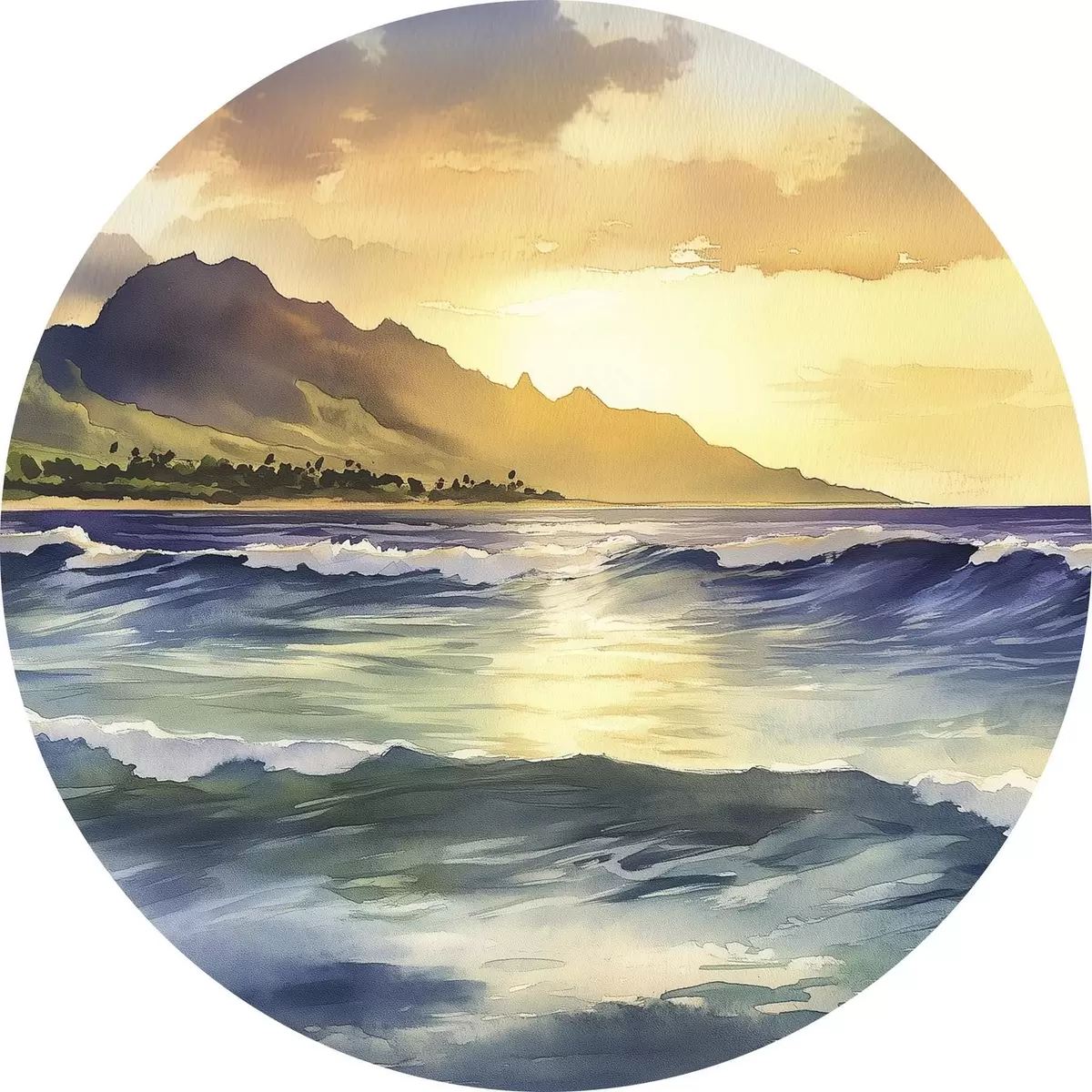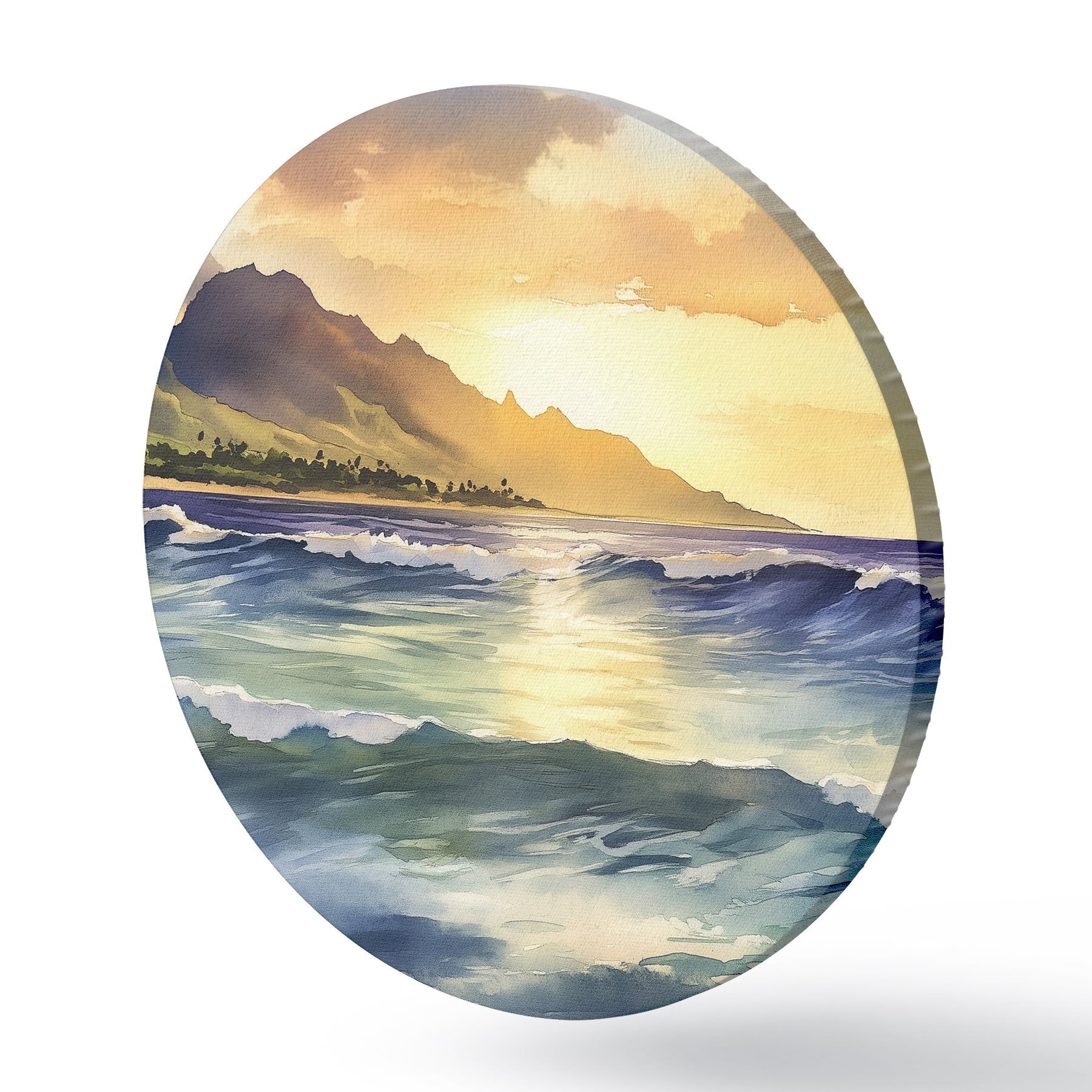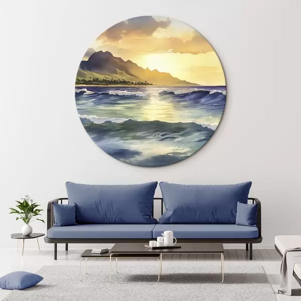 Runde Gemälde Meereswellen, Sonnenuntergang, Aquarellstil, Natur r44147