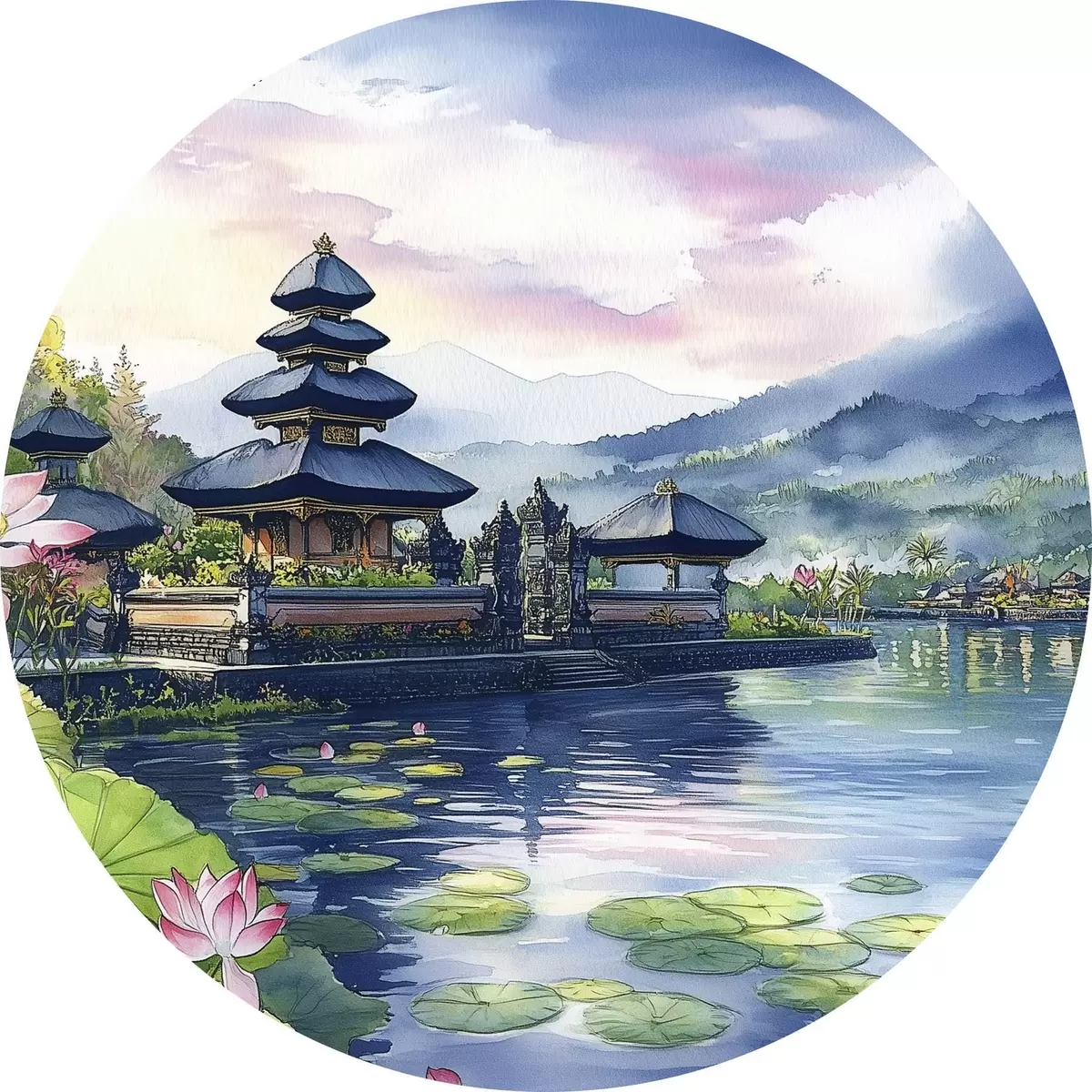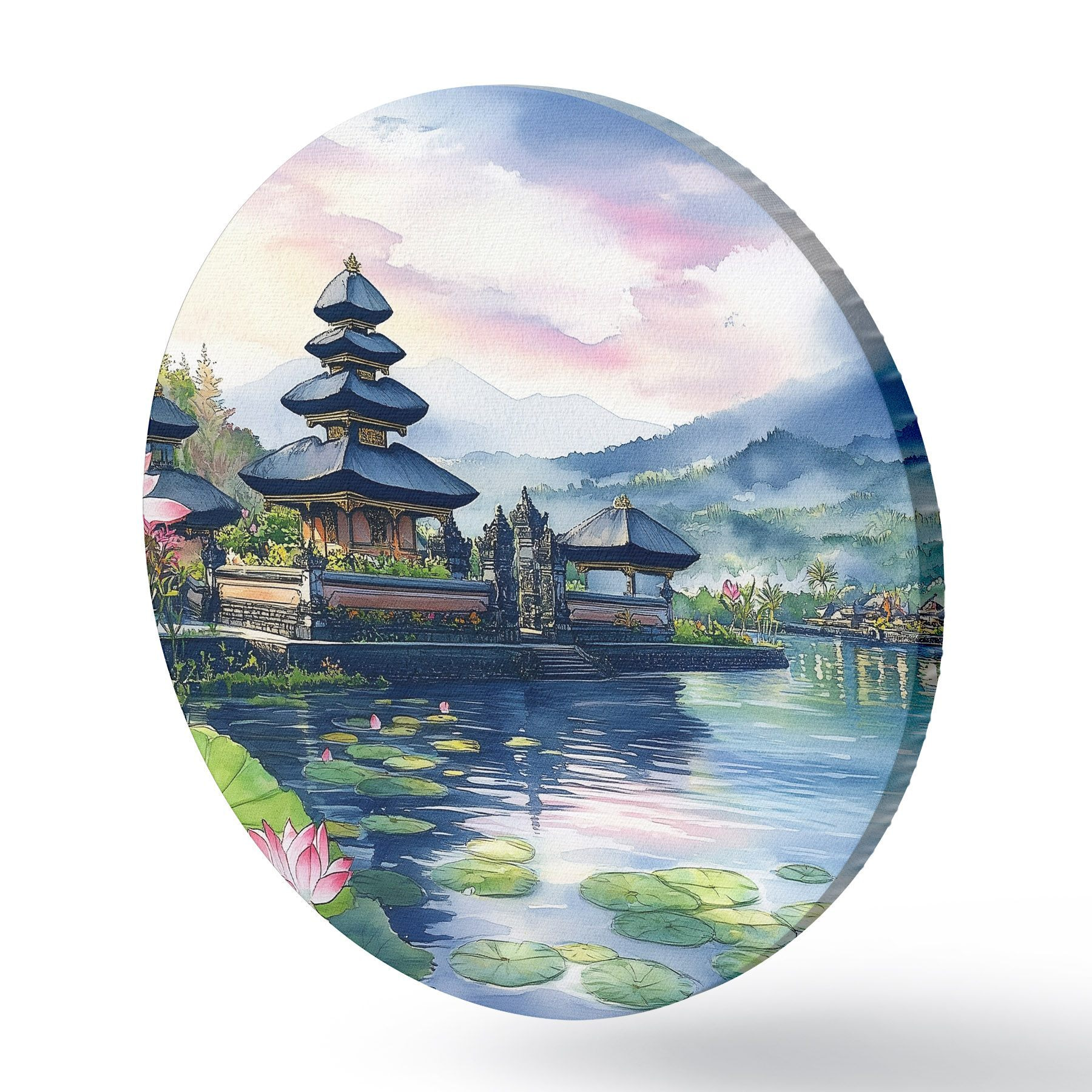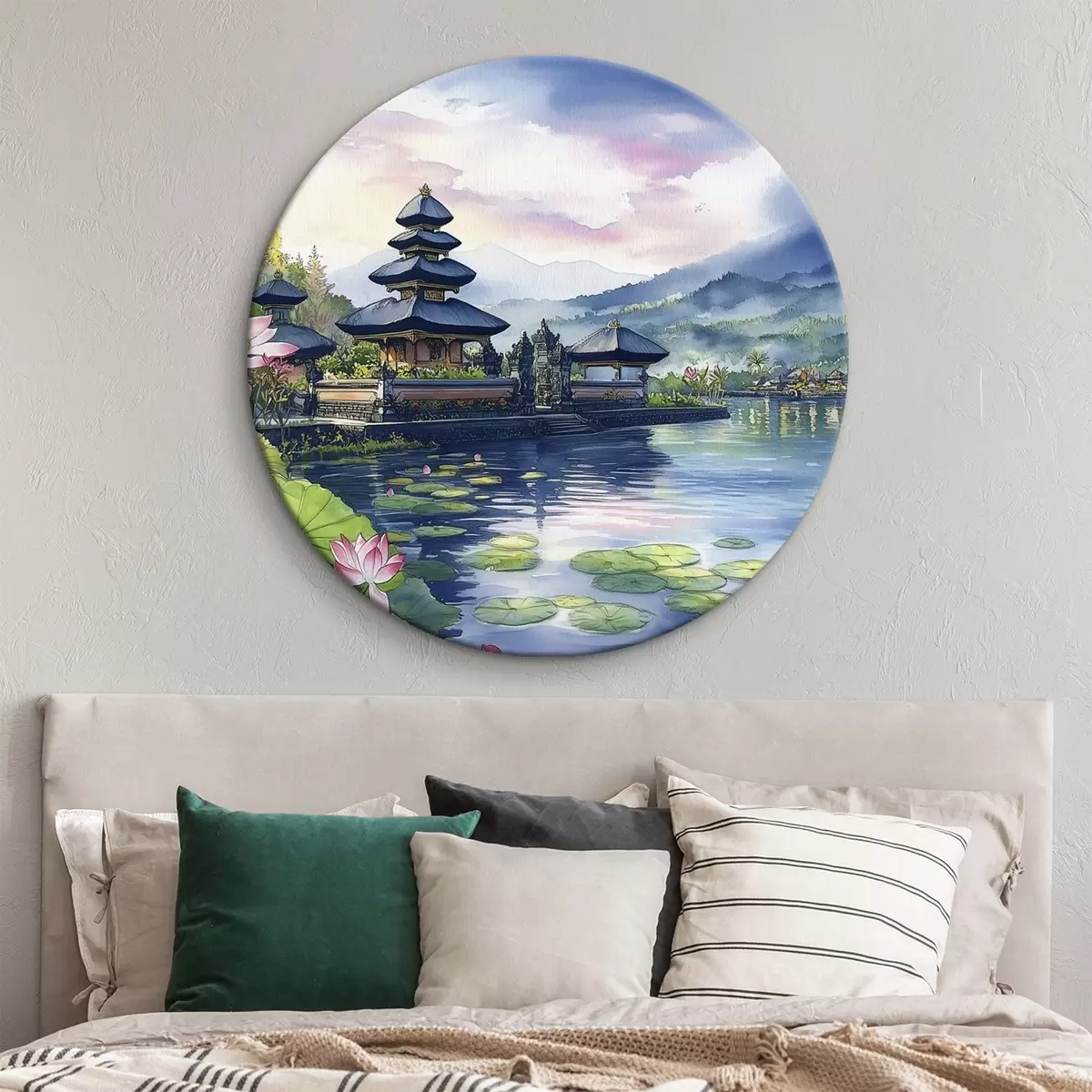 Runde Gemälde Indonesische Insel, Tempel, Buddhismus, tropische Natur, Aquarellstil r44148