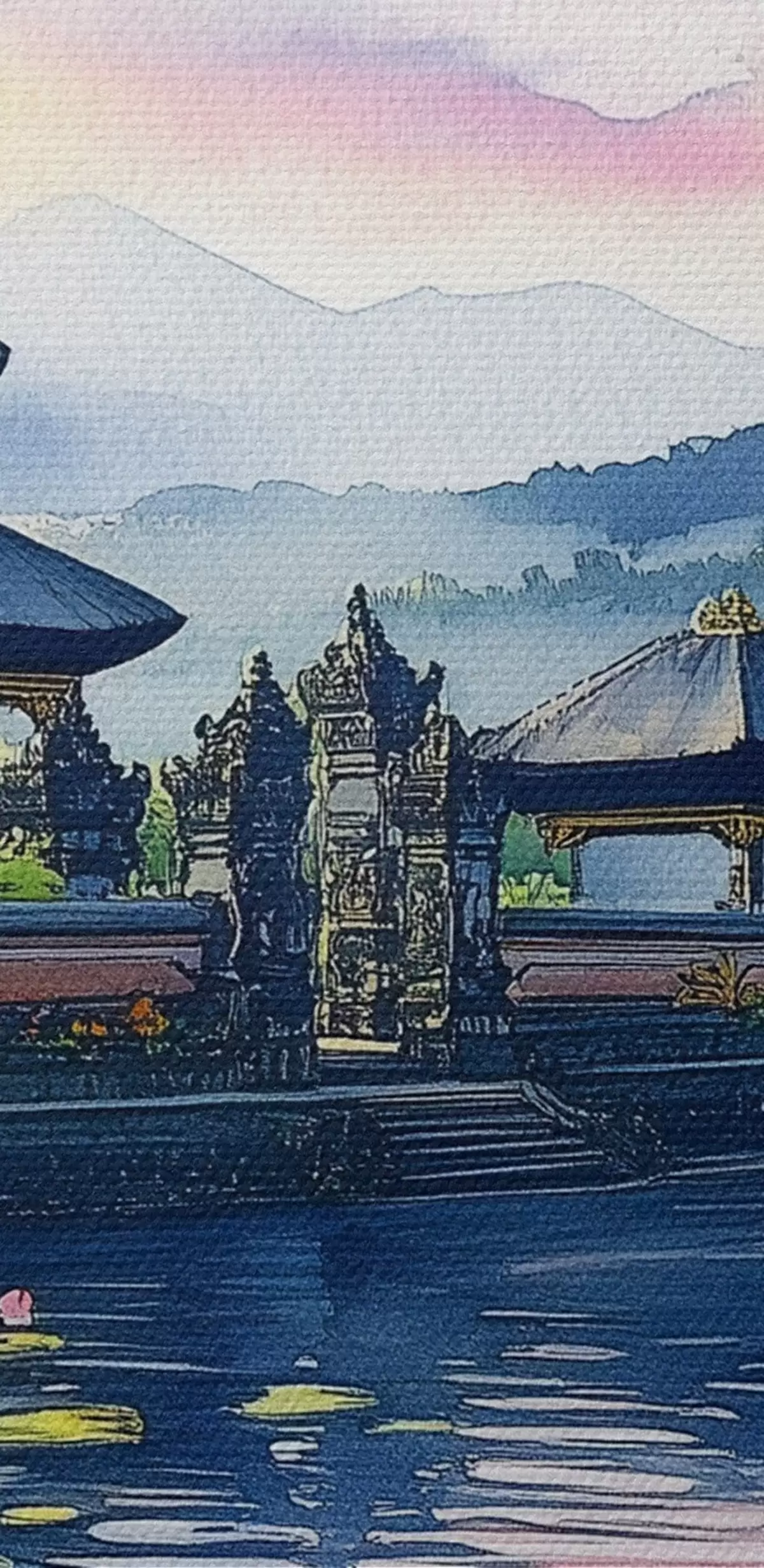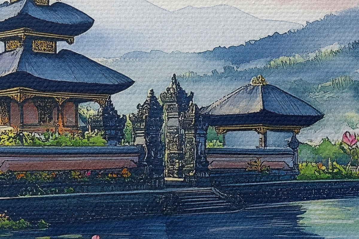 Bild Indonesische Insel, Tempel, Buddhismus, tropische Natur, Aquarellstil Nr r44148