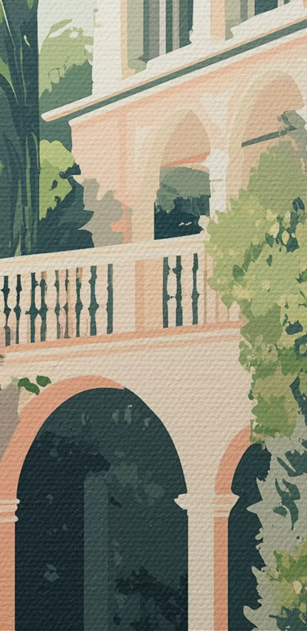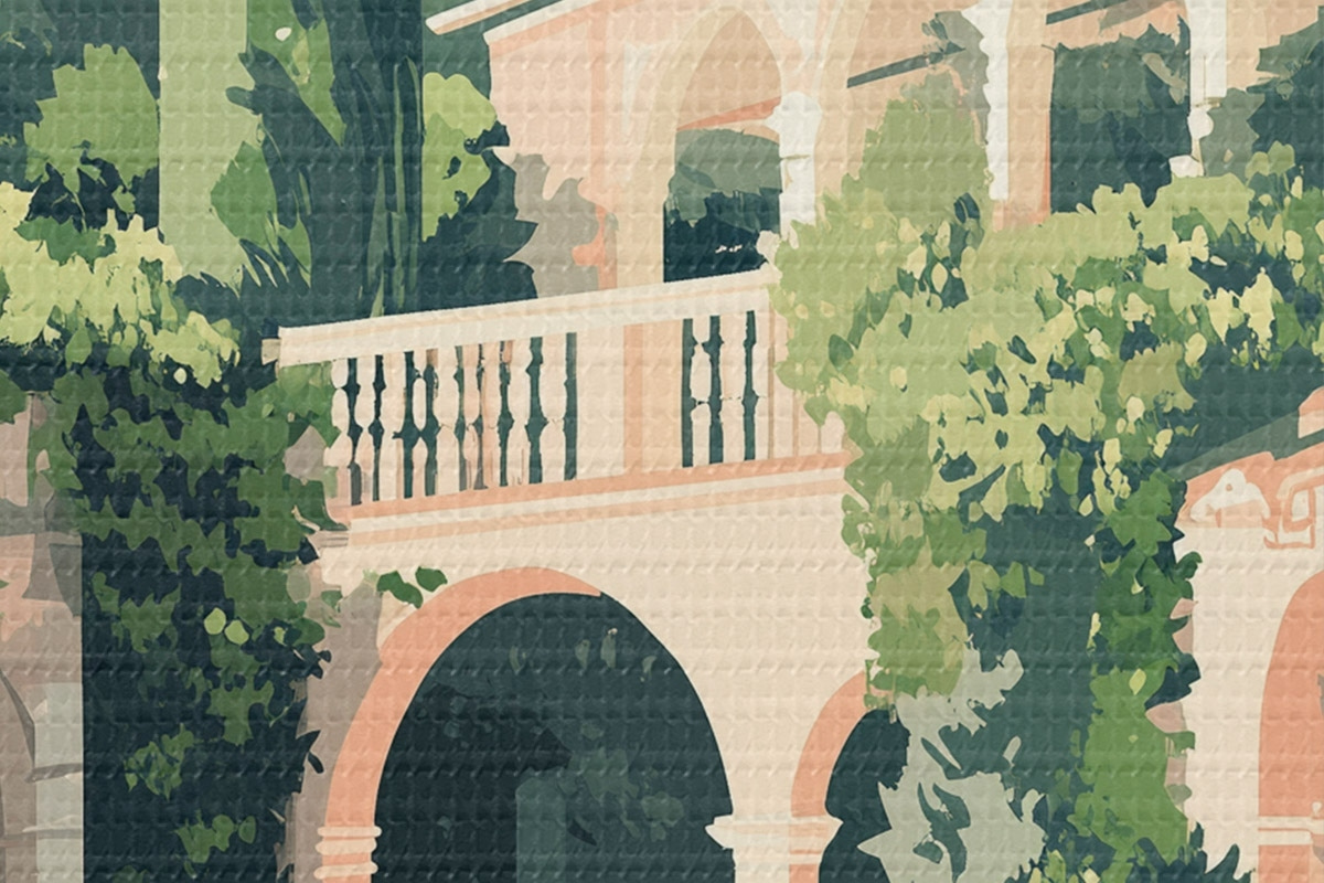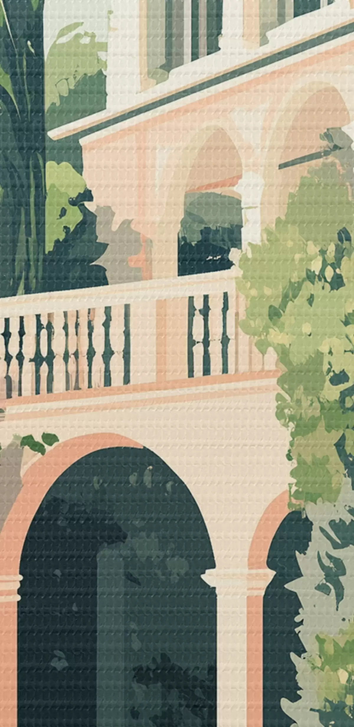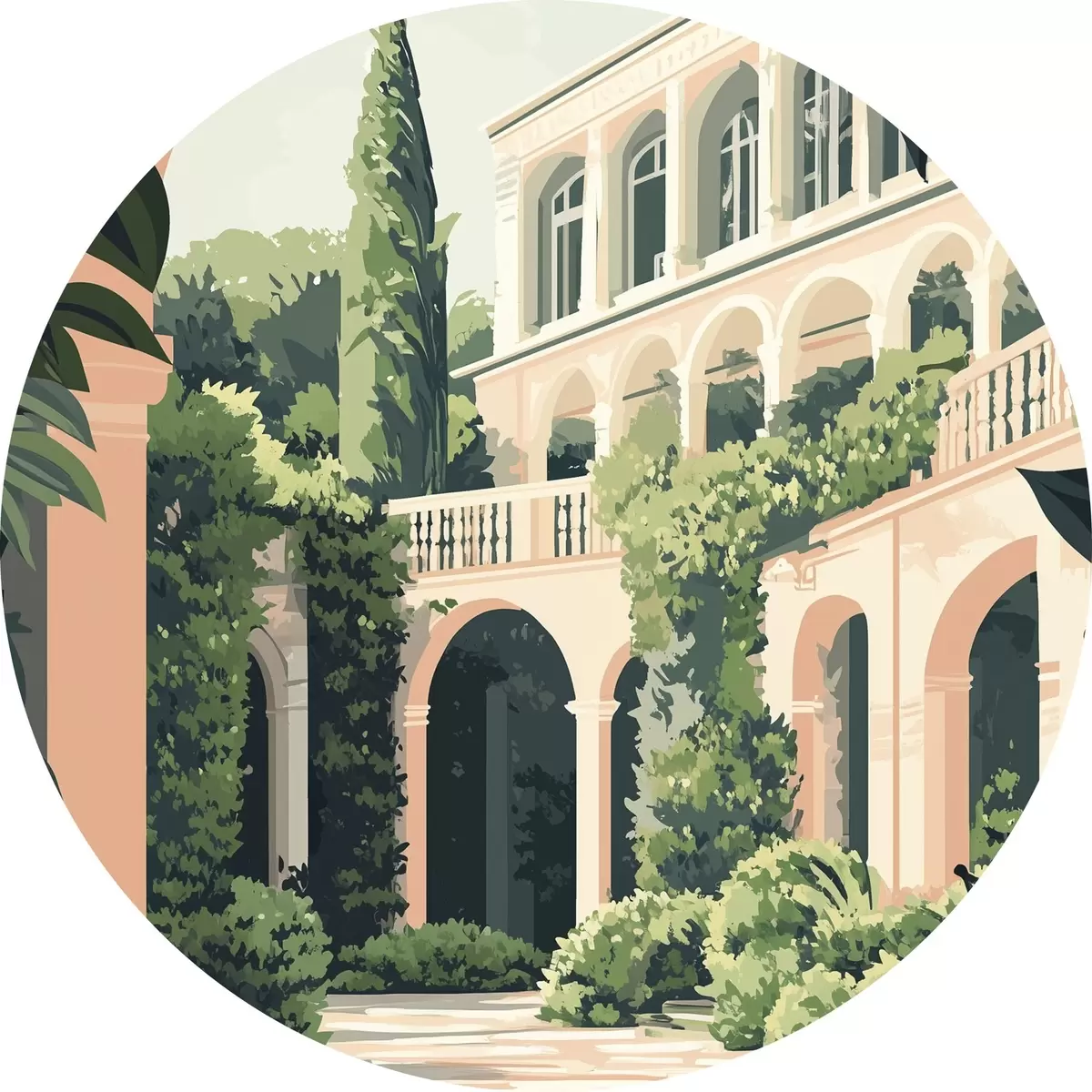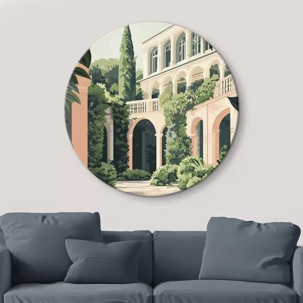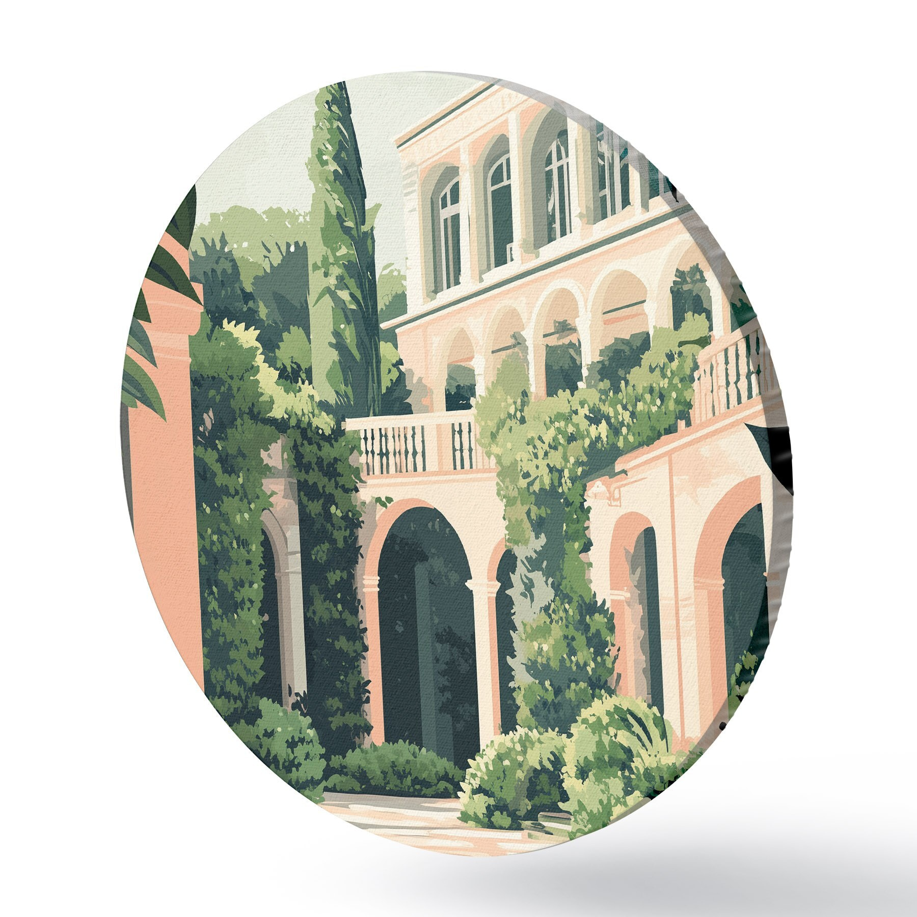 Runde Gemälde Mediterrane Architektur, tropische Natur, flacher Stil, Villa mit Garten r44150