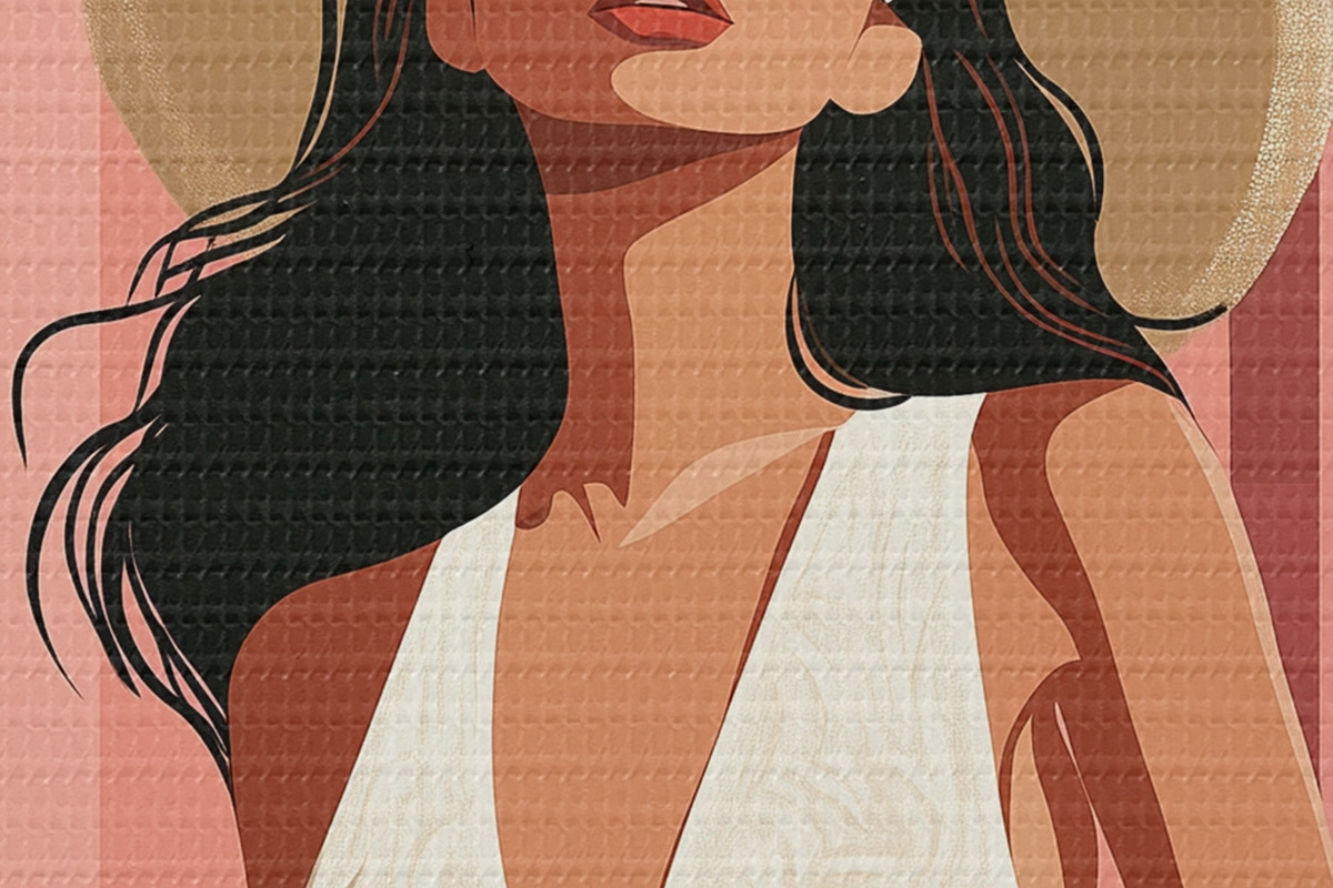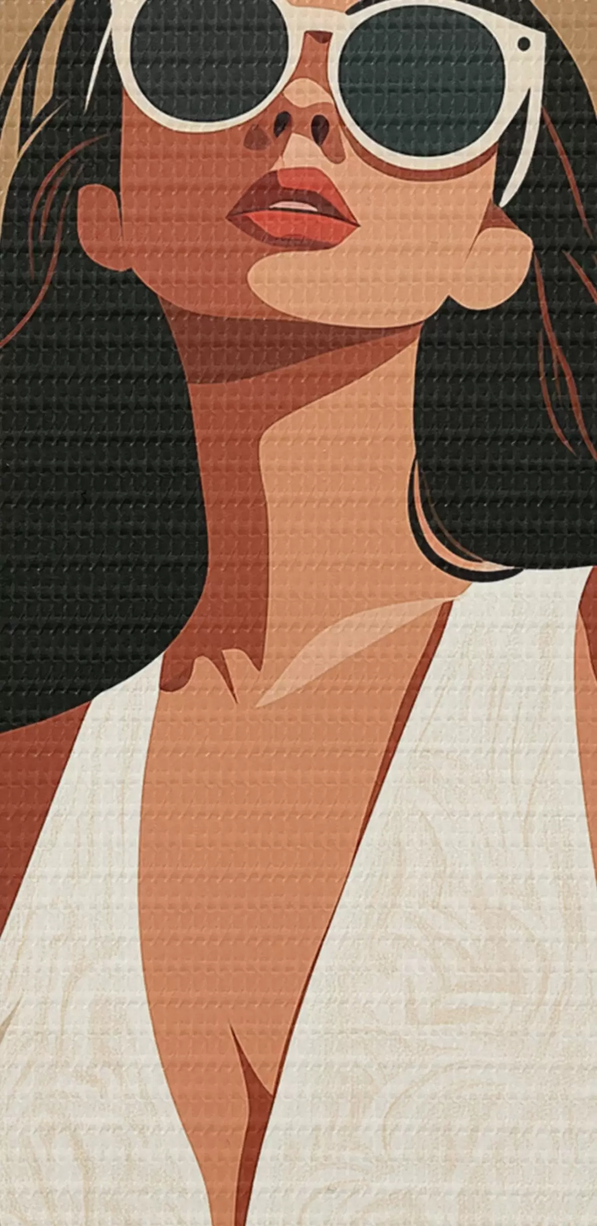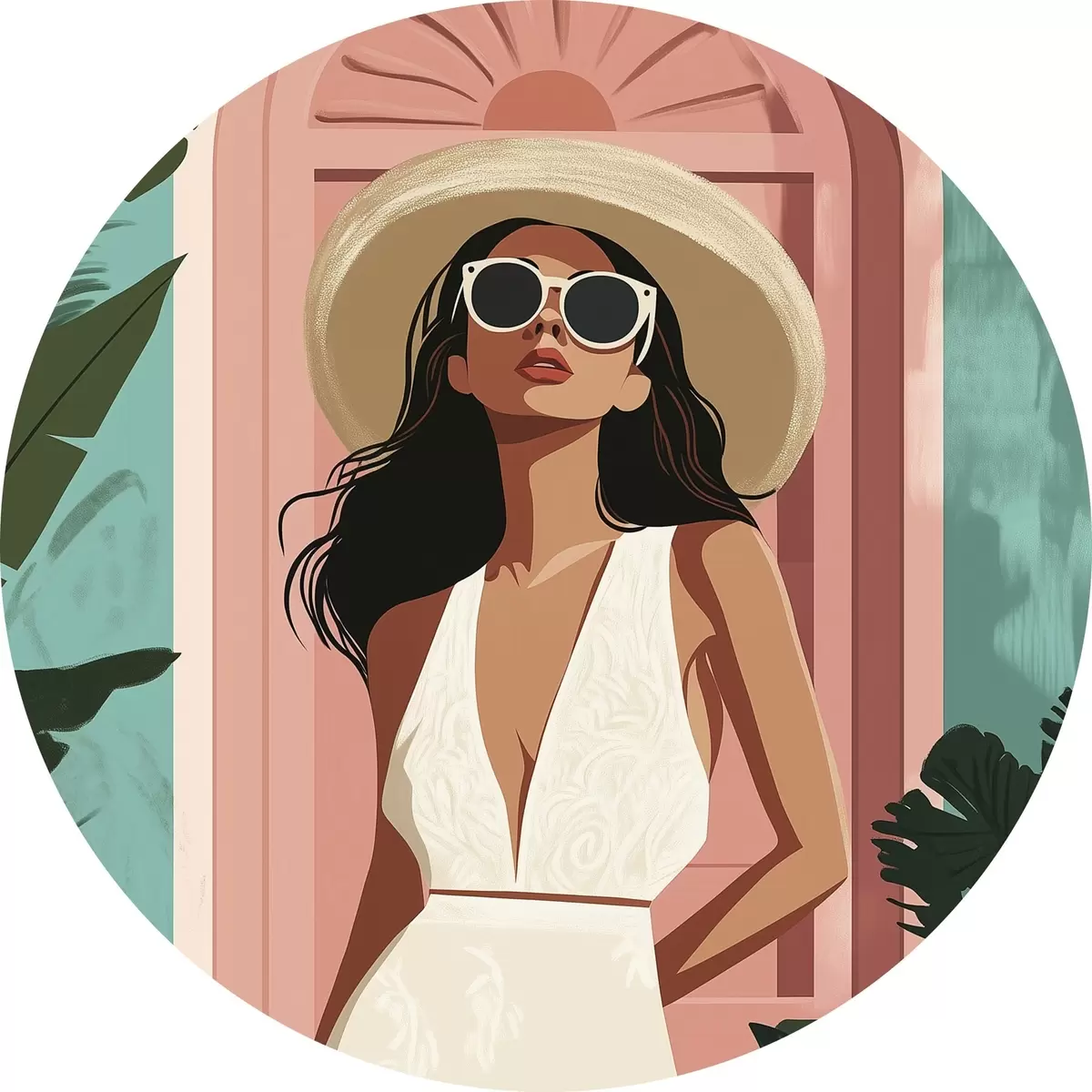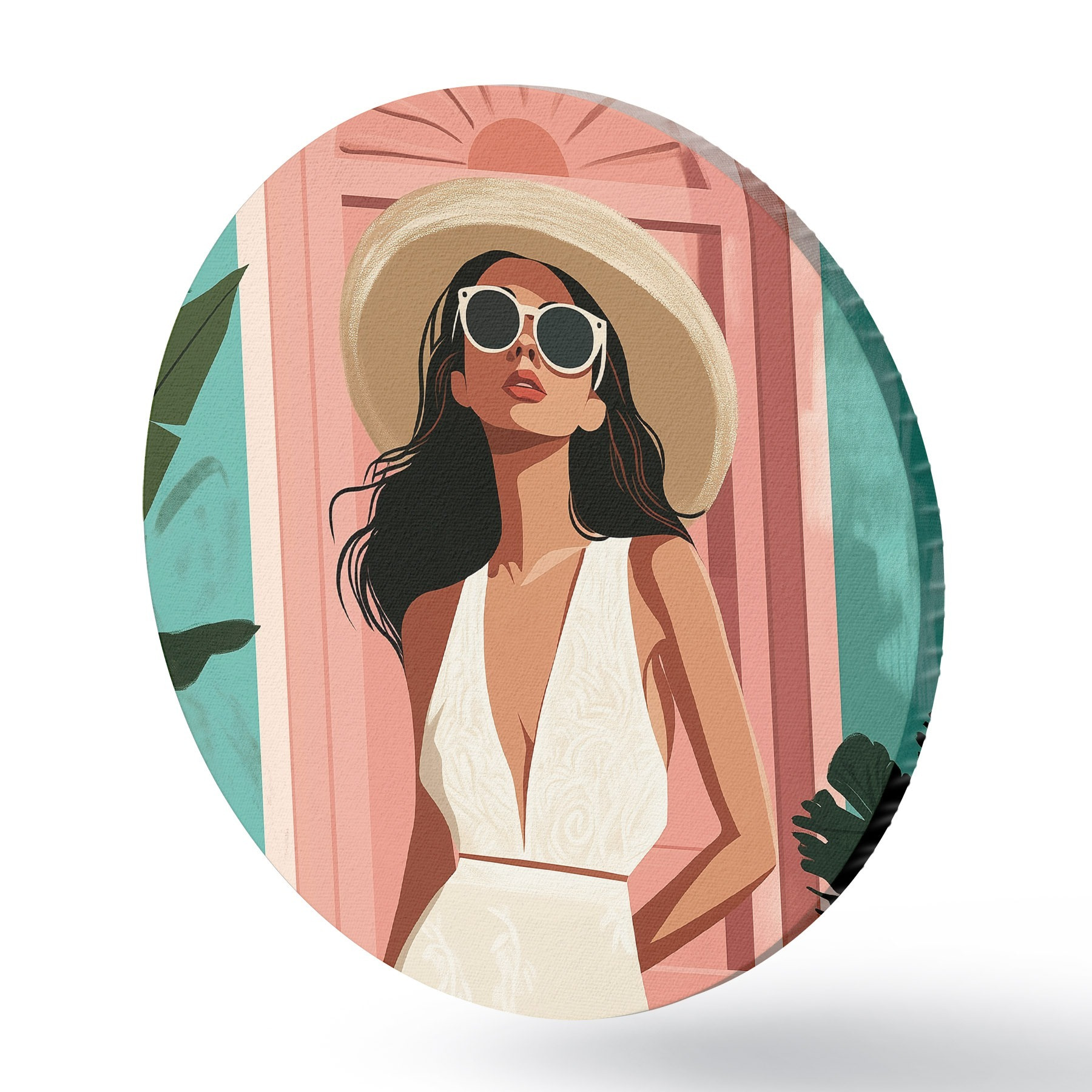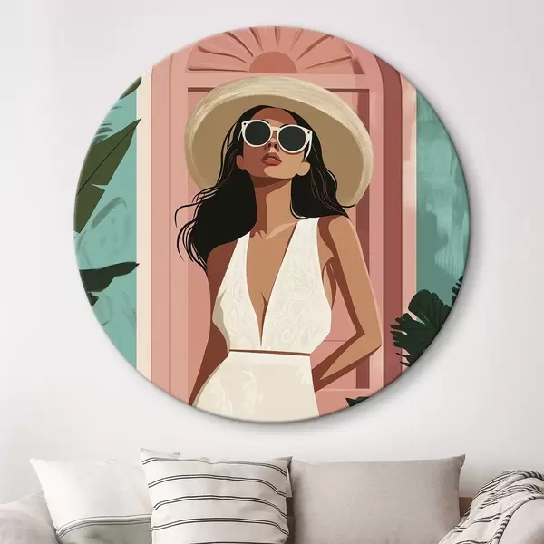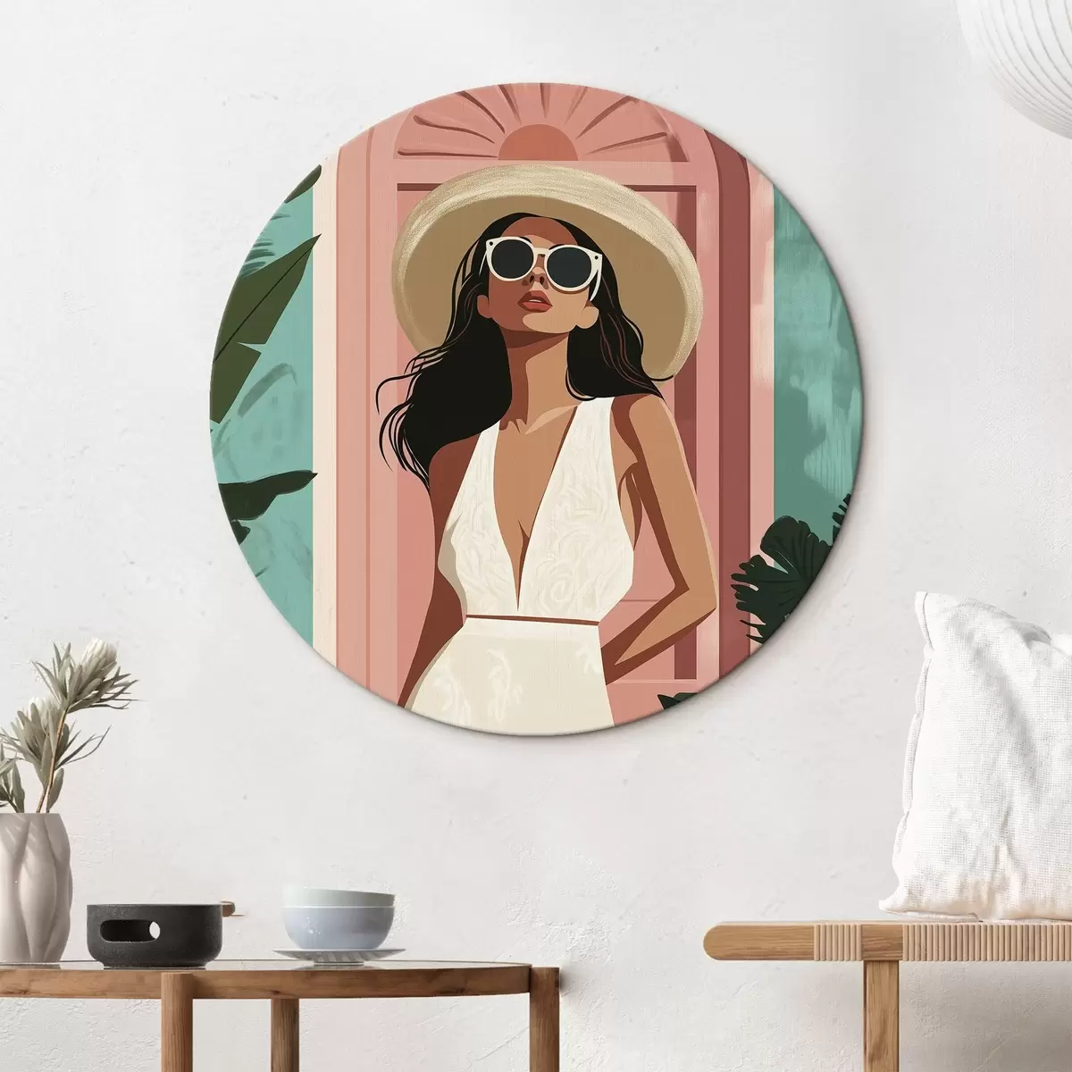 Runde Gemälde Frau mit Sonnenbrille und Hut, tropische Natur, Architektur r44152