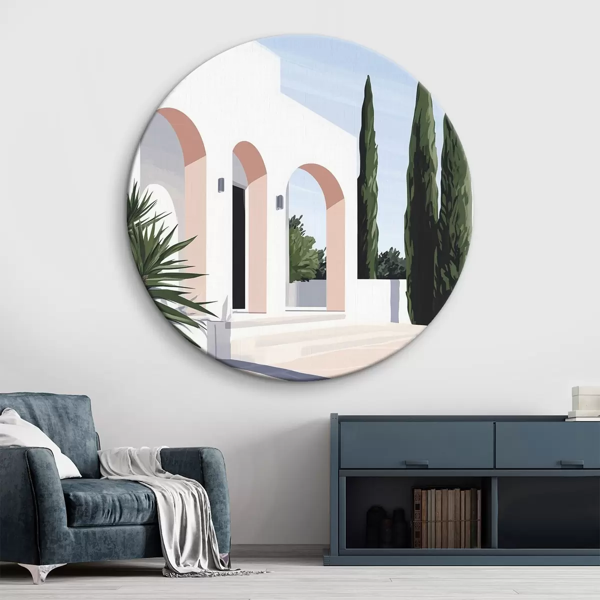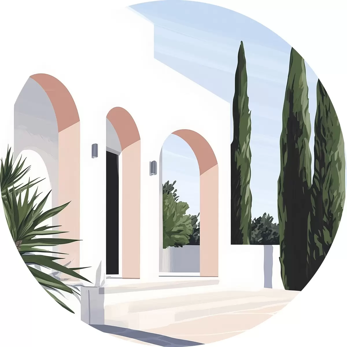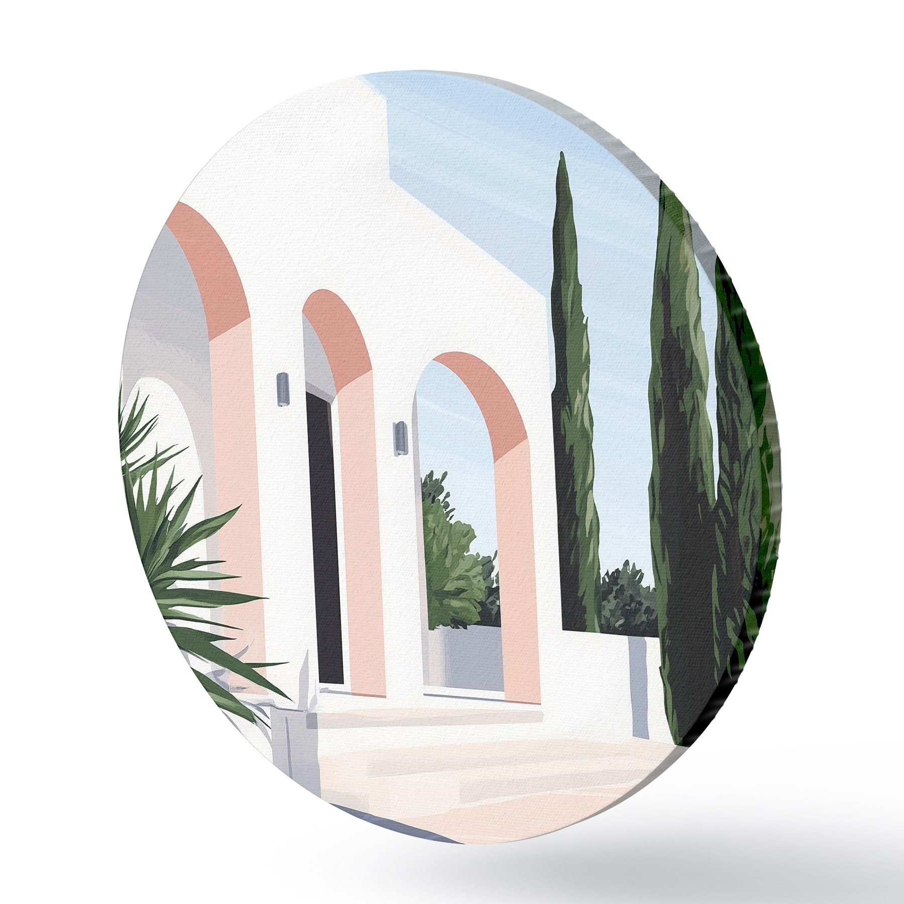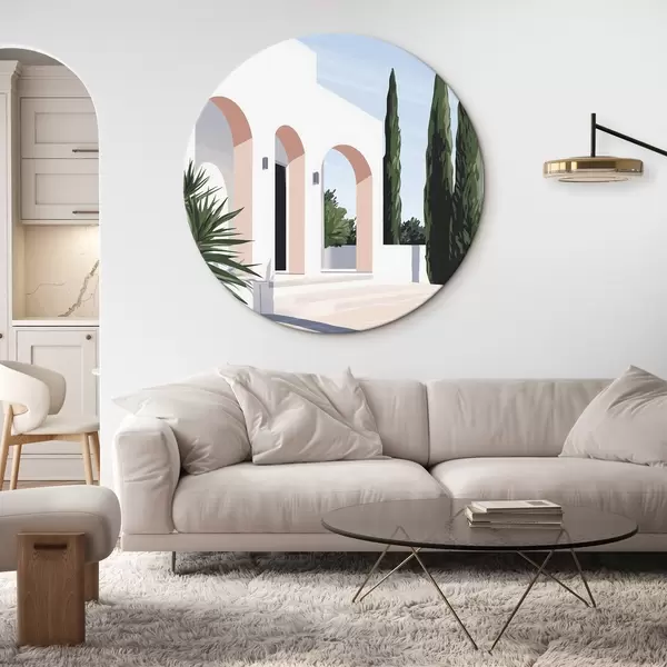 Runde Gemälde Weiße Villa mit Bögen und tropischem Garten, mediterraner, flacher Stil r44153