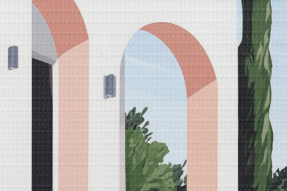 Bild Weiße Villa mit Bögen und tropischem Garten, mediterraner, flacher Stil Nr r44153