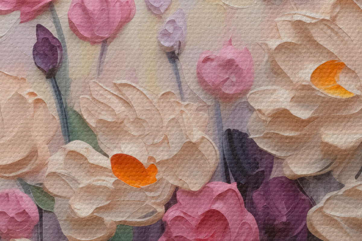 Drei Materialtypen stehen zur Verfügung: Economic Canvas - ein dichtes und haltbares Material für den Digitaldruck, identisch mit Malerleinwand, wasserfeste Oberfläche, realistische Wiedergabe von Details, mittelkörniges Material. Premium Canvas - die Textur ähnelt der einer Malerleinwand (verwobene kleine Fäden). Weiche, detaillierte Wiedergabe des Bildes auf einer matten Oberfläche. Eco-Premium - hochwertiges Gewebe aus 100% Baumwolle. Dank der natürlichen Baumwollfasern ist das Material langlebig und verschleißfest. Hervorragende Farbwiedergabe und Detailtreue.