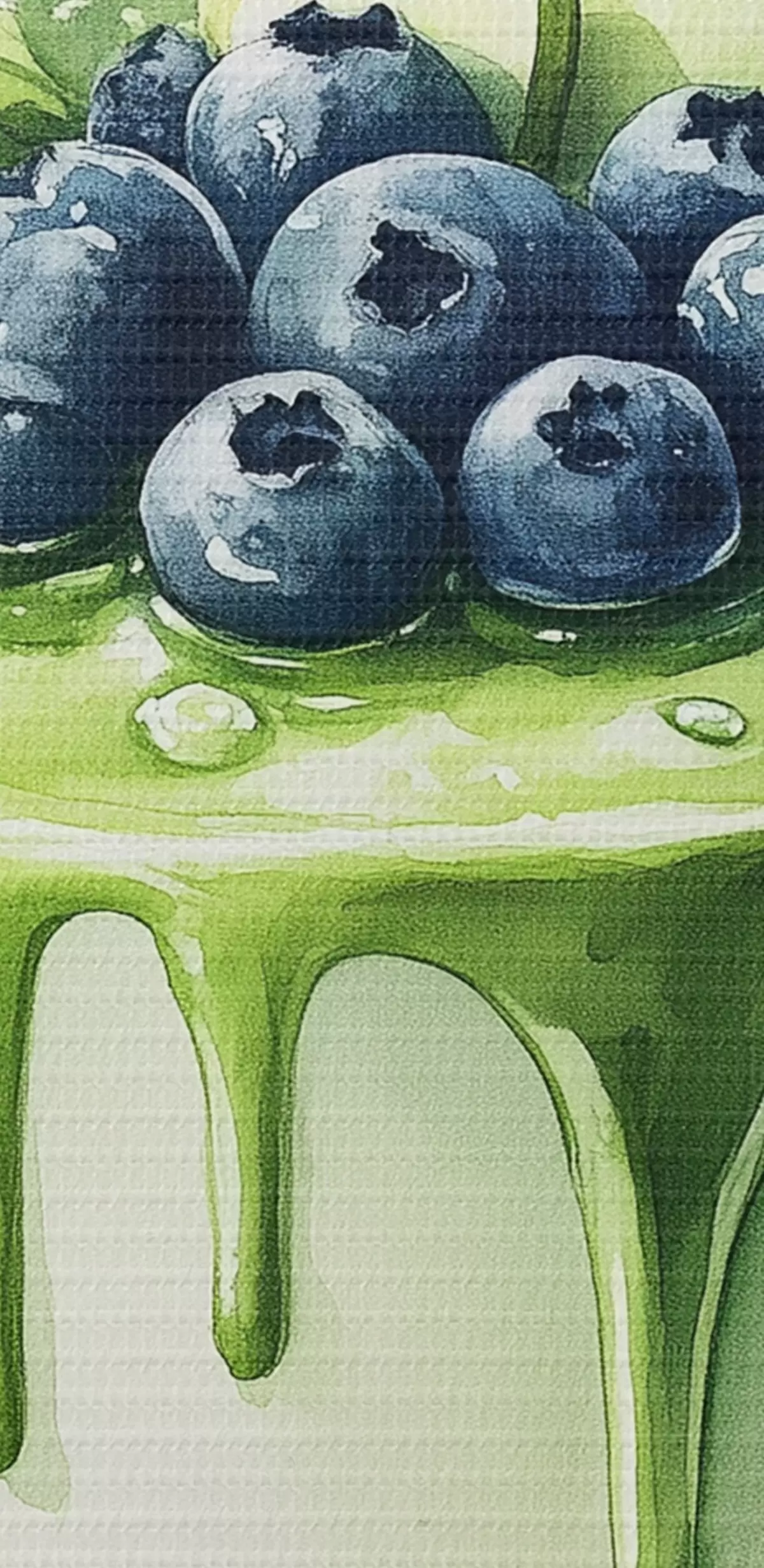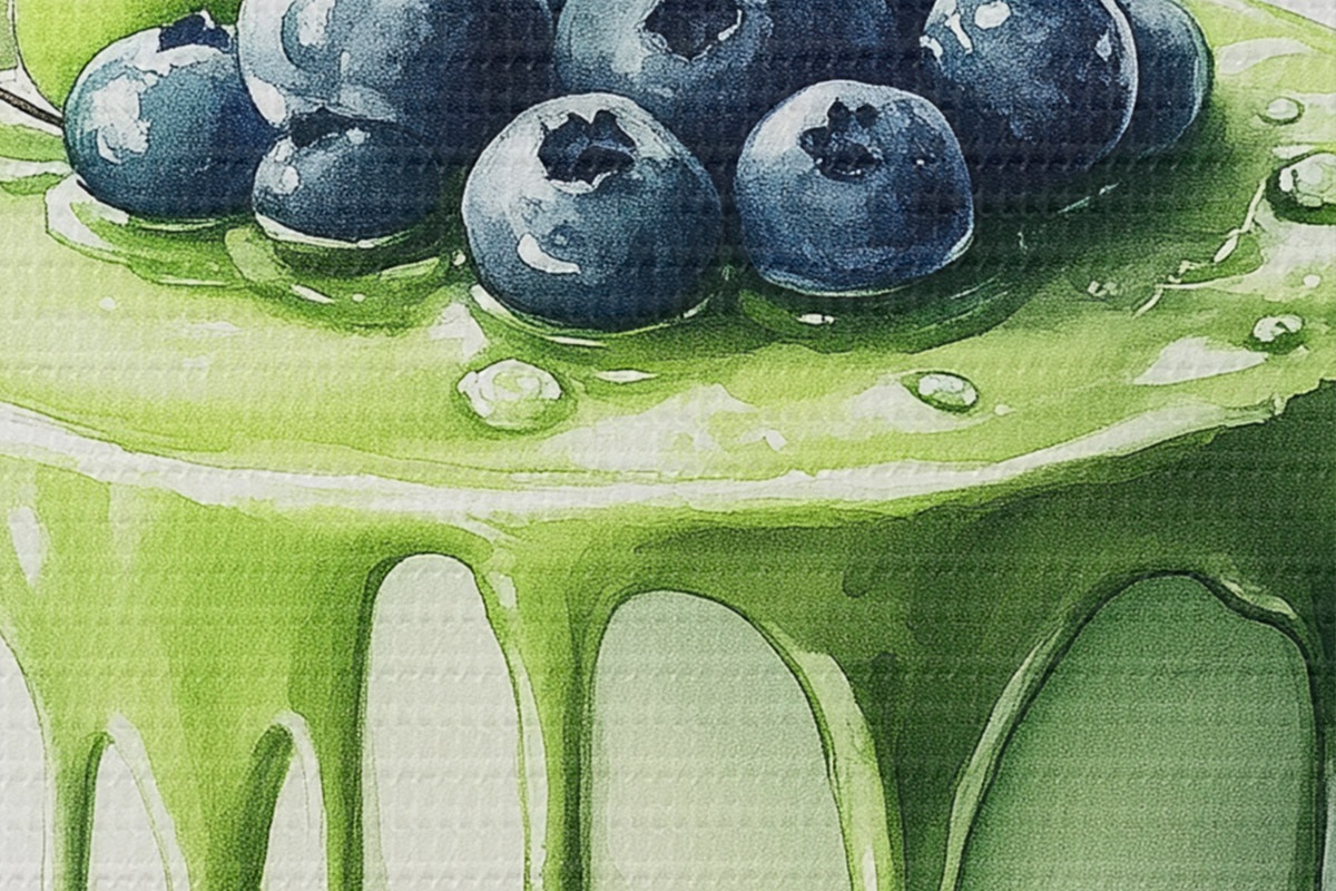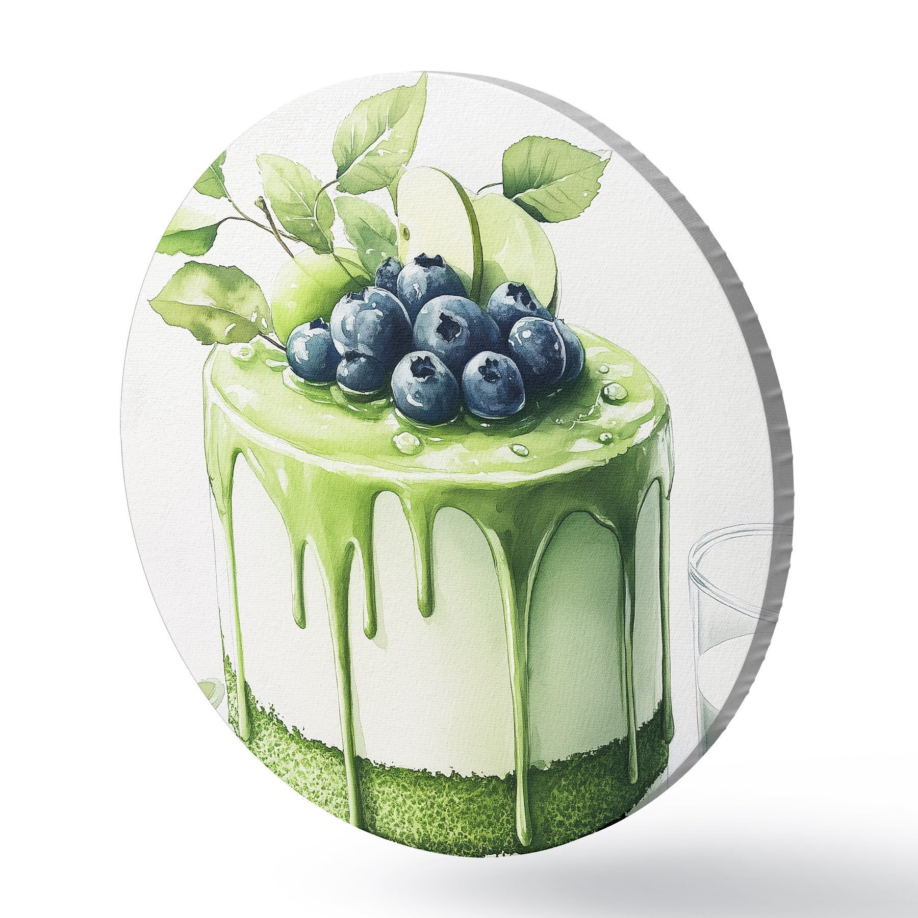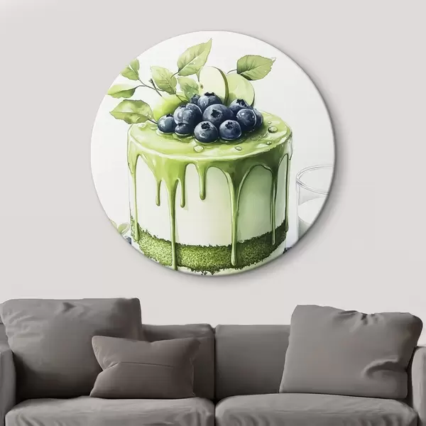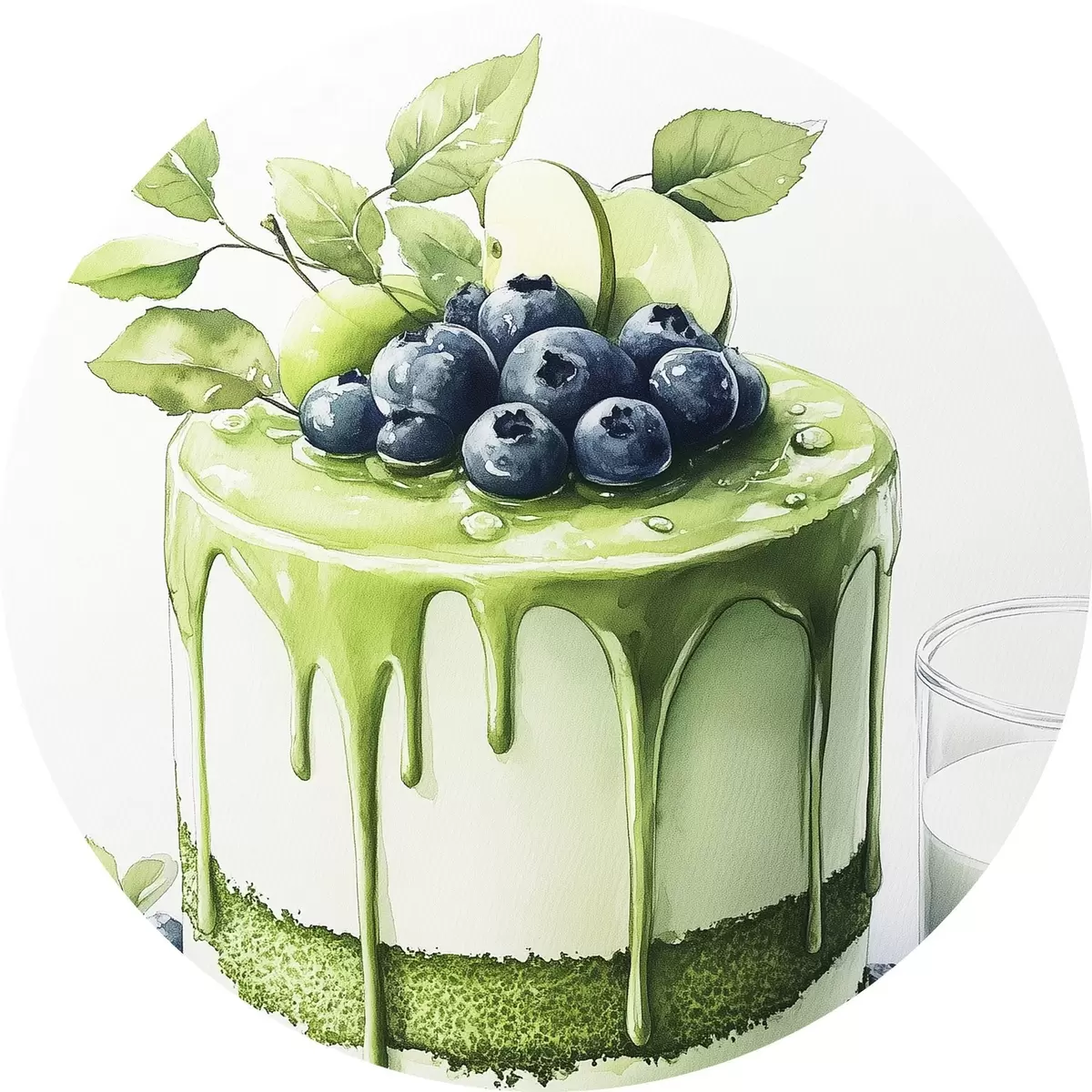 Runde Gemälde Matcha-Kuchen mit Blaubeeren und Äpfeln, Aquarellstil r44304