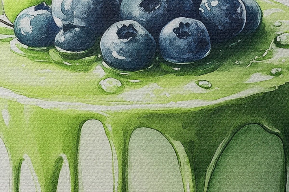 Bild Matcha-Kuchen mit Blaubeeren und Äpfeln, Aquarellstil Nr r44304