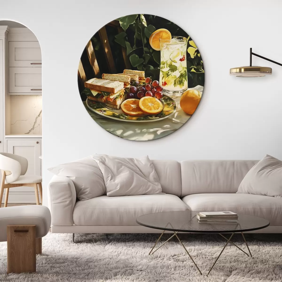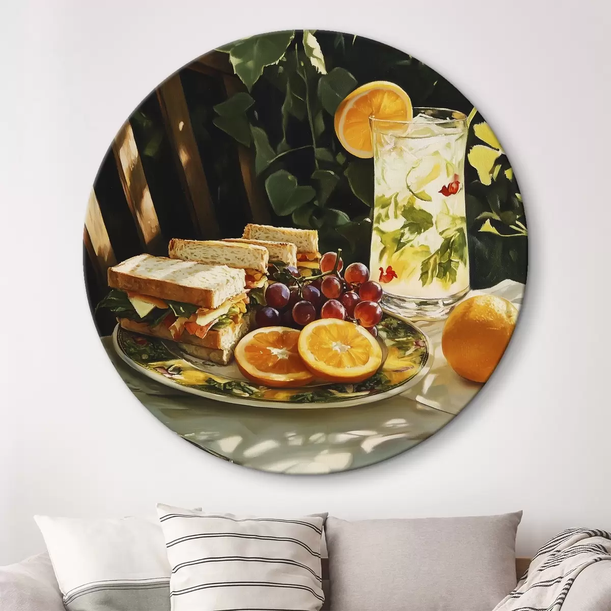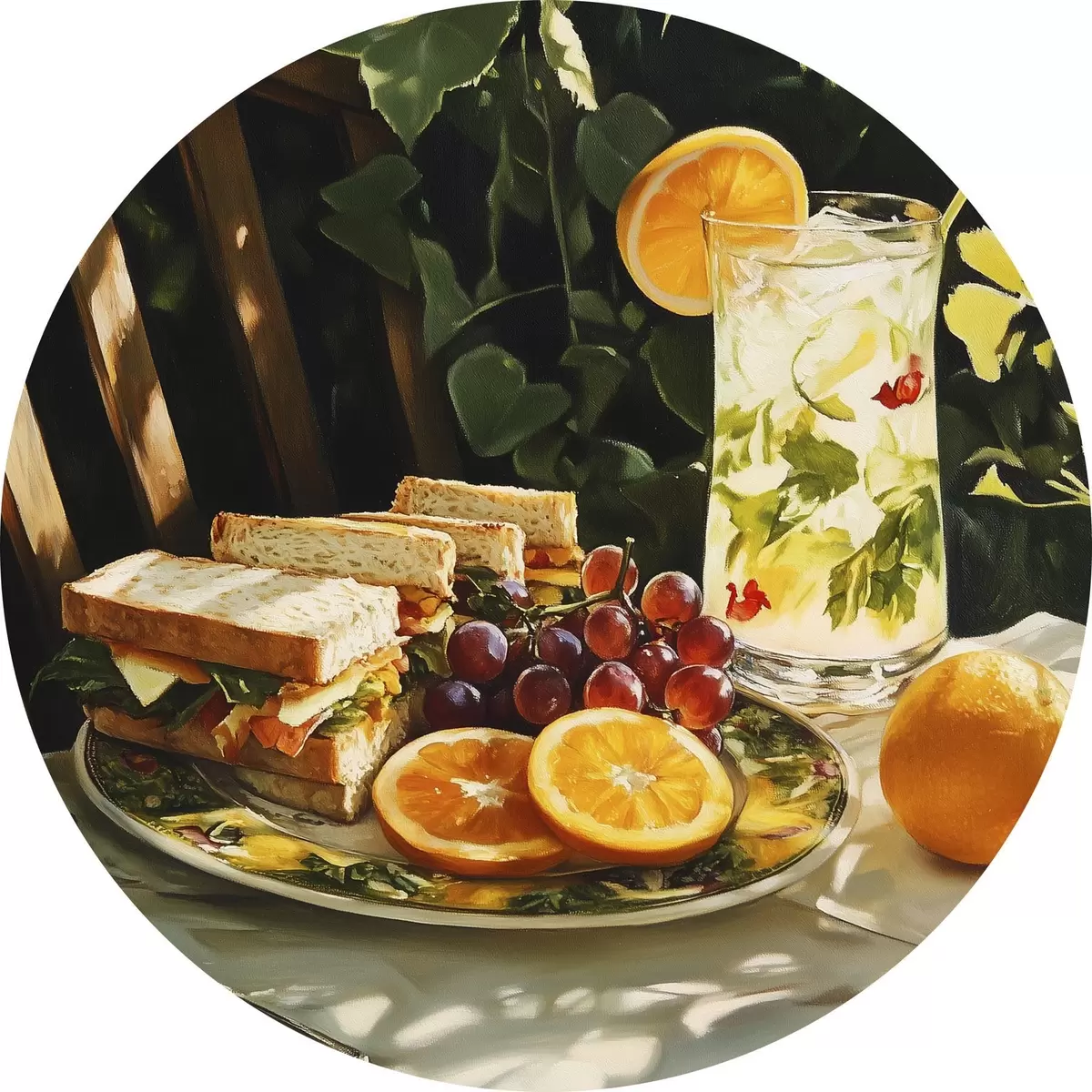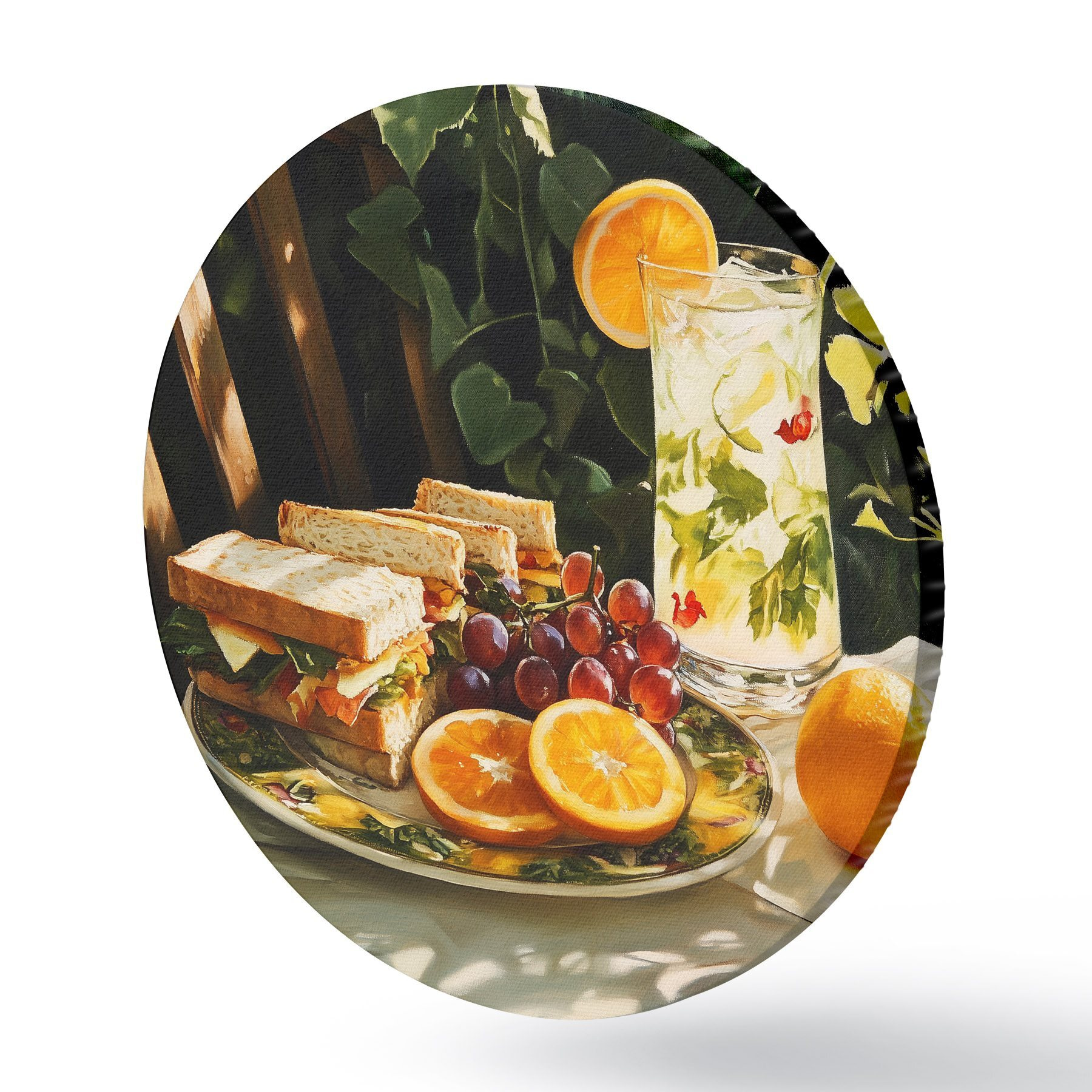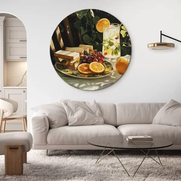 Runde Gemälde Ästhetisches Picknick im Sommergarten, belegte Brote, Orangen, Limonade r44306