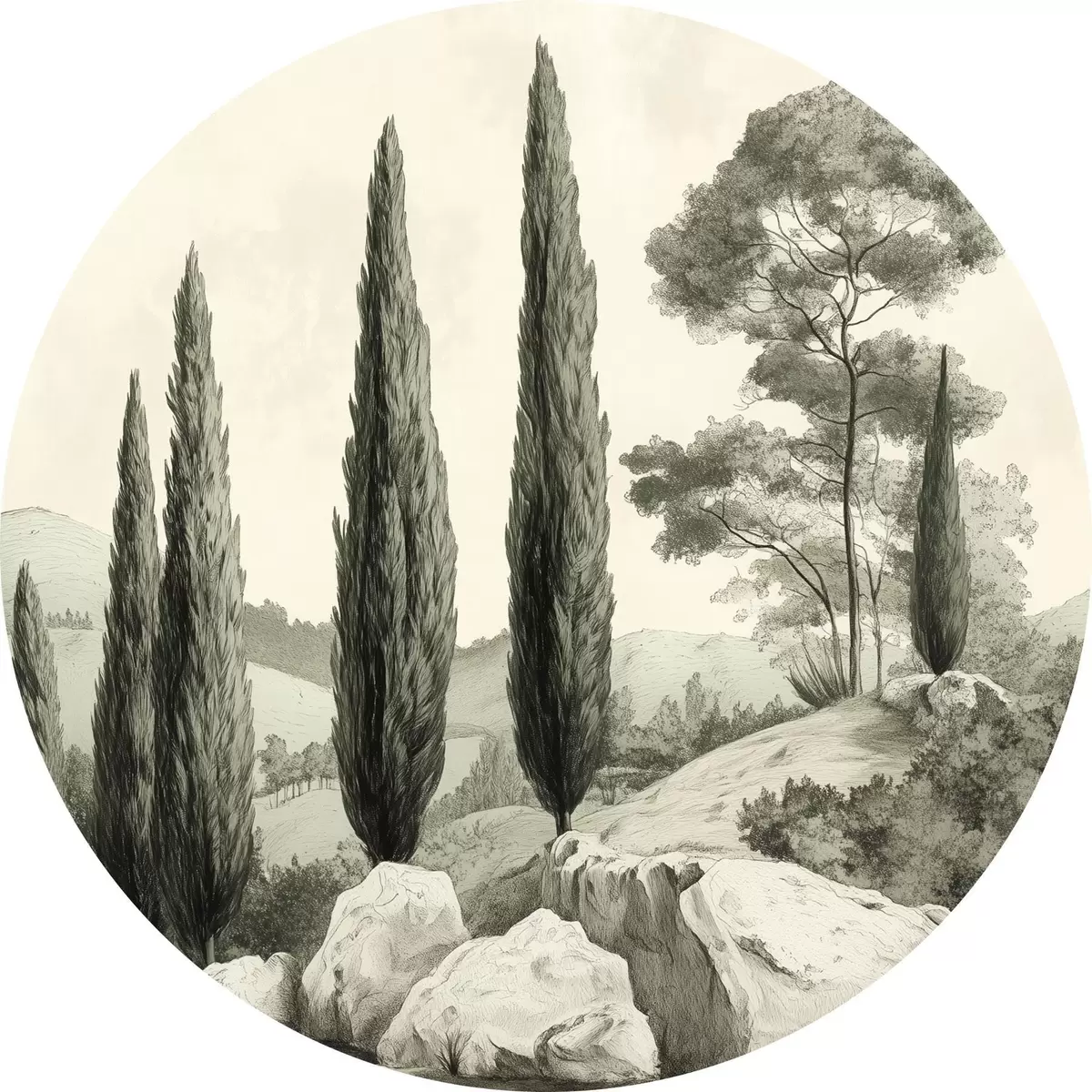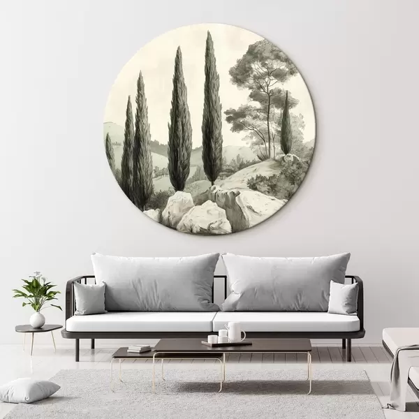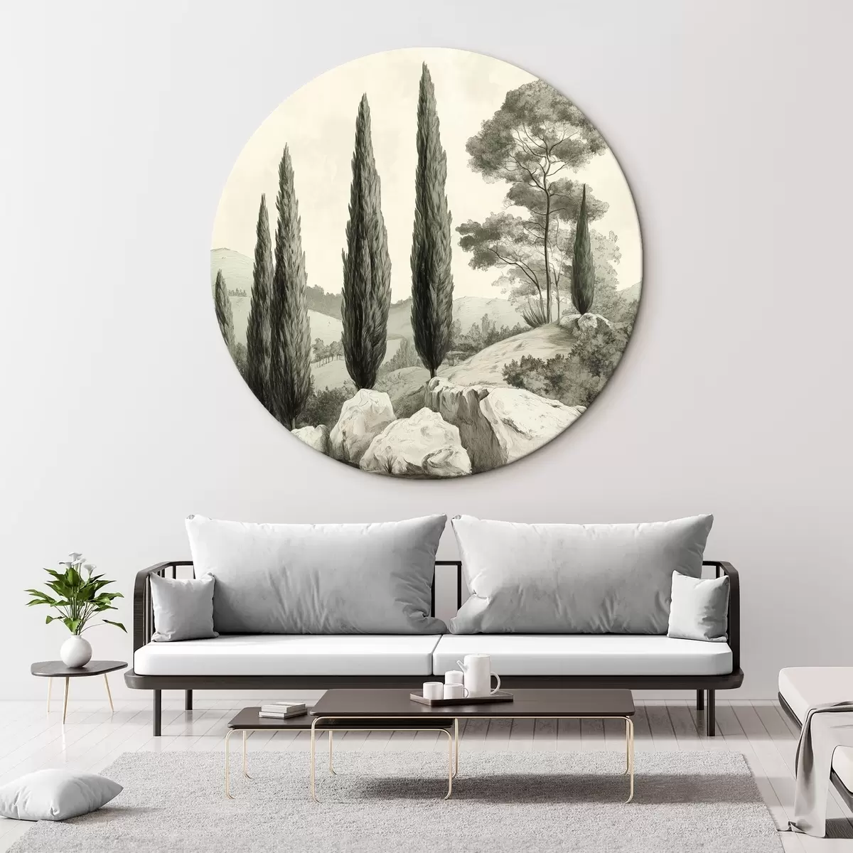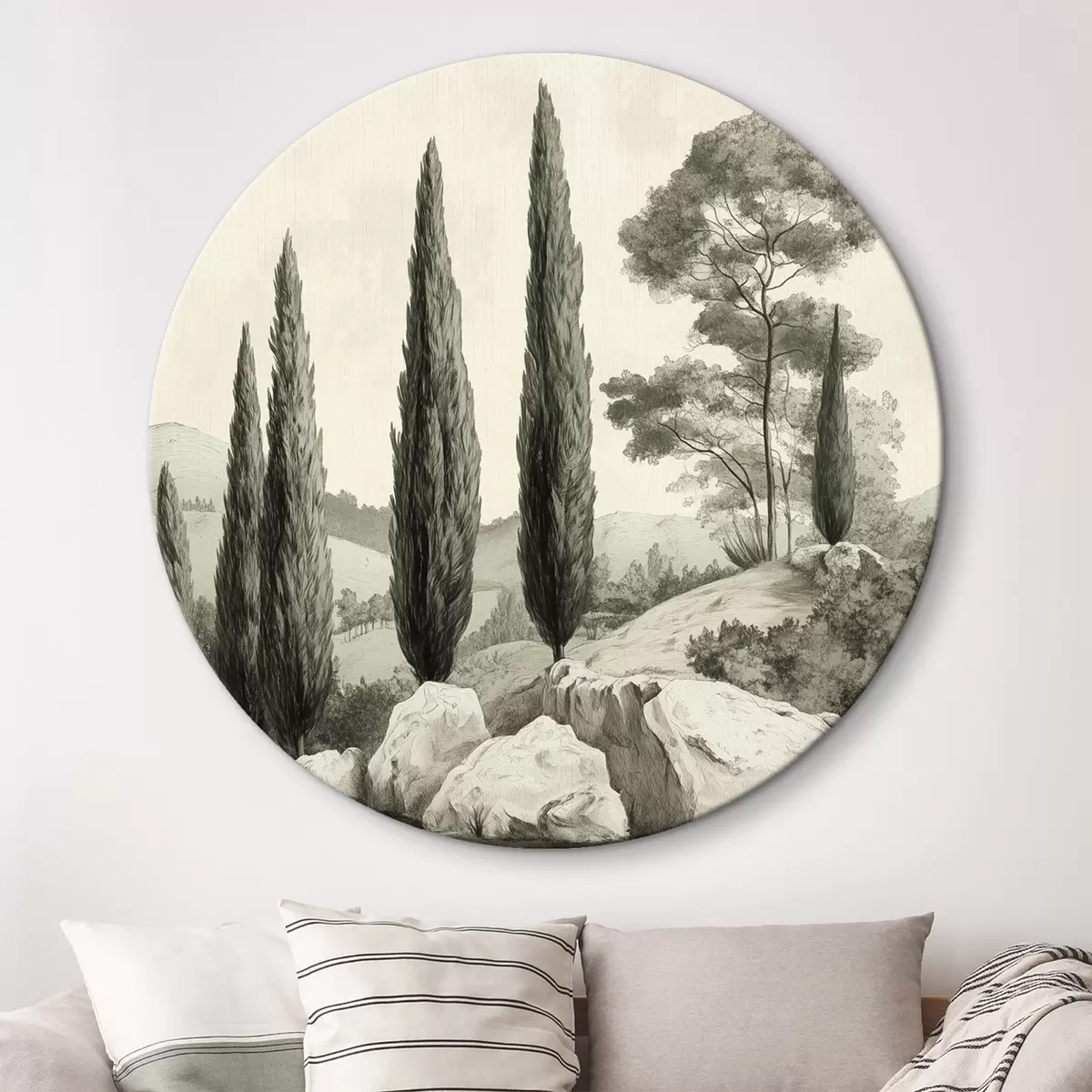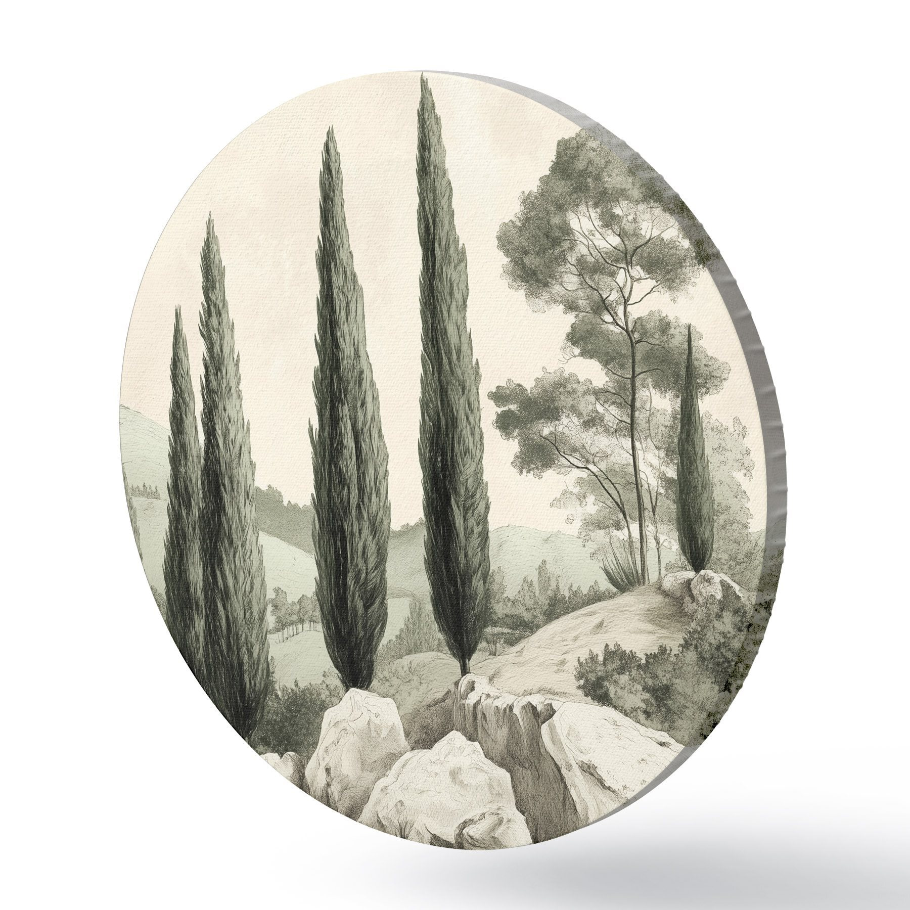 Runde Gemälde Landschaften der Toskana, Pastellfarben, Zypressen, Felsen, rustikaler Stil r44307