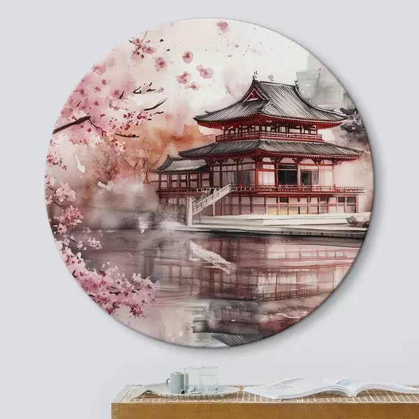 Runde Gemälde Schöne japanische Landschaft mit blühendem Kirschbaum und Haus am See r44310