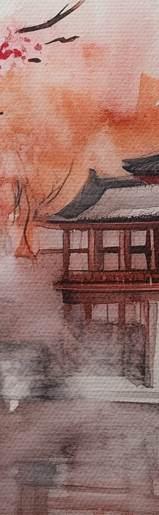 Bild Schöne japanische Landschaft mit blühendem Kirschbaum und Haus am See Nr r44310