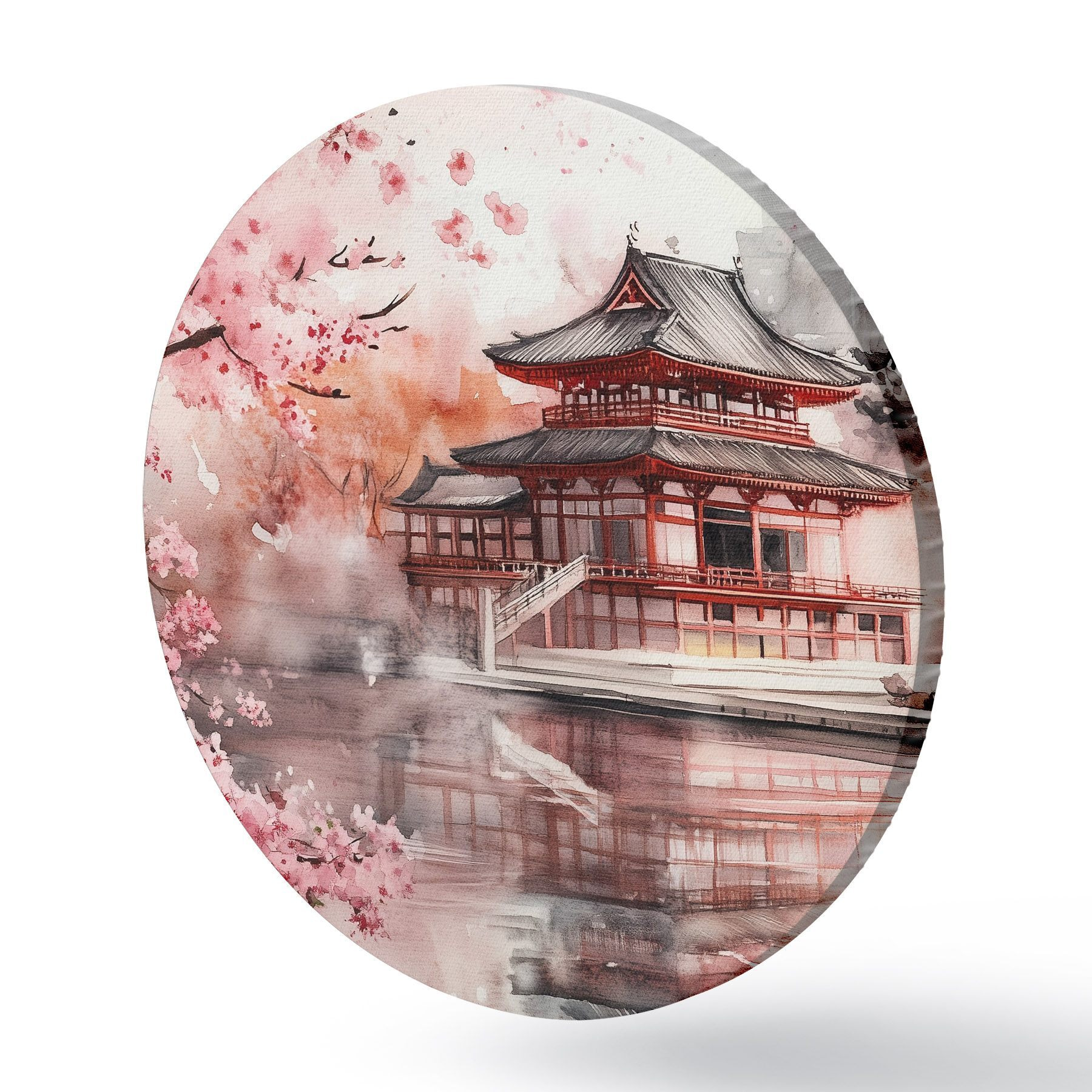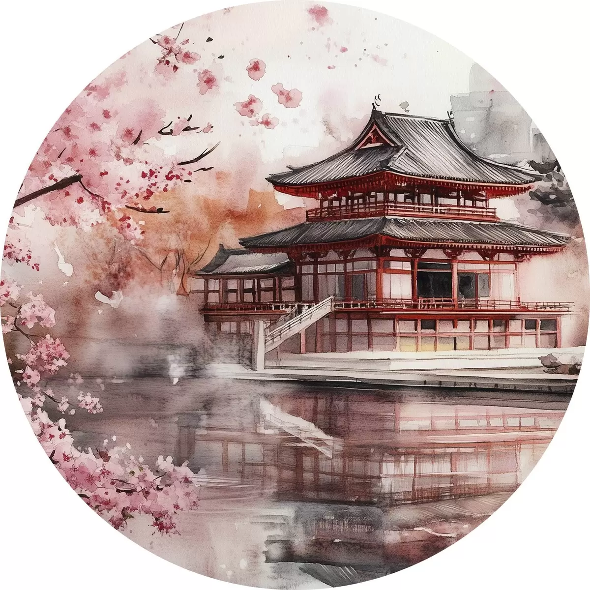 Runde Gemälde Schöne japanische Landschaft mit blühendem Kirschbaum und Haus am See r44310