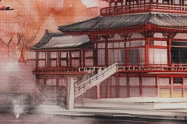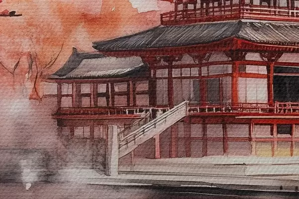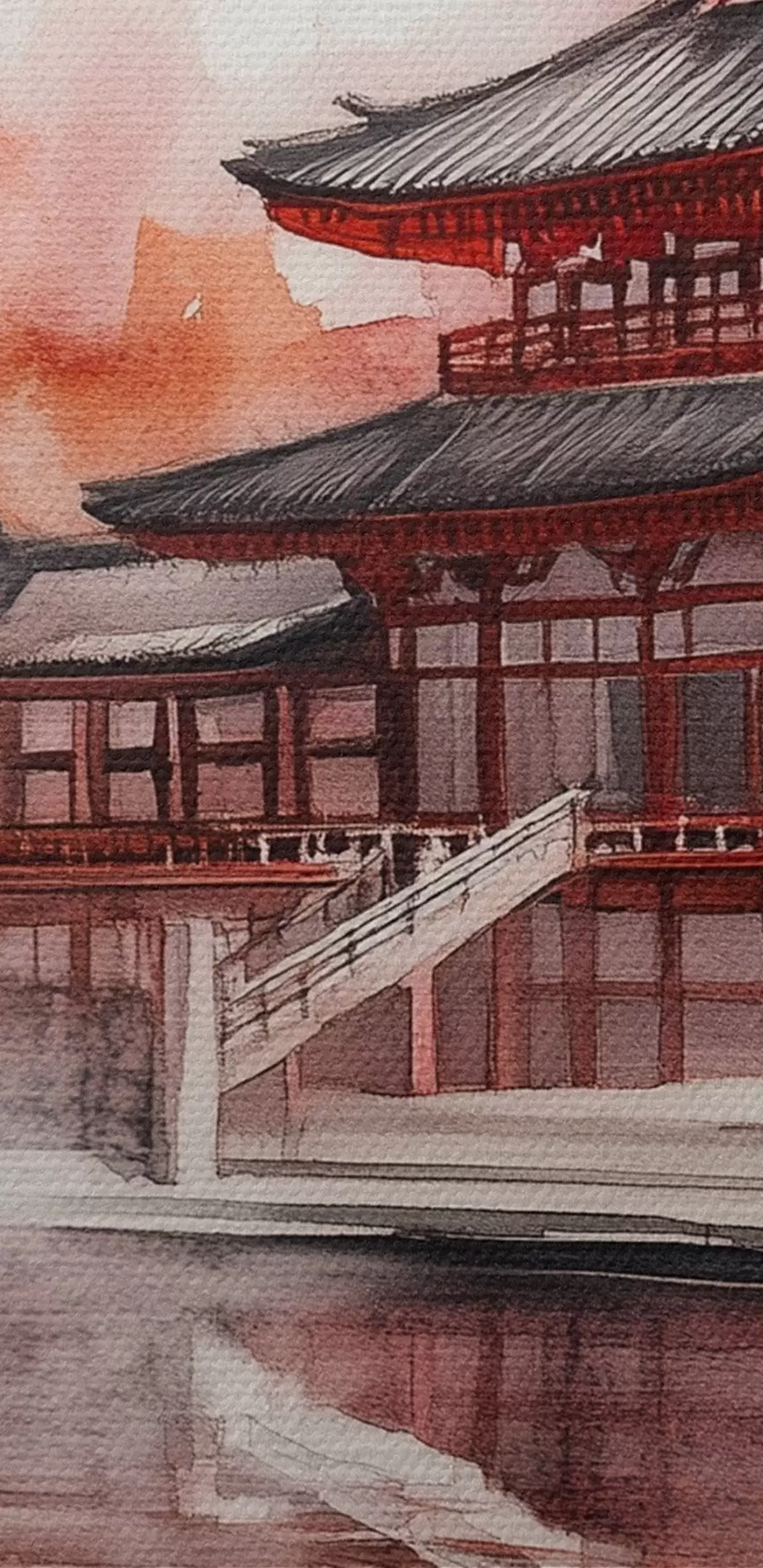 Bild Schöne japanische Landschaft mit blühendem Kirschbaum und Haus am See Nr r44310