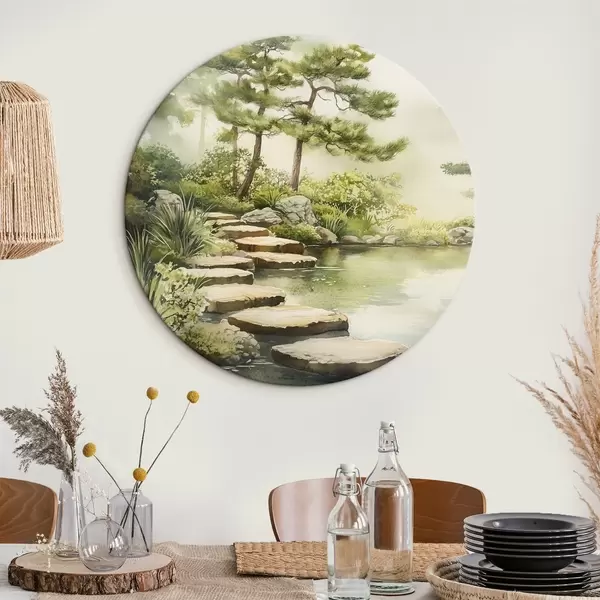 Runde Gemälde Orientalischer Garten mit See und Bäumen, Natur, Aquarellstil r44313