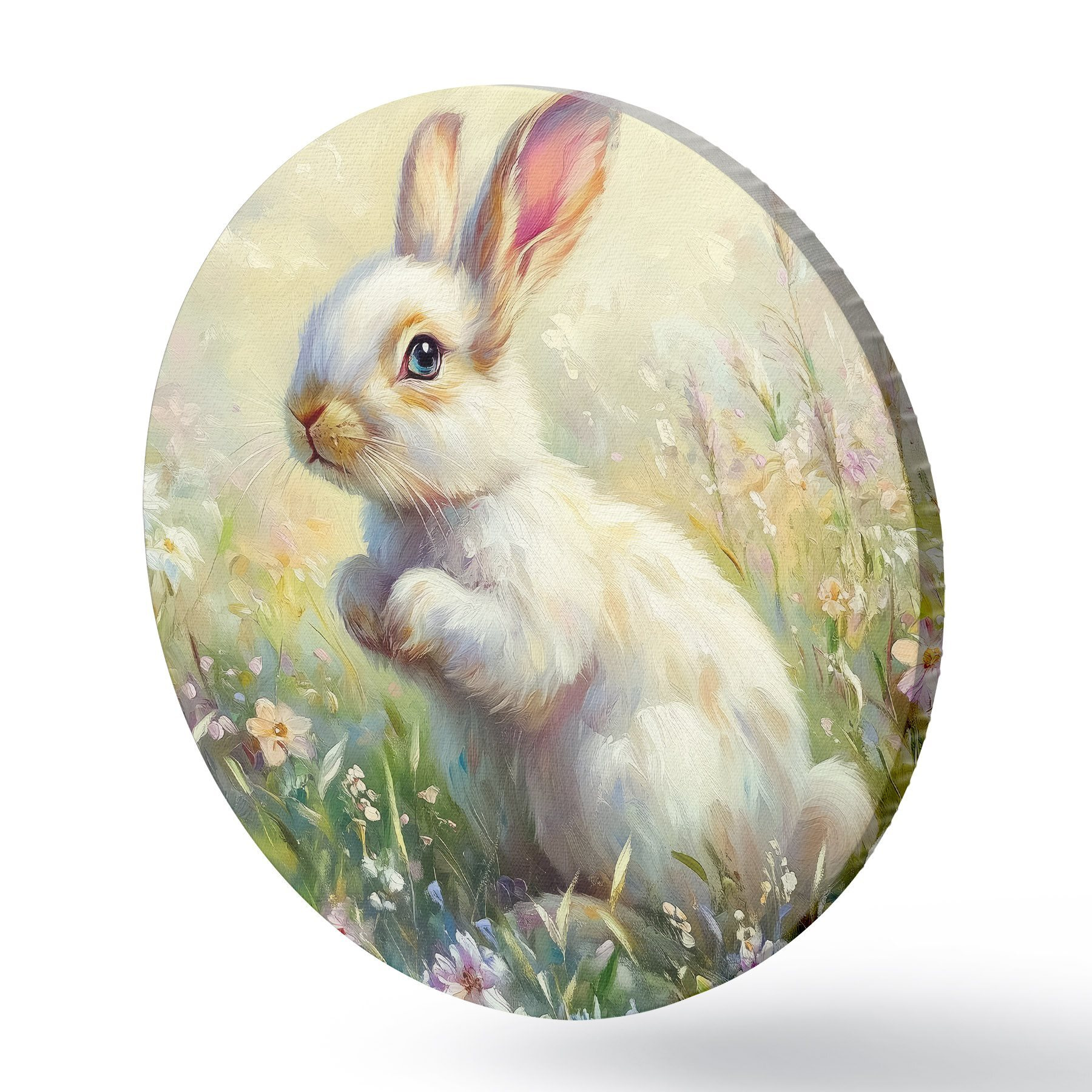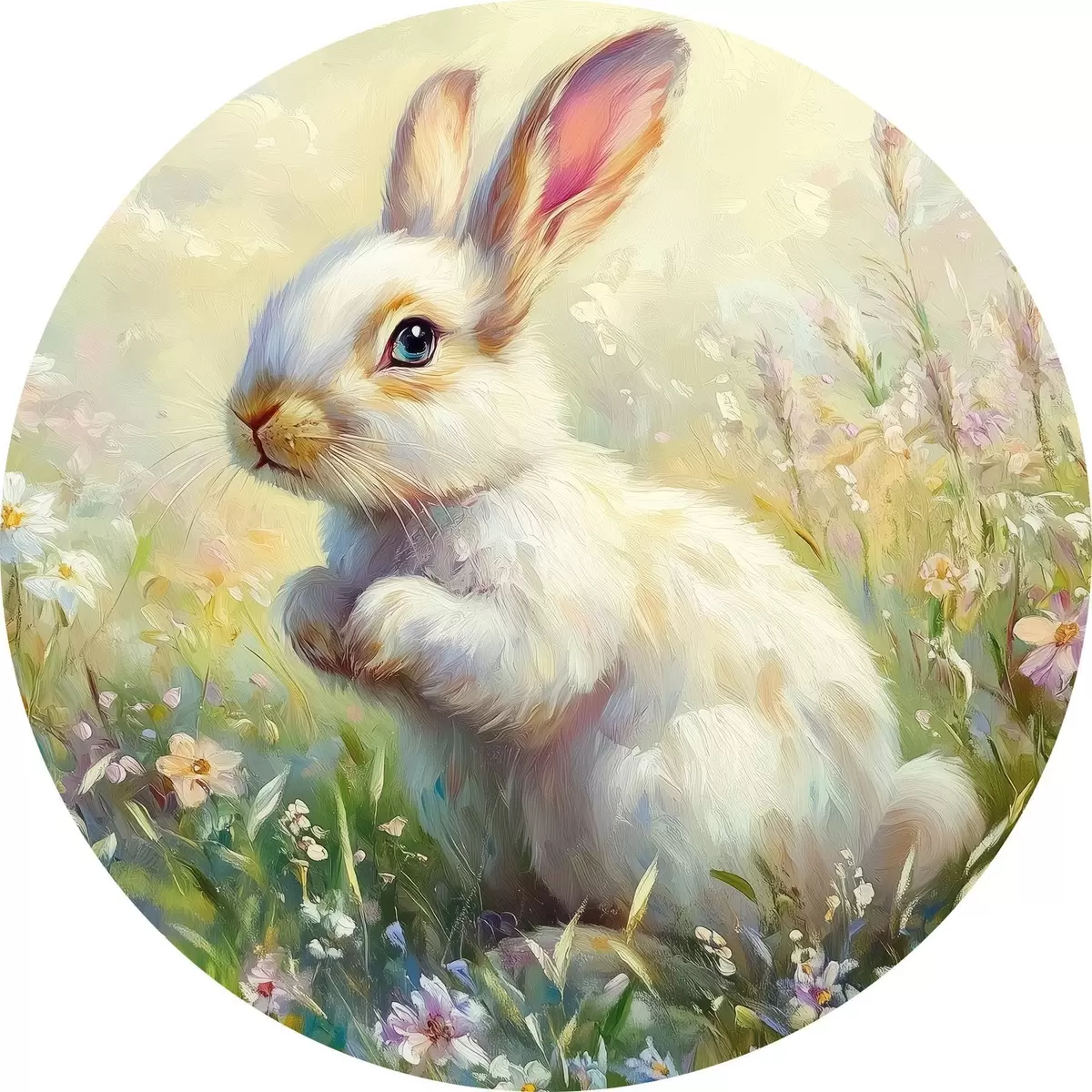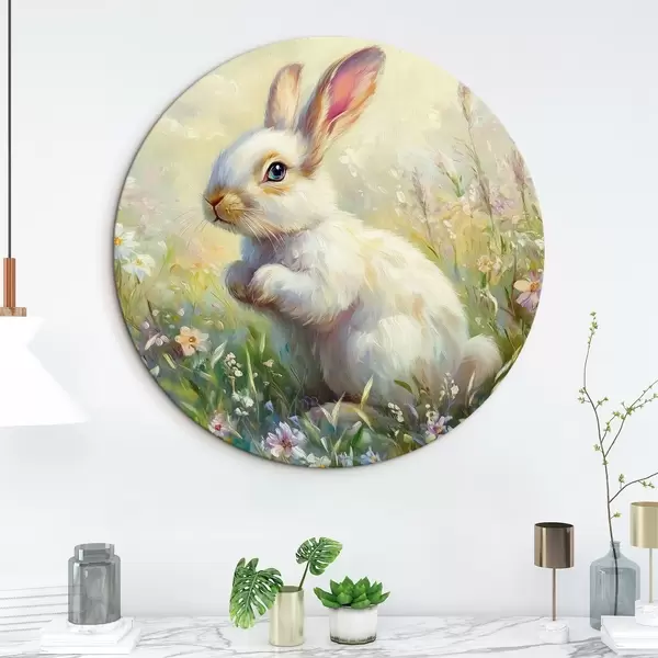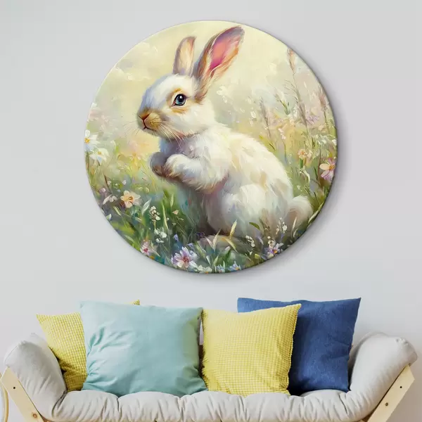Runde Gemälde Weißer Hase inmitten von Blumen r44326