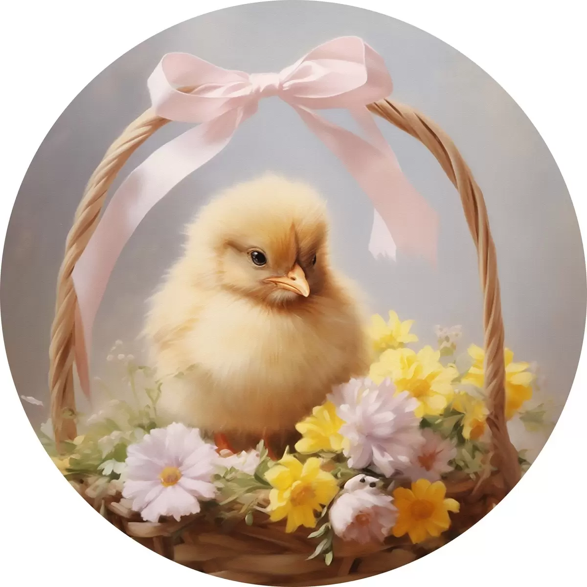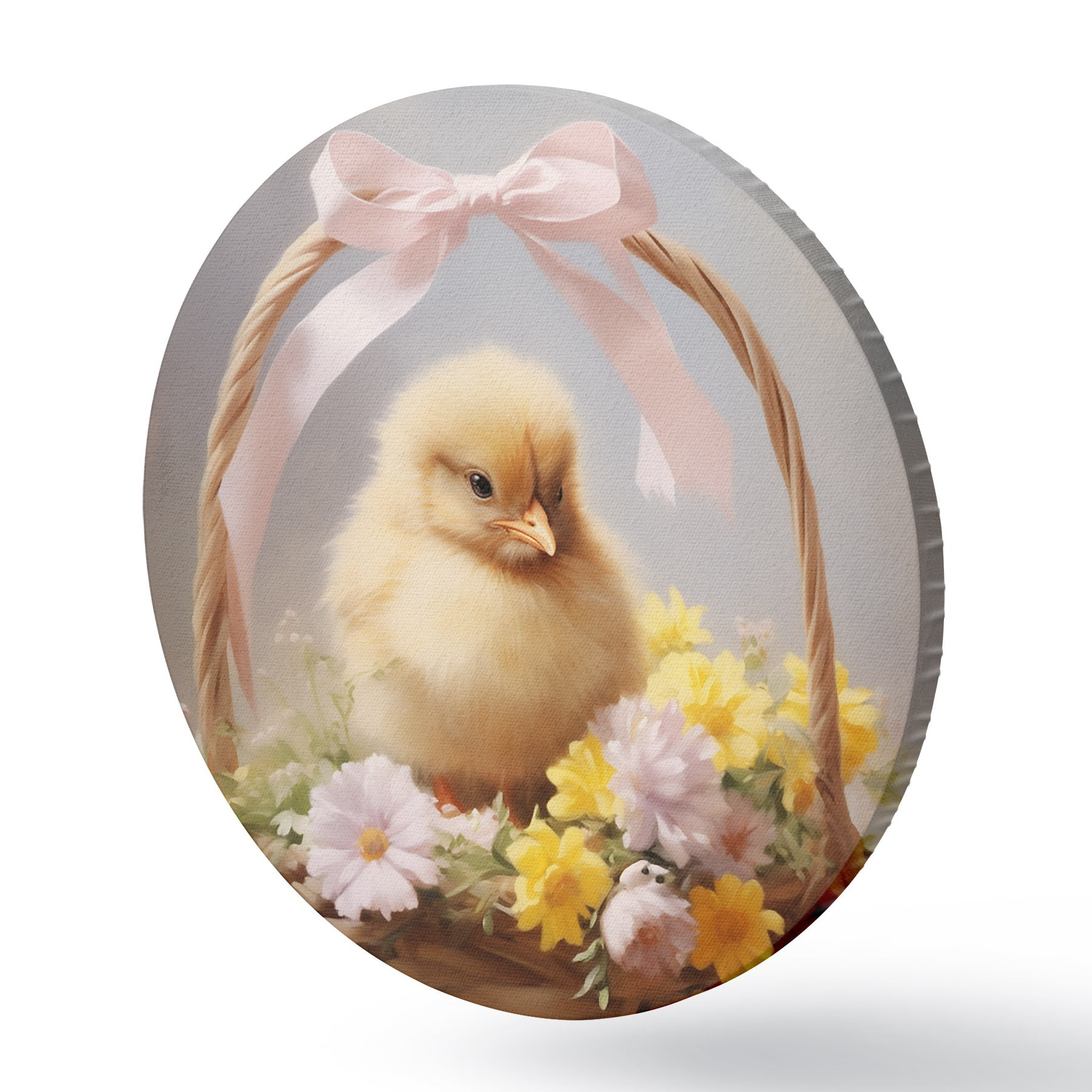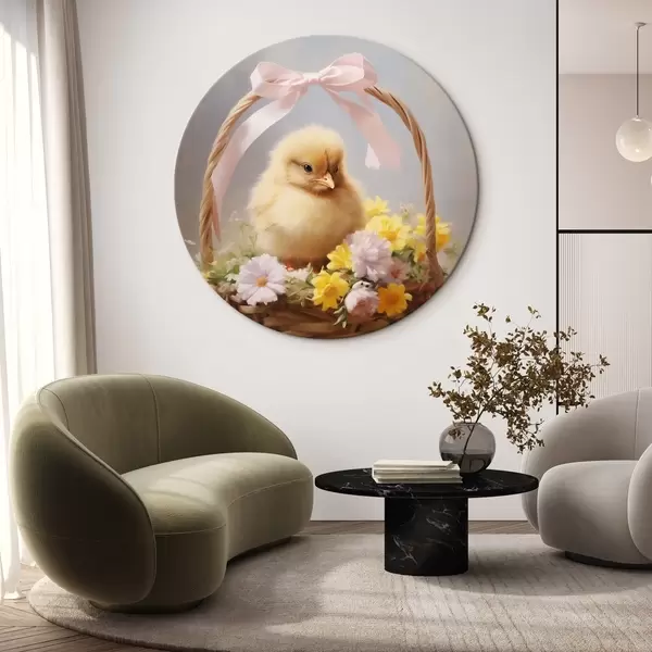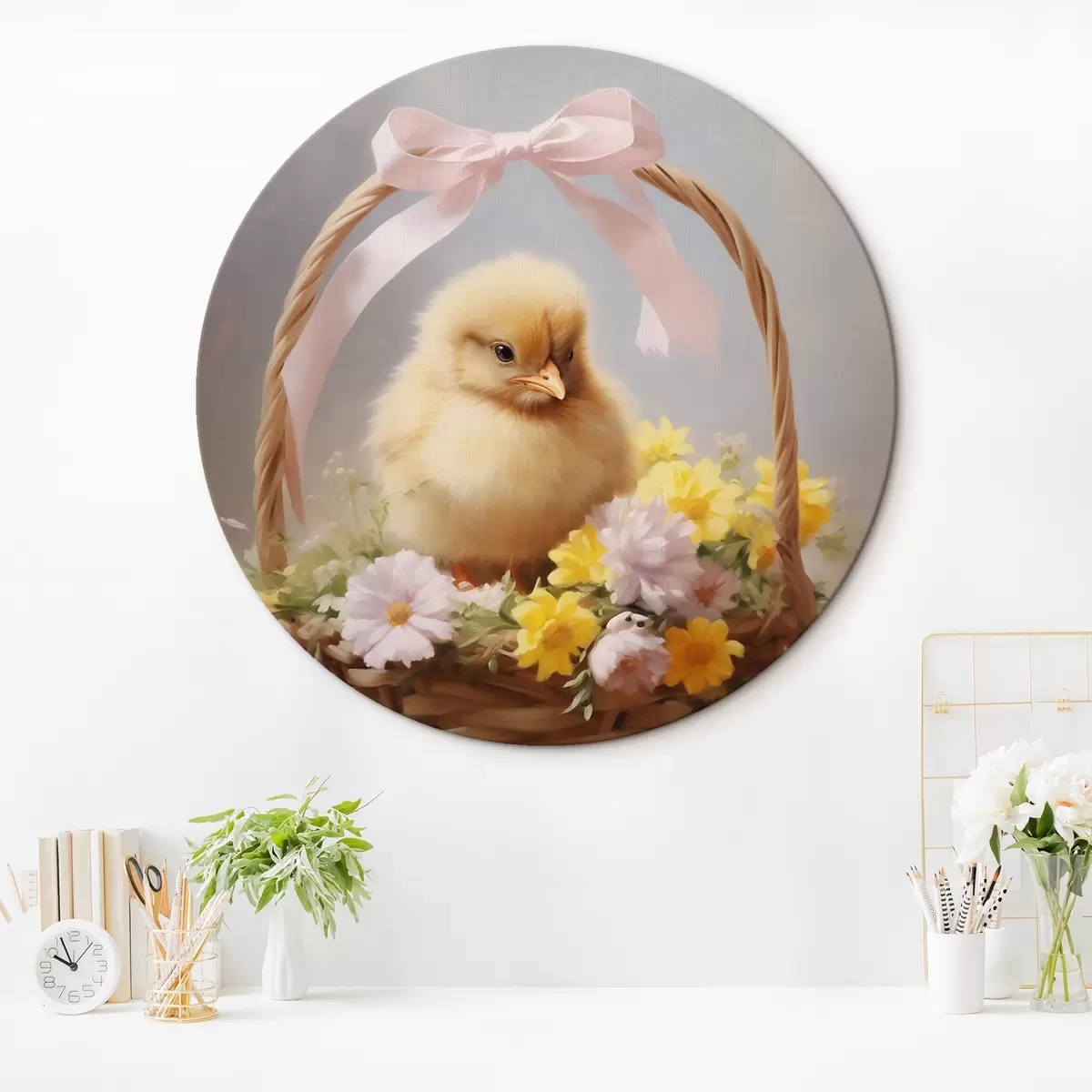 Runde Gemälde Gelbes Küken in einem Korb mit Wildblumen r44384