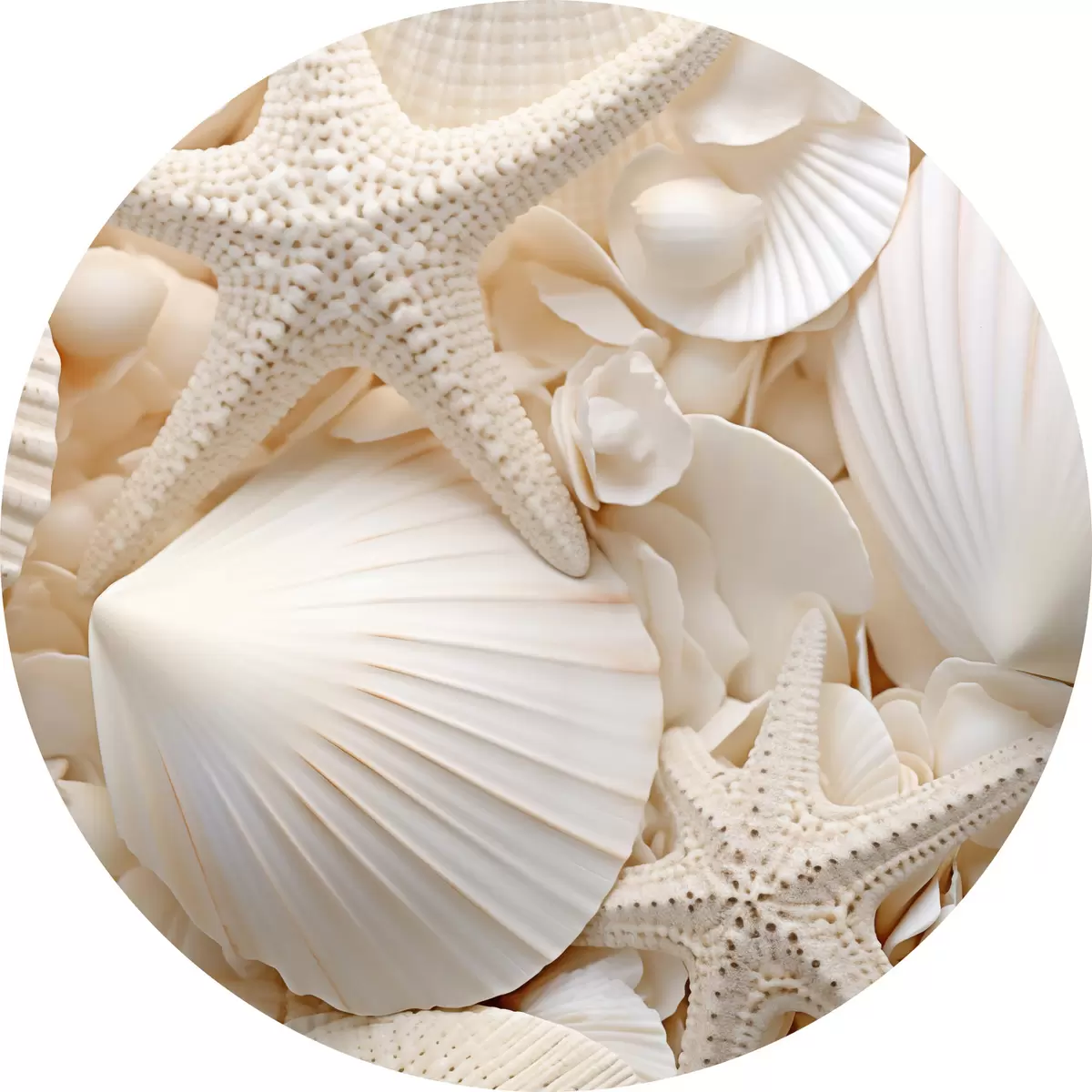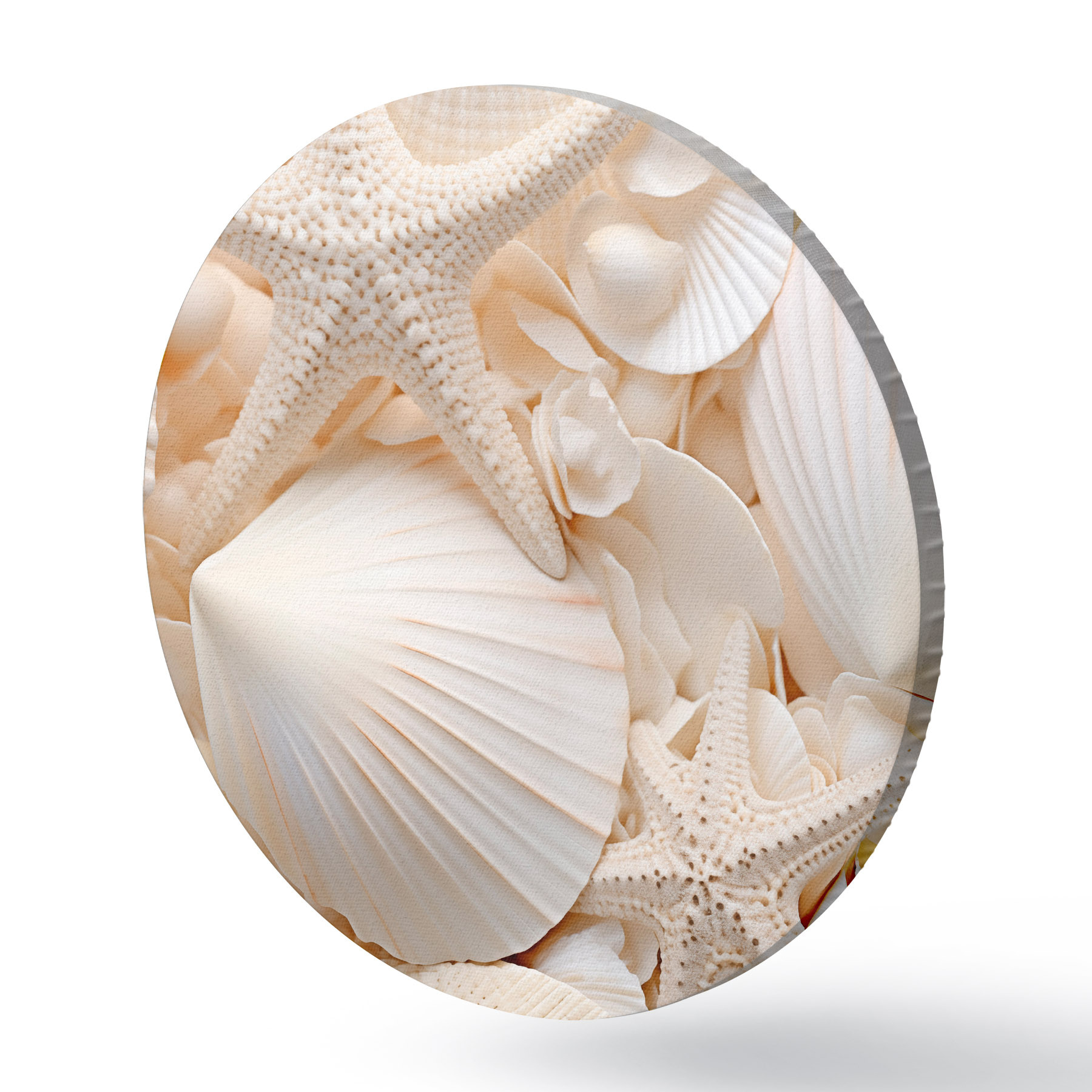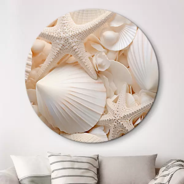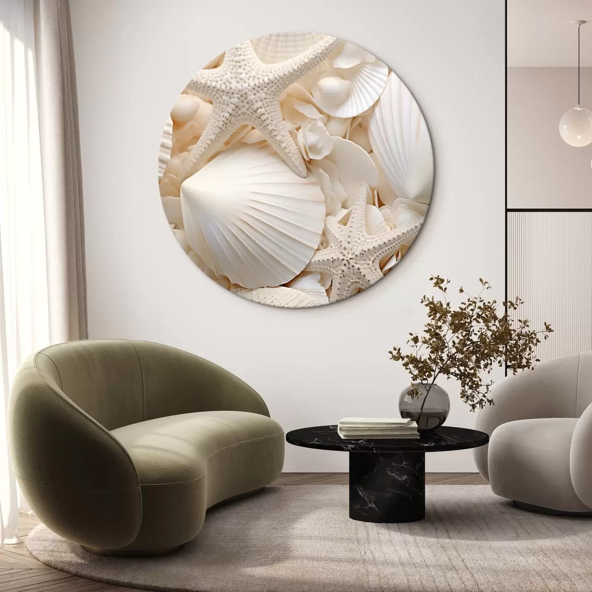 Runde Gemälde Dekorative weiße Muscheln und Seesterne, die eine strukturierte monochromatische Komposition bilden r44392