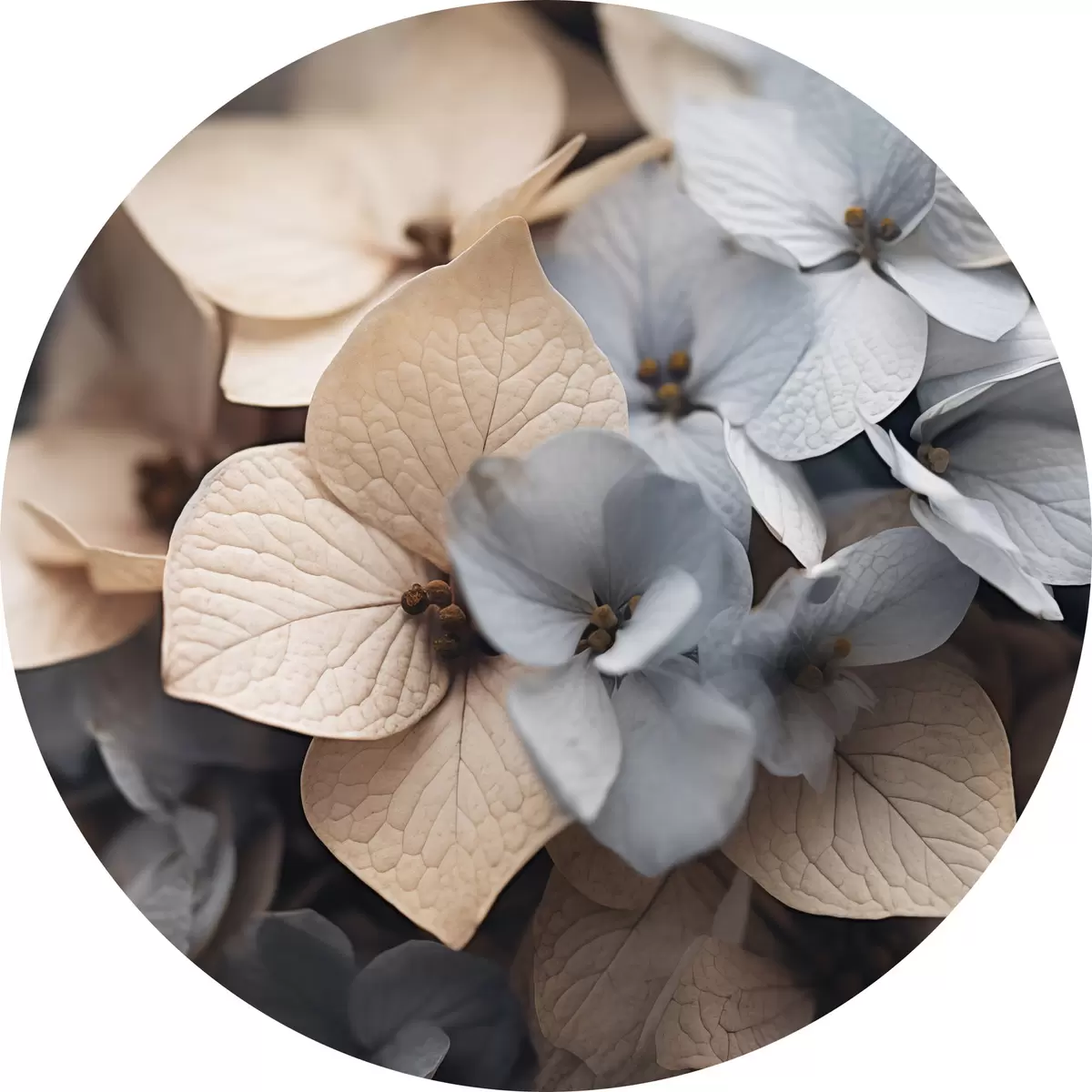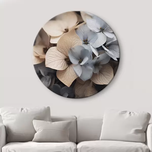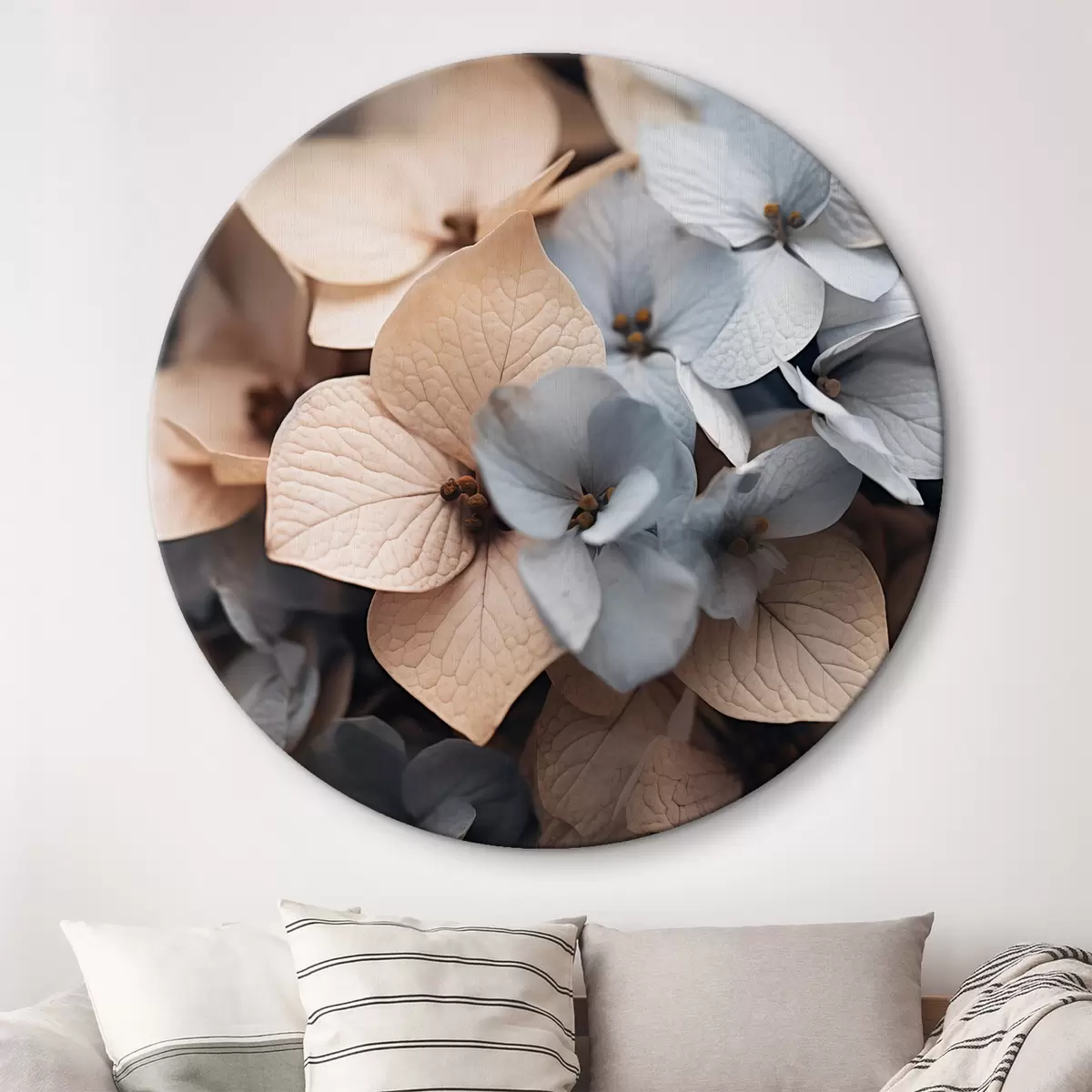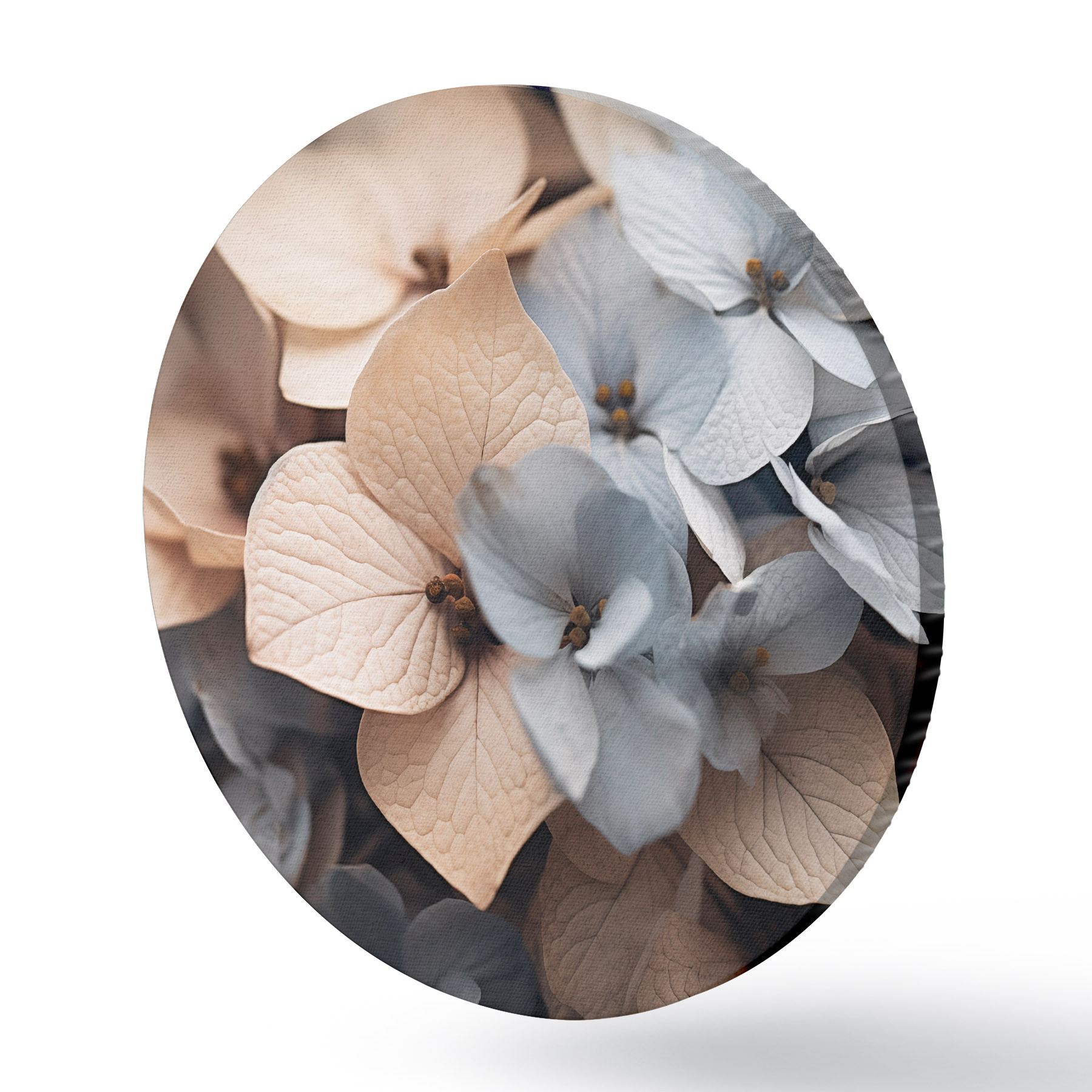 Runde Gemälde Hortensienblüten, hellblaue und beige Blütenblätter, mit detaillierten Texturen, elegantes Blumenarrangement r44394