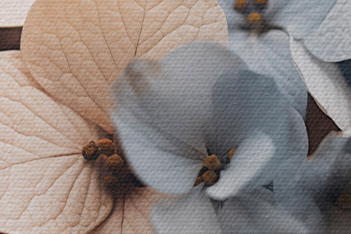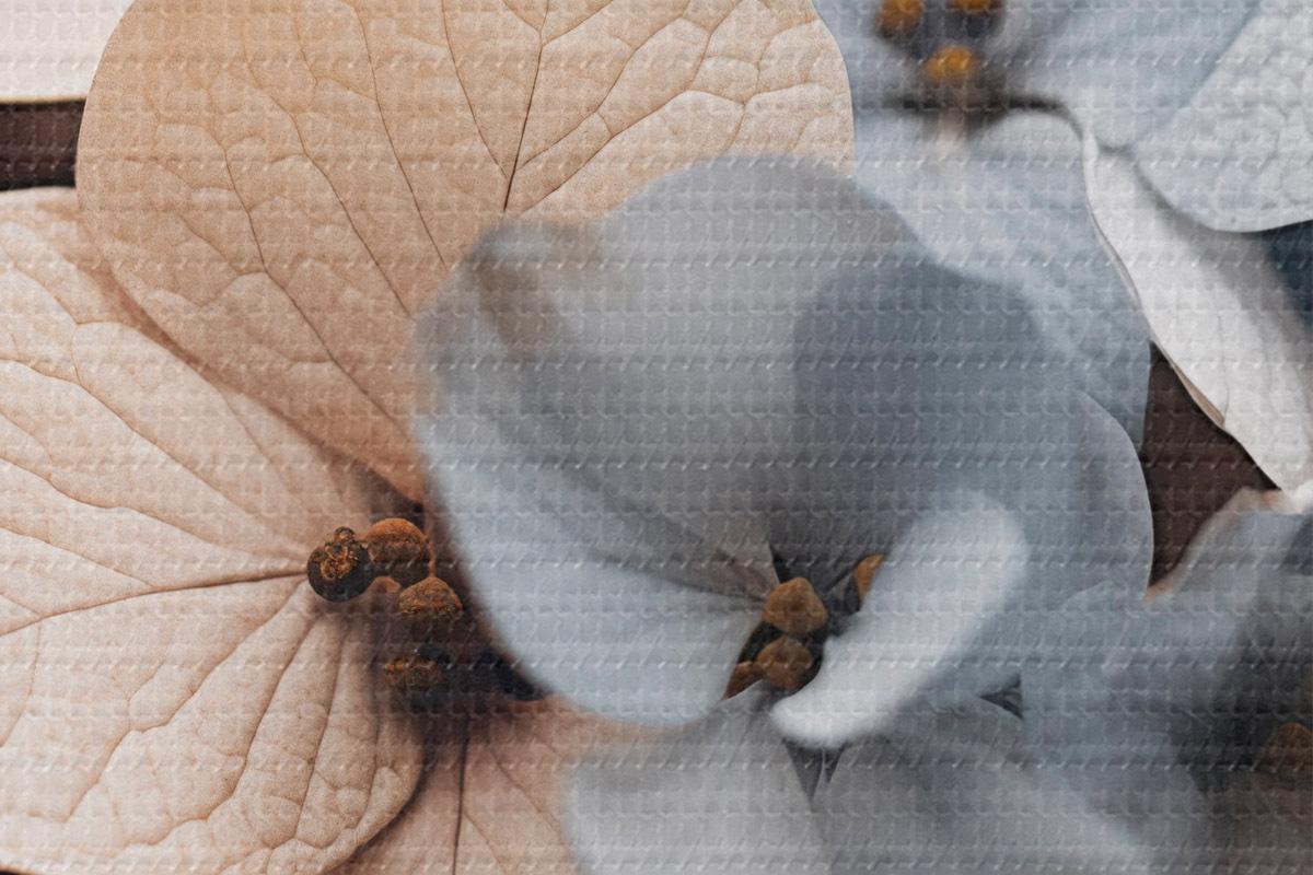 Bild Hortensienblüten, hellblaue und beige Blütenblätter, mit detaillierten Texturen, elegantes Blumenarrangement Nr r44394