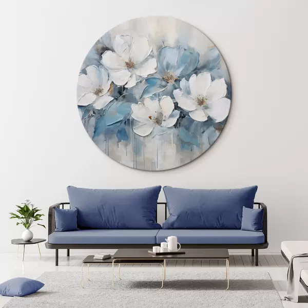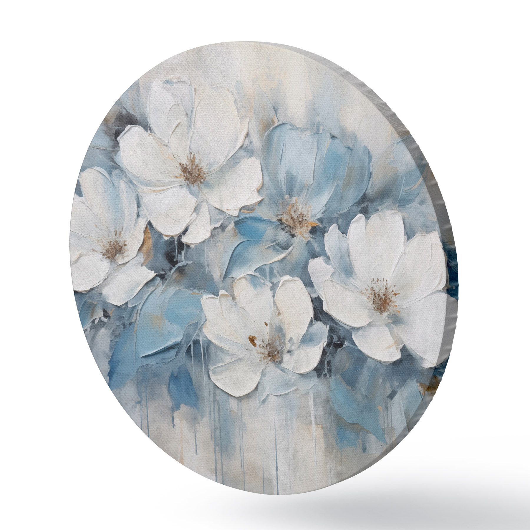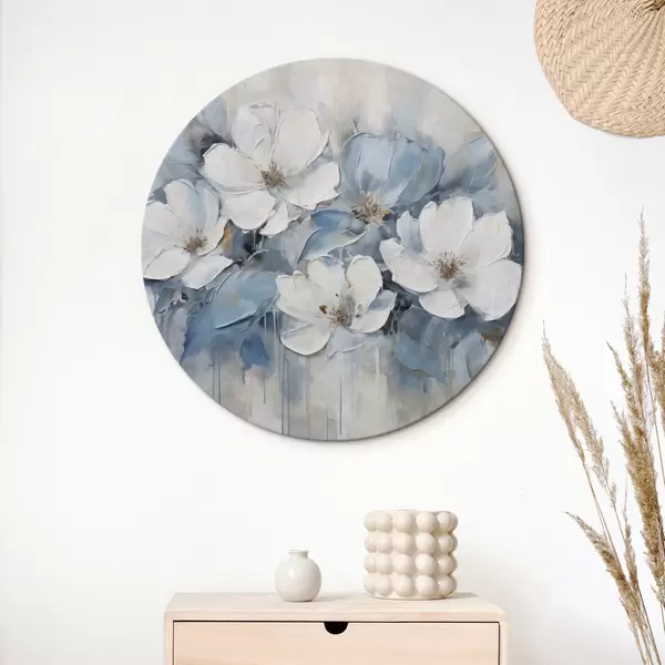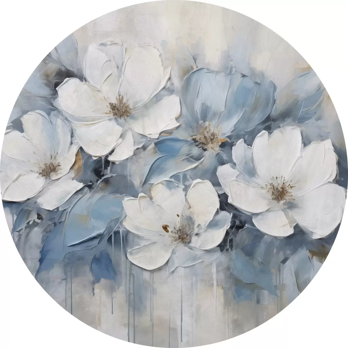 Runde Gemälde Weiße Blumen mit blauen Blättern, auf einem hellbeigen Hintergrund, mit sichtbaren Pinselstrichen r44395