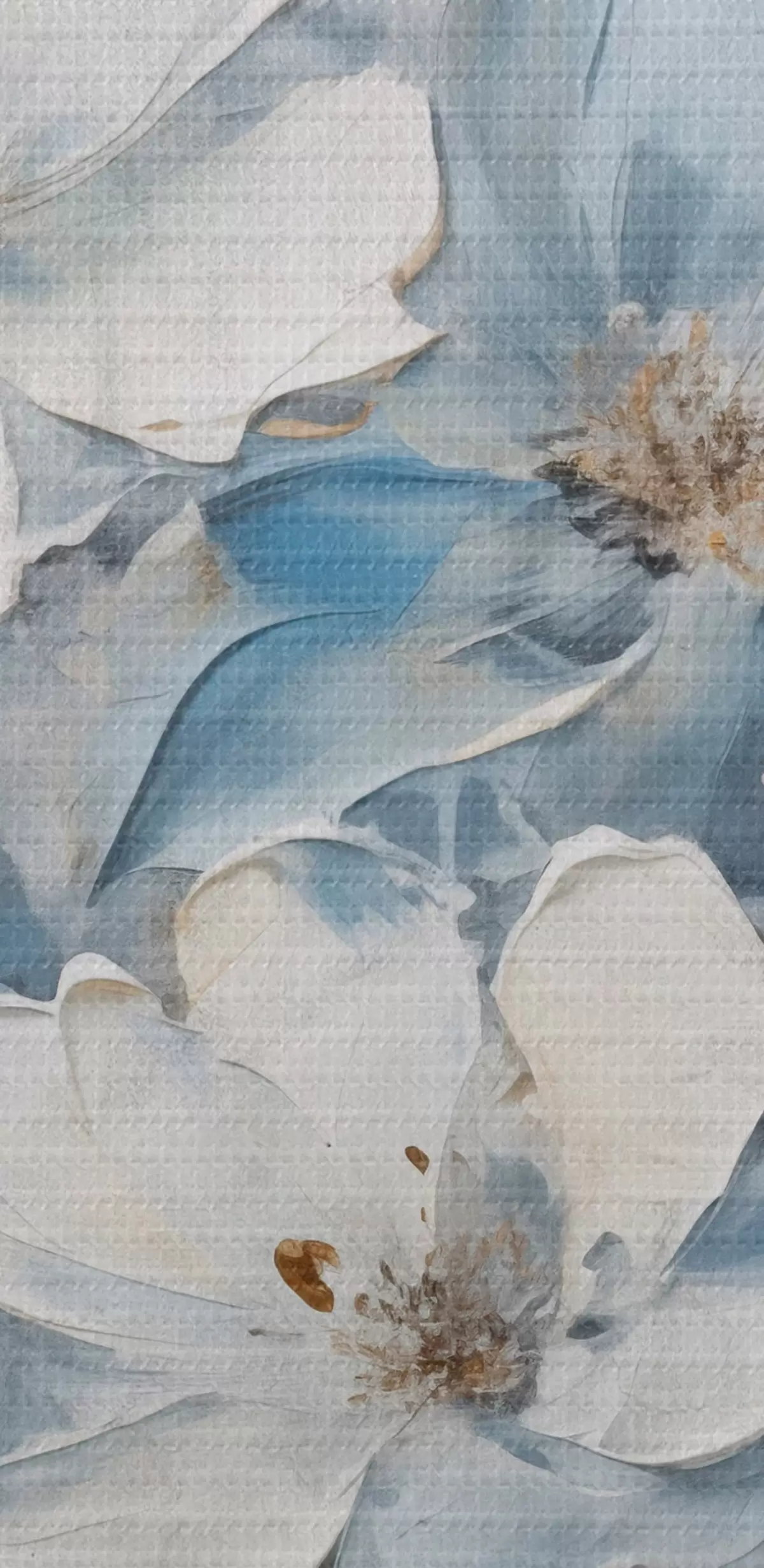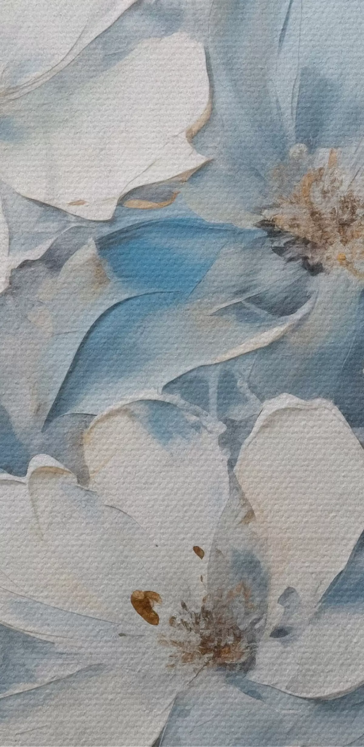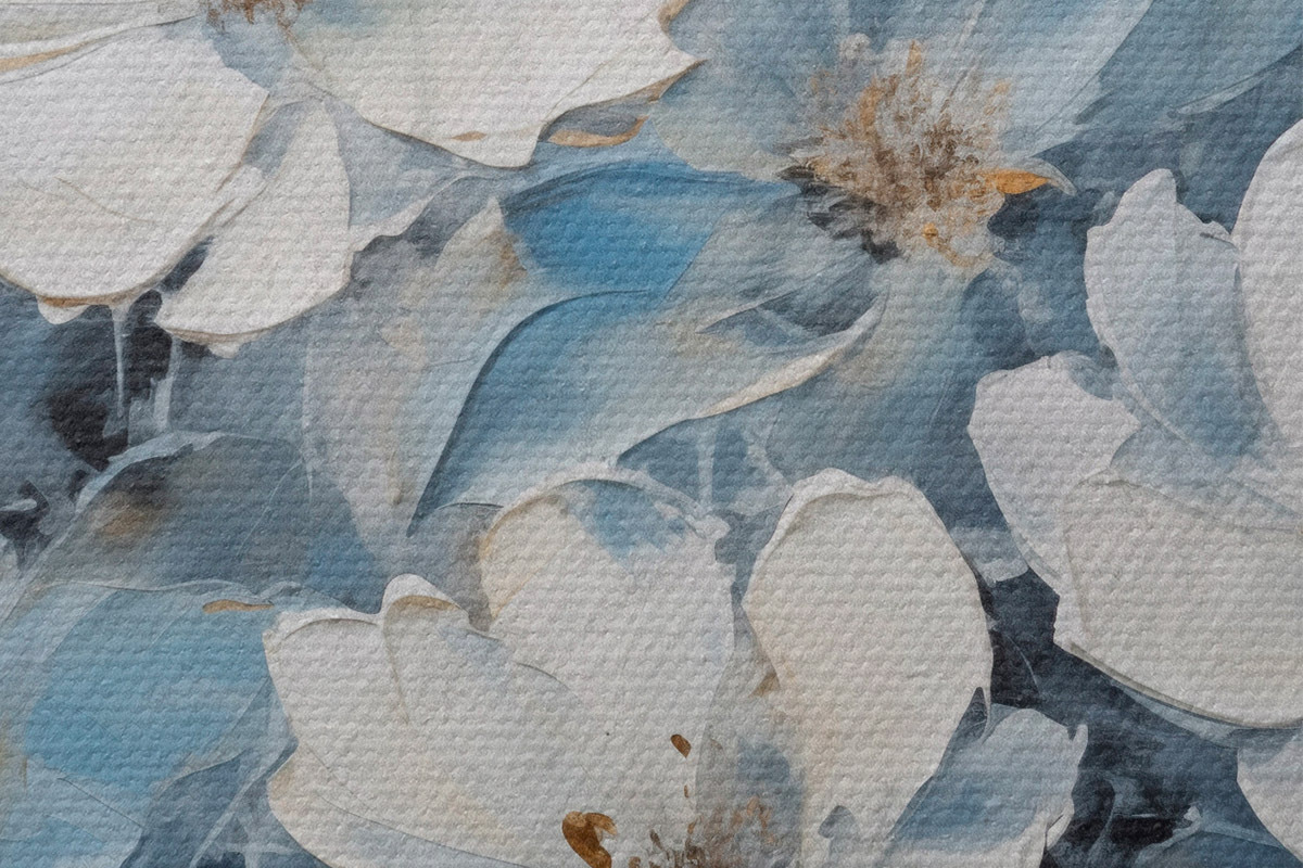 Bild Weiße Blumen mit blauen Blättern, auf einem hellbeigen Hintergrund, mit sichtbaren Pinselstrichen Nr r44395